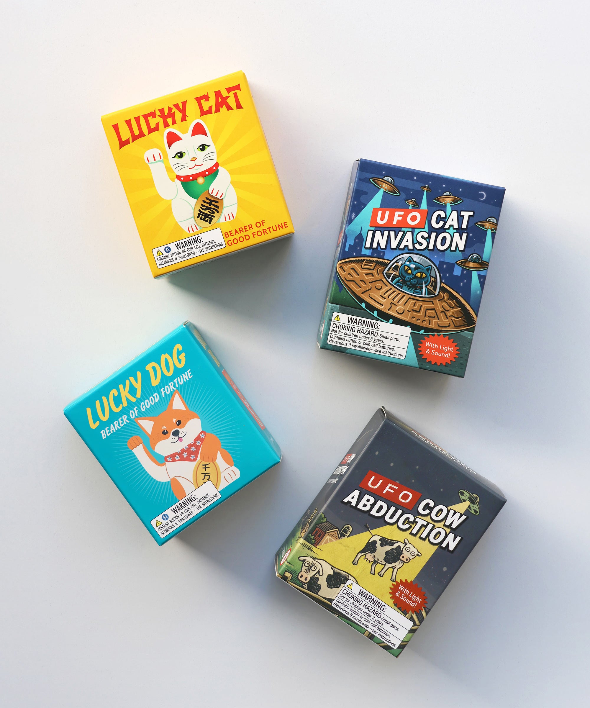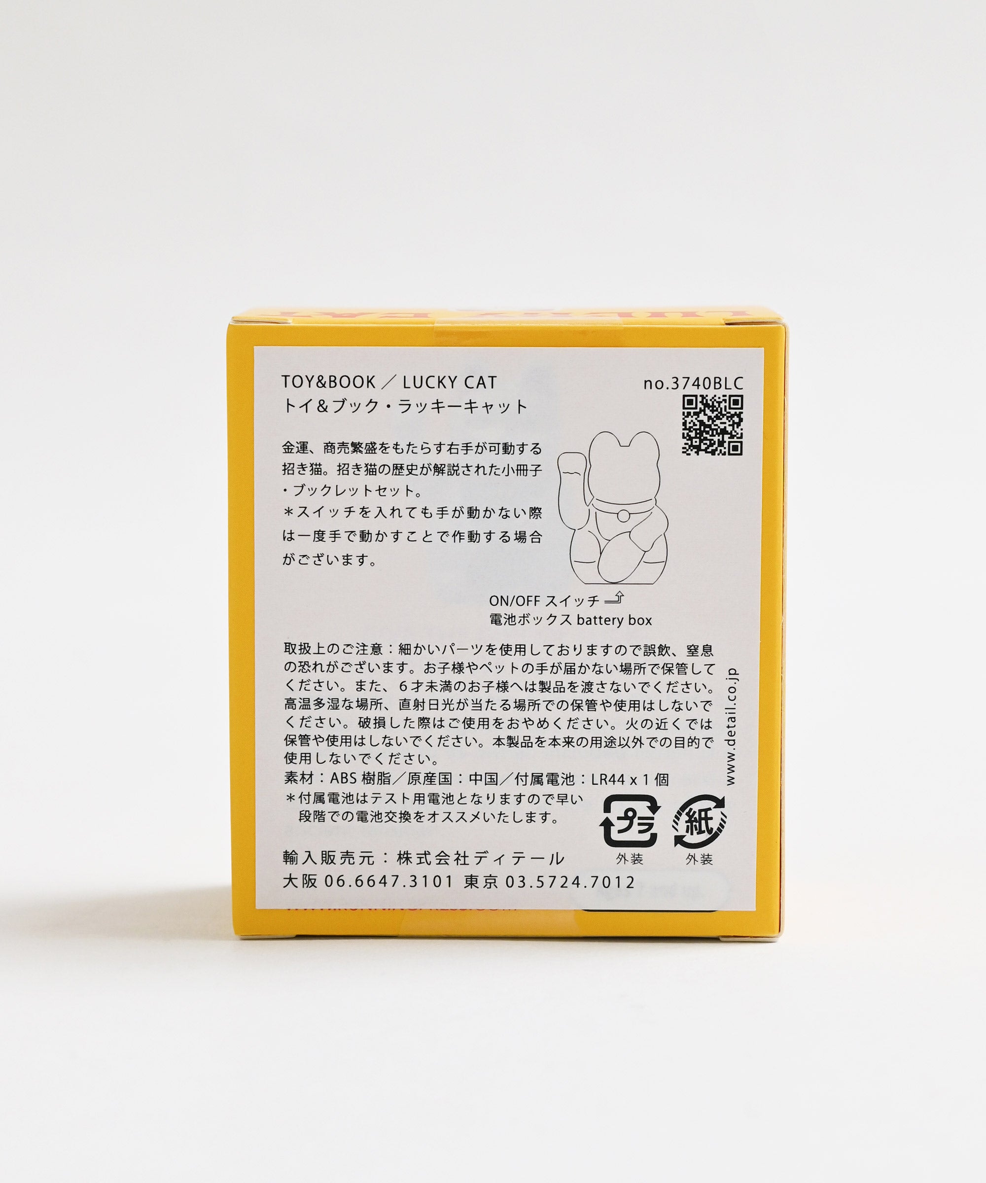 底面のスイッチを入れることで右手が可動する招き猫フィギュアと、招き猫の起源や逸話、右手を上げる意味などをわかりやすく解説した図解入りブックレットのセット。眺めて楽しく、知って縁起の良い、日本の伝統モチーフです。