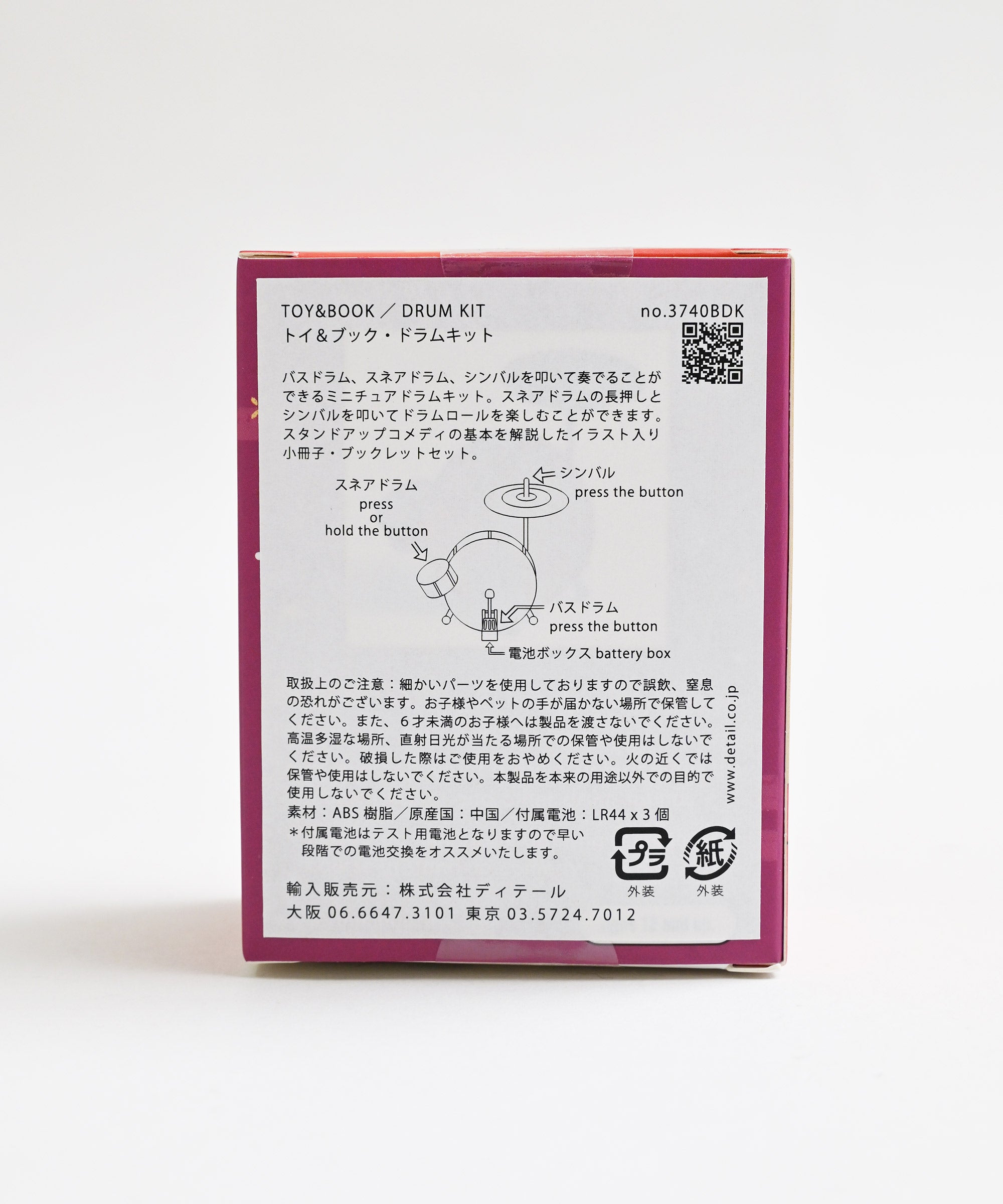 スタンドアップコメディの基本を解説した、フルカラーのイラスト入りブックレット付き。ミニチュアながら本格的なリズム体験を味わえるアイテムです。