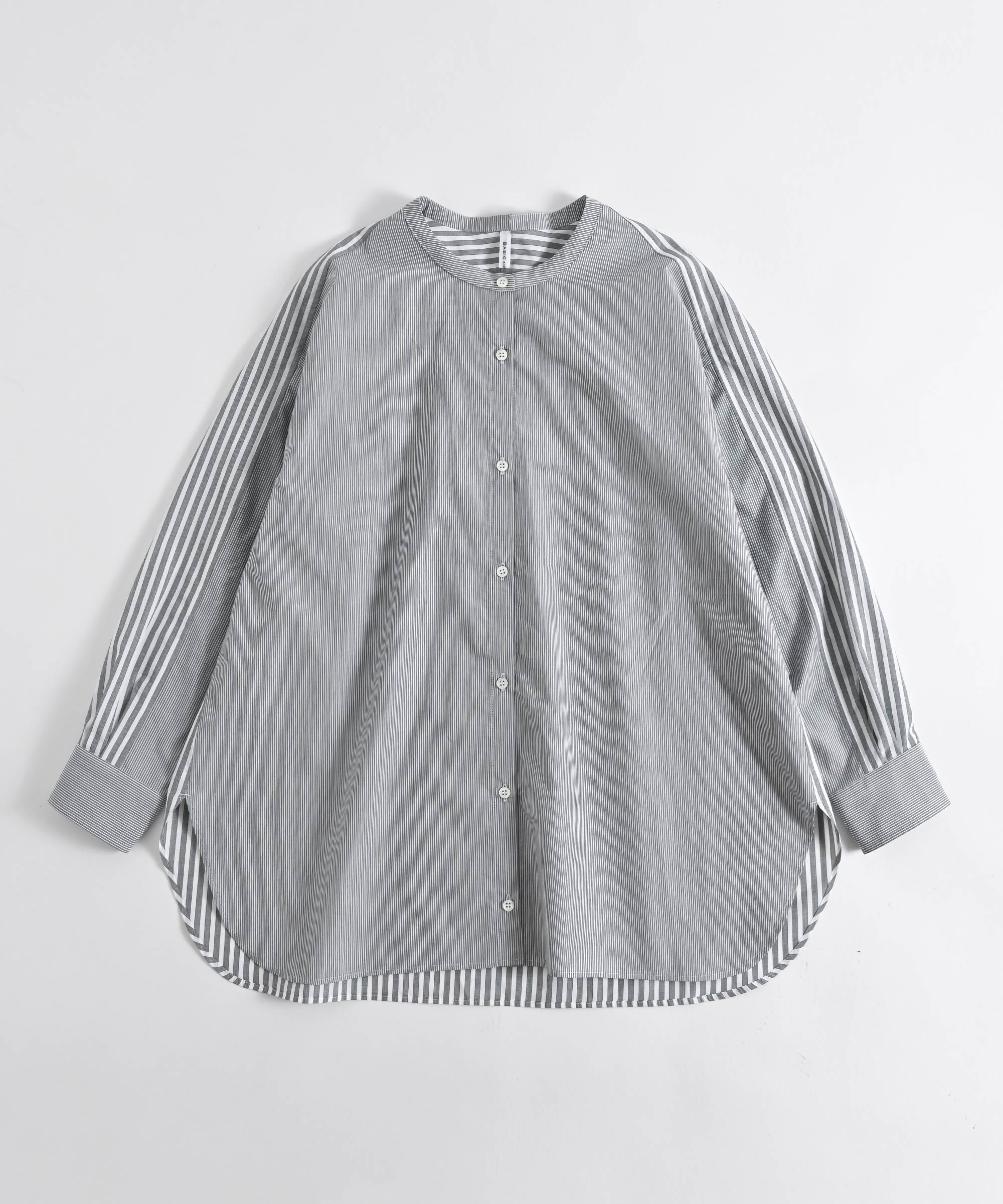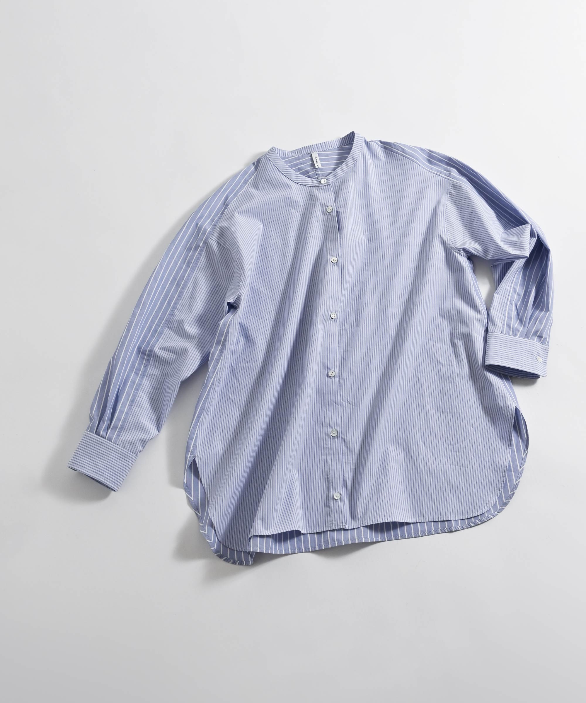 ストライプ生地を組み合わせたデザインのミドル丈シャツ。