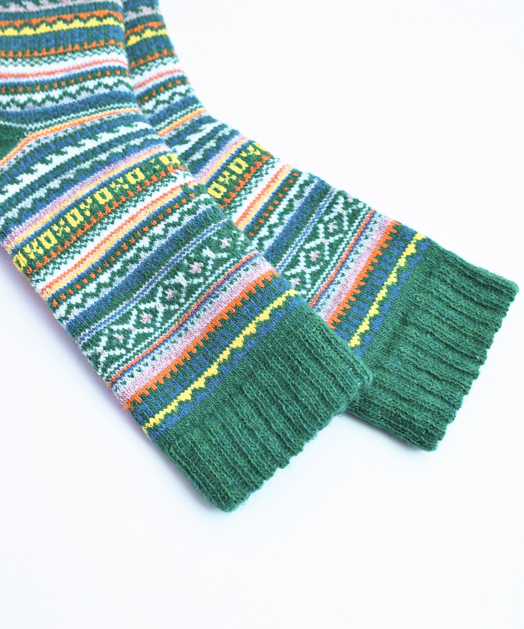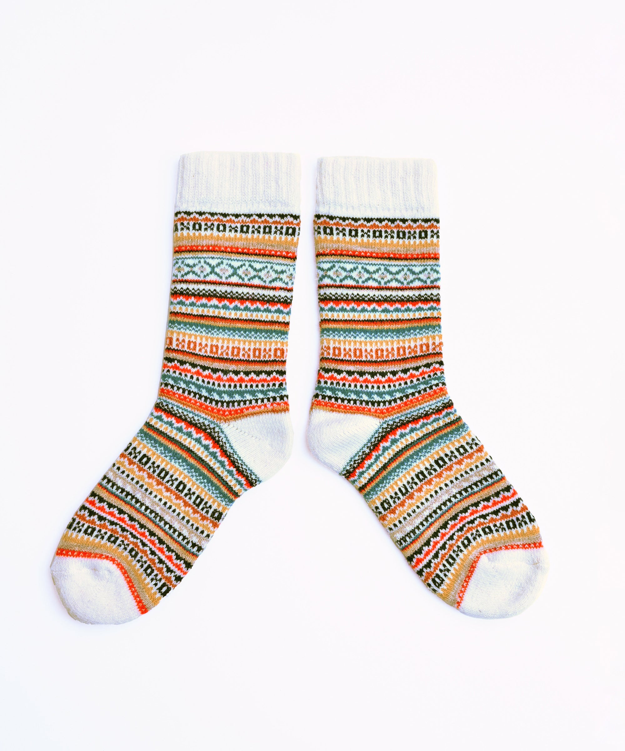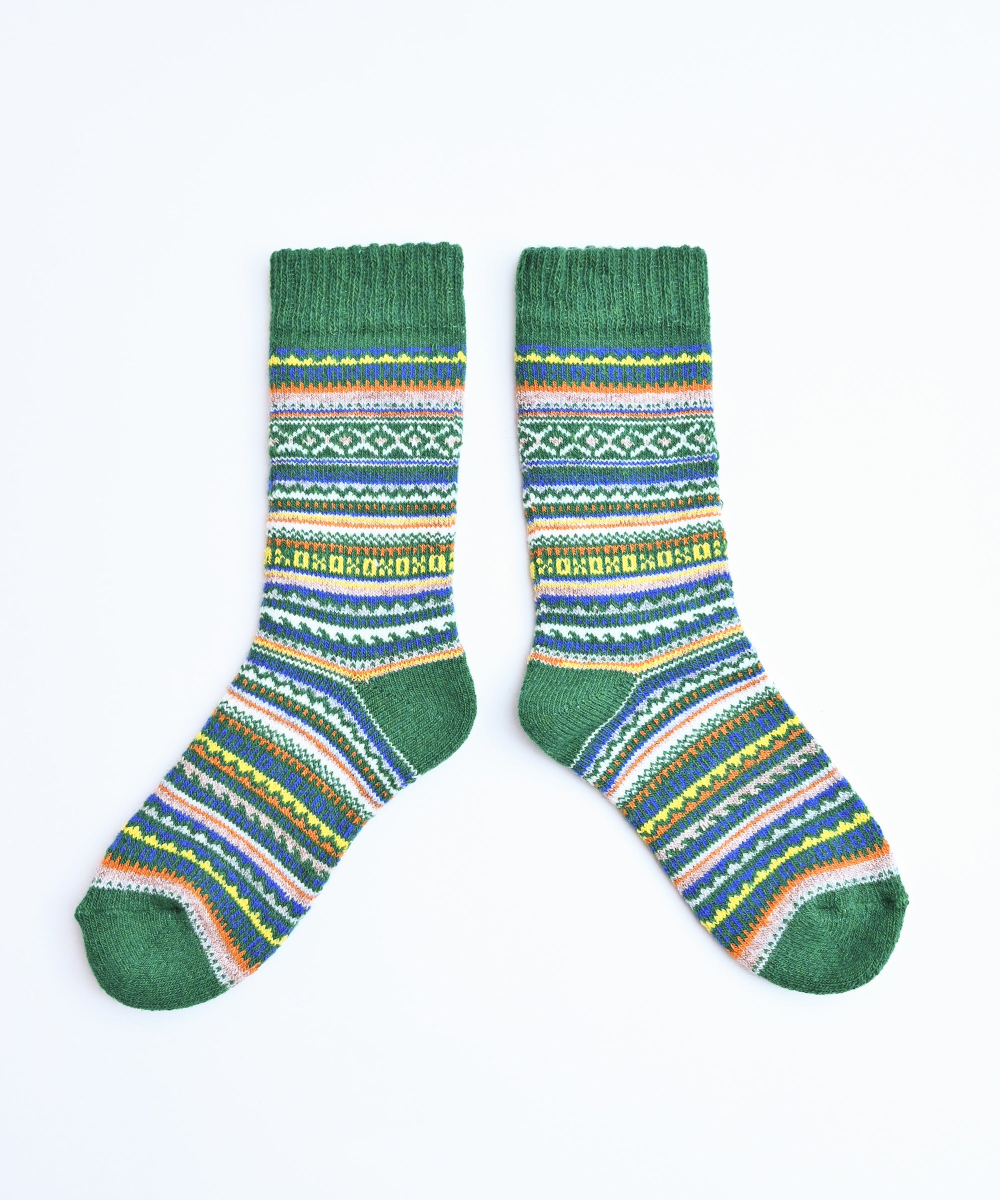 ウール混で暖かく、あたたかな雰囲気のノルディック柄がポイントに。程よく肉厚なのでアウトドア用やルームソックスとしても。