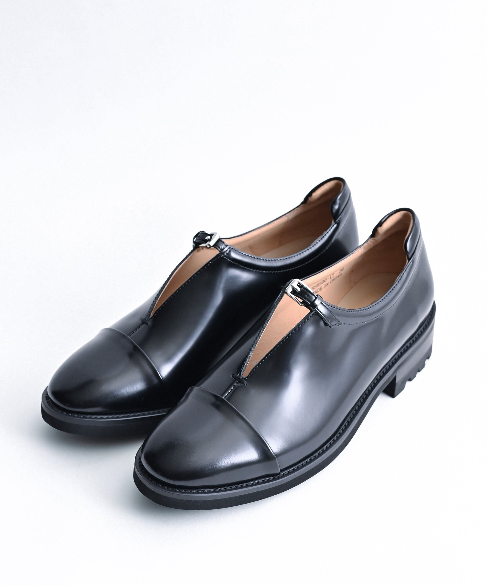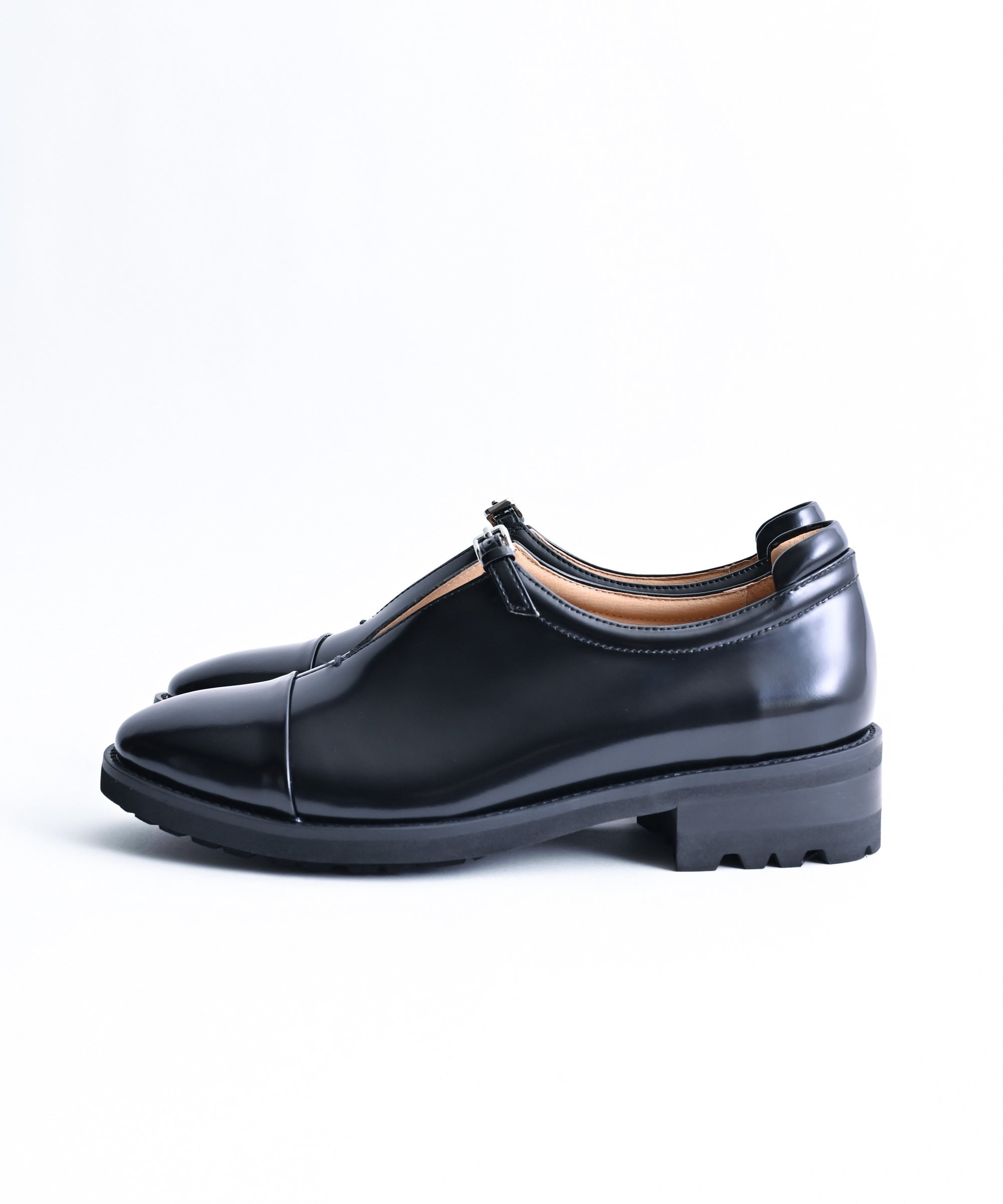 品のあるクラシックな印象ながら、かかとが一段上がっている少し捻りのあるルックスです。