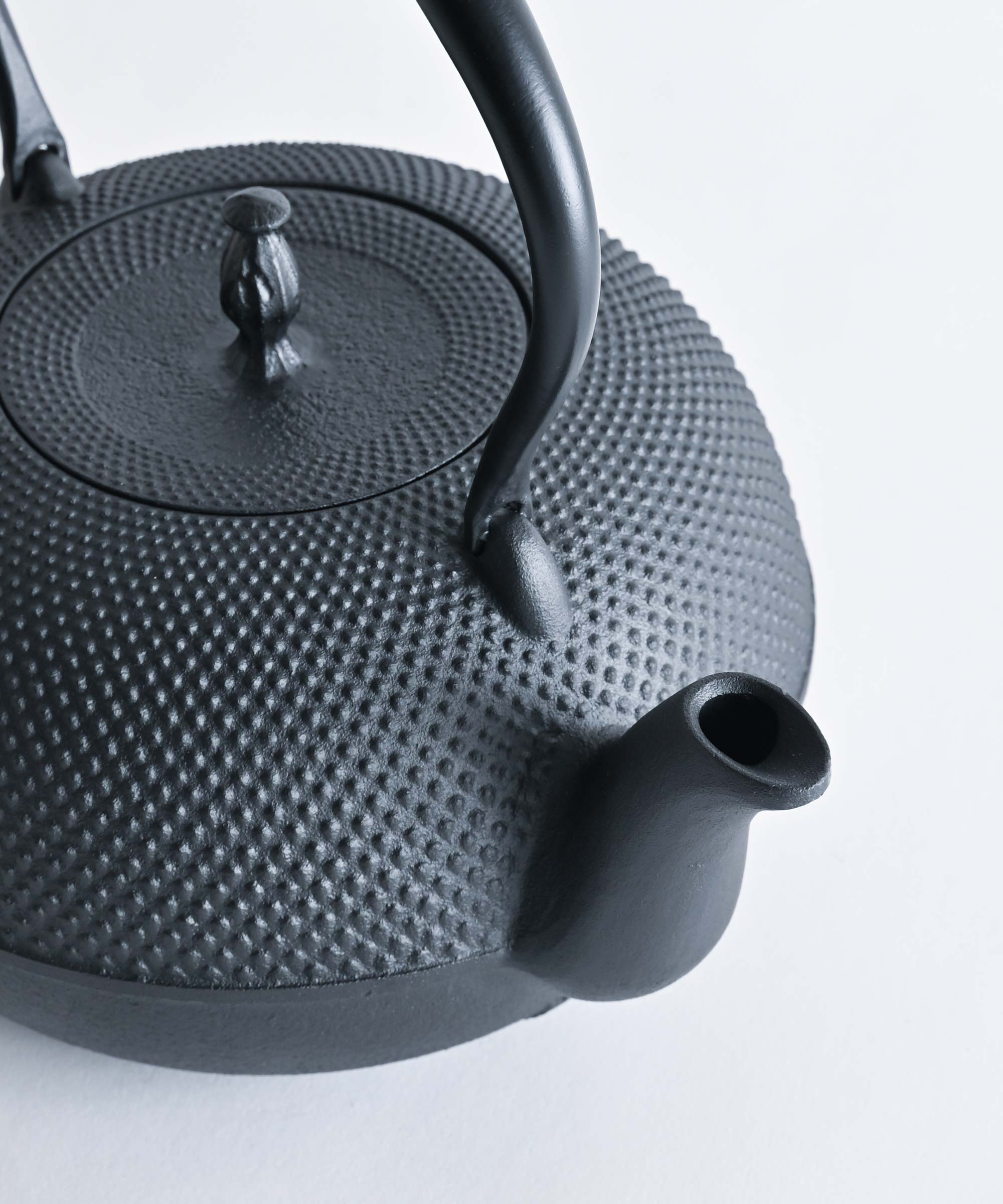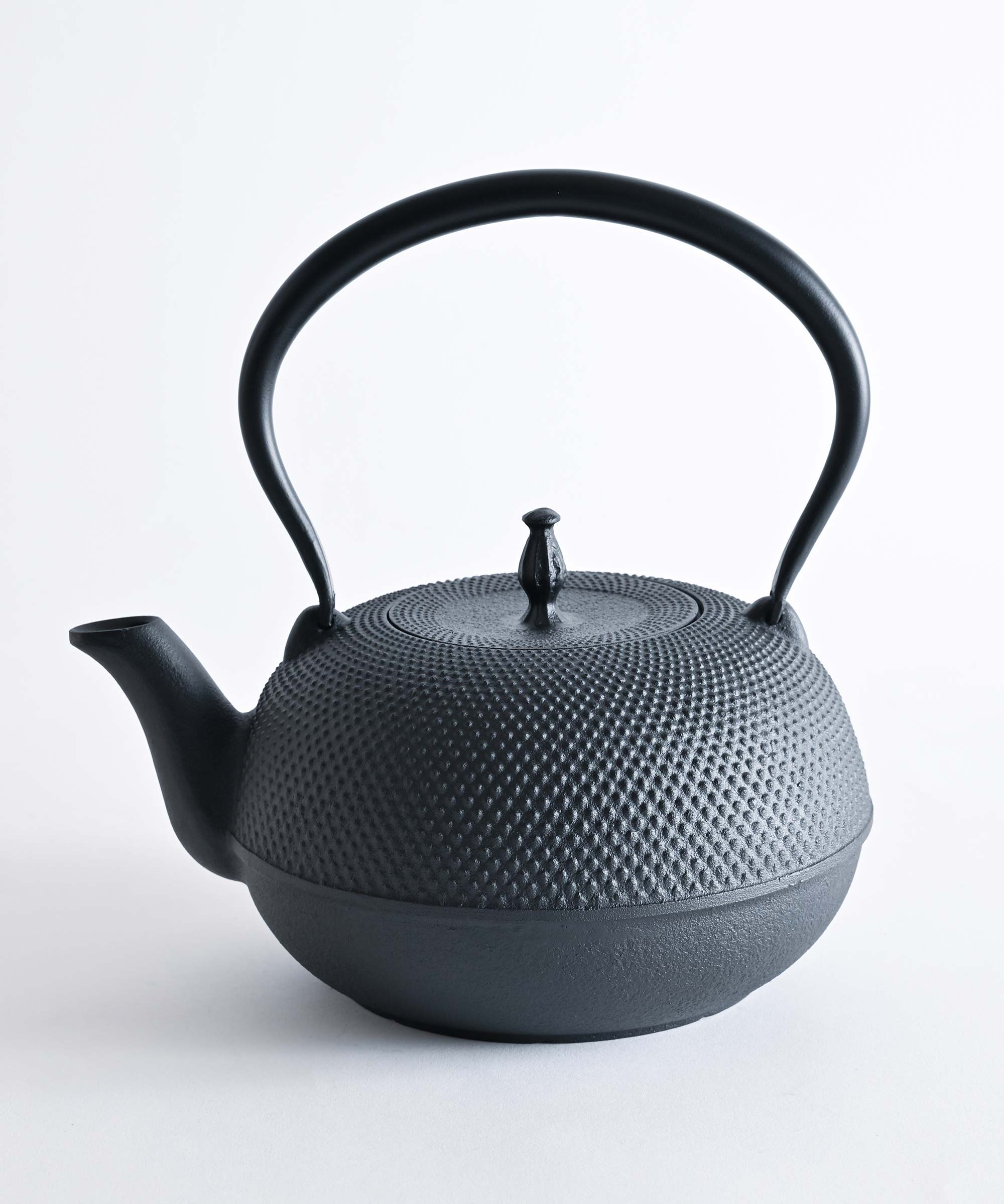 南部鉄瓶の伝統模様「アラレ」があしらわれた、代表的なデザインの鉄瓶。