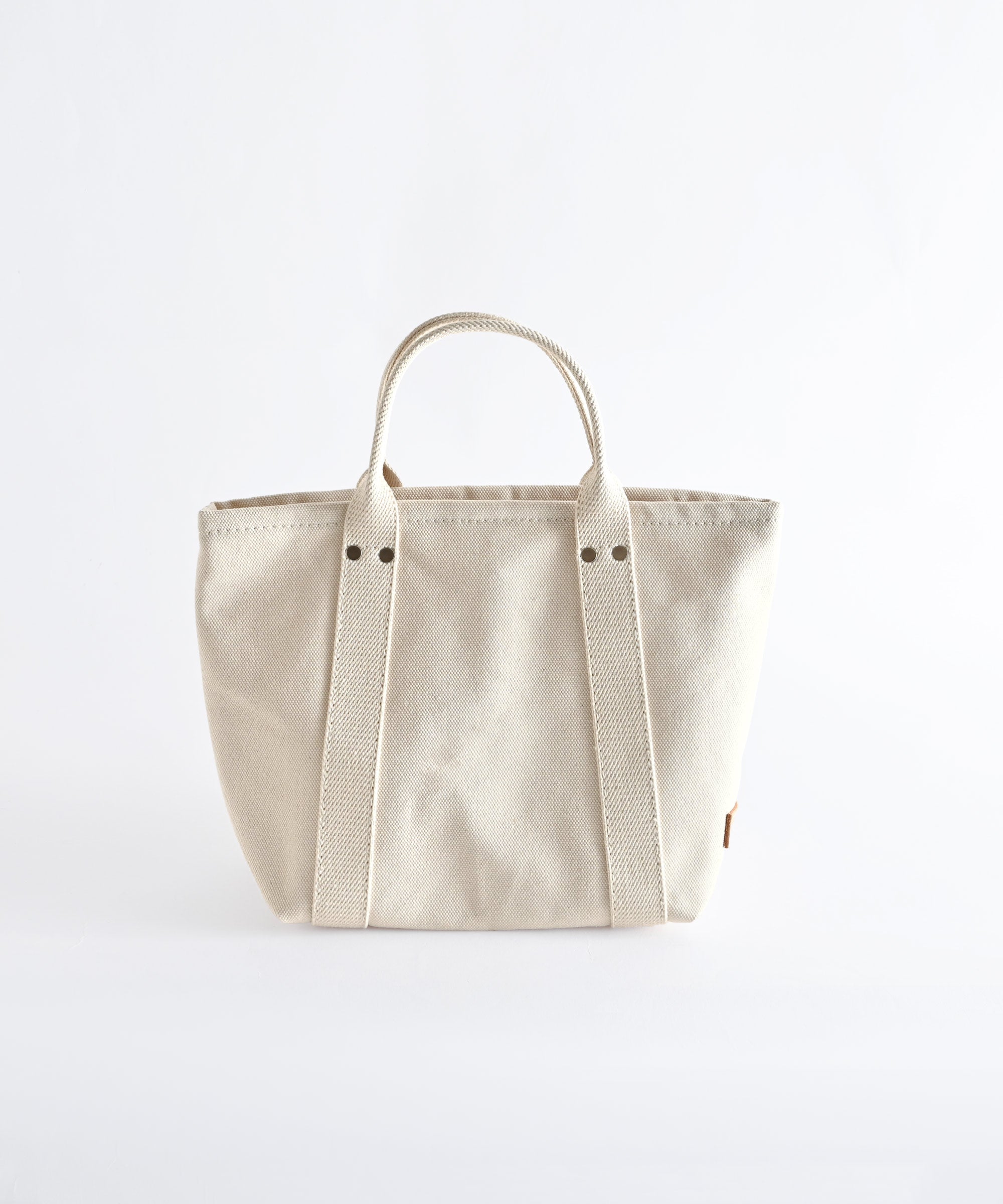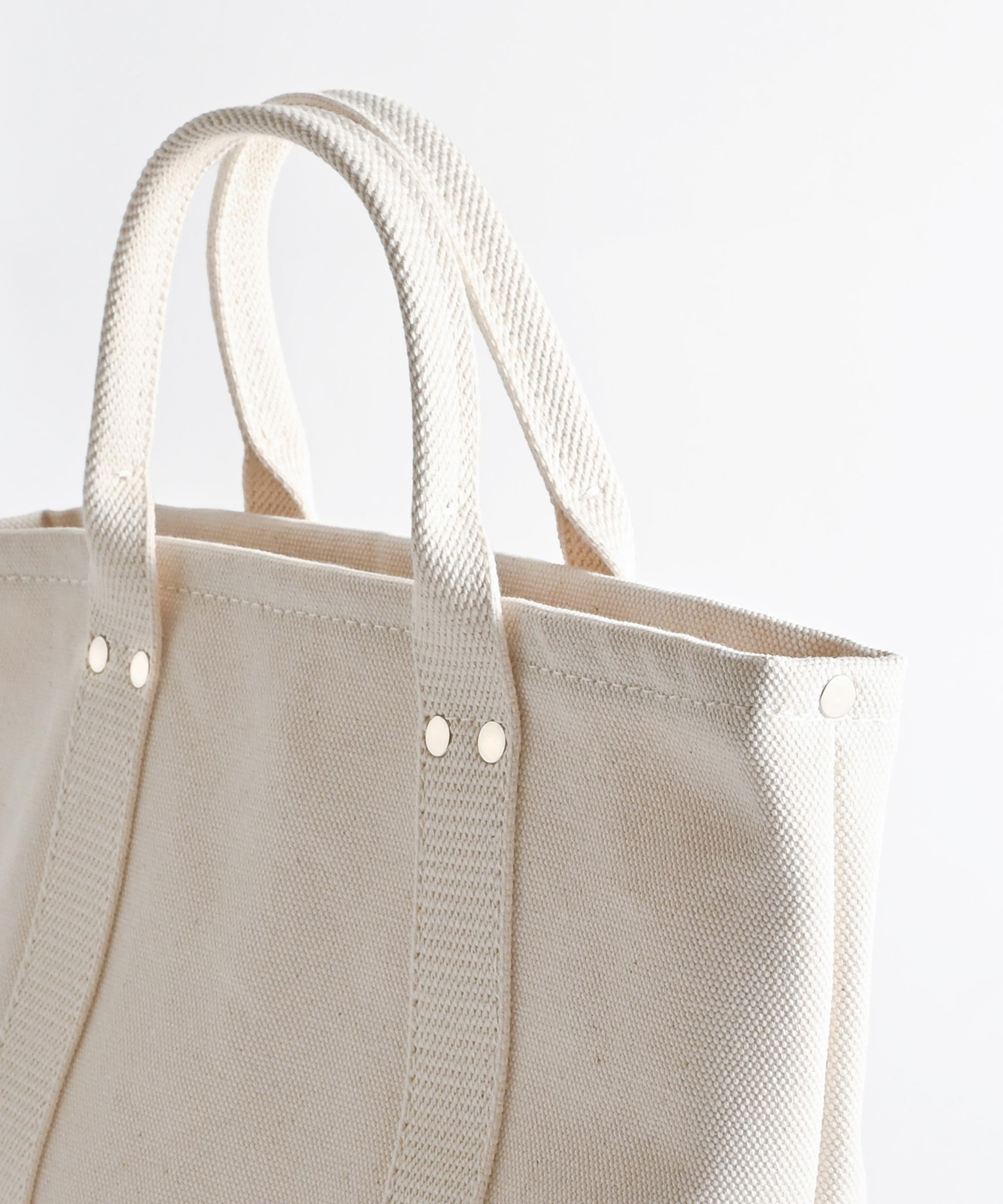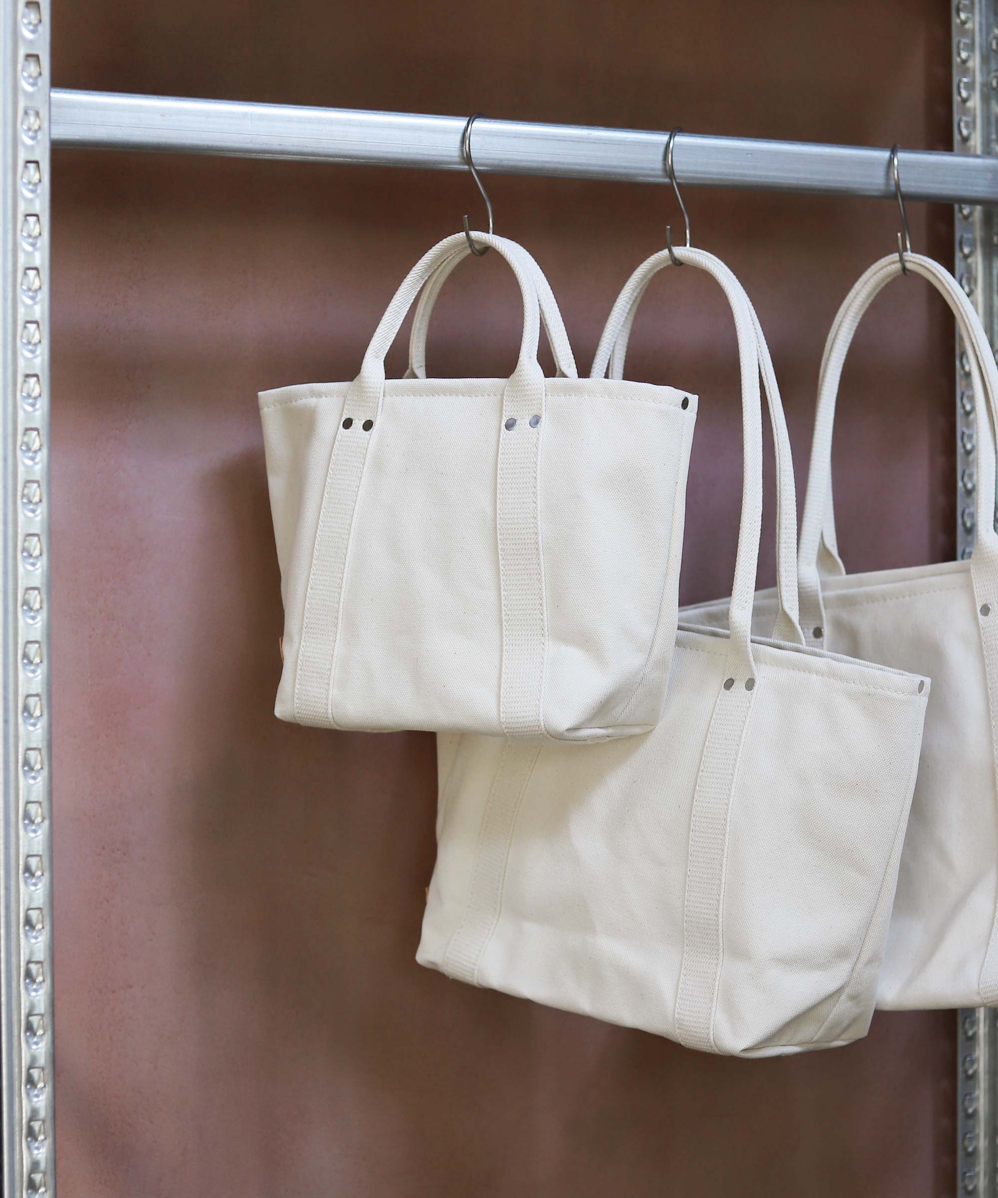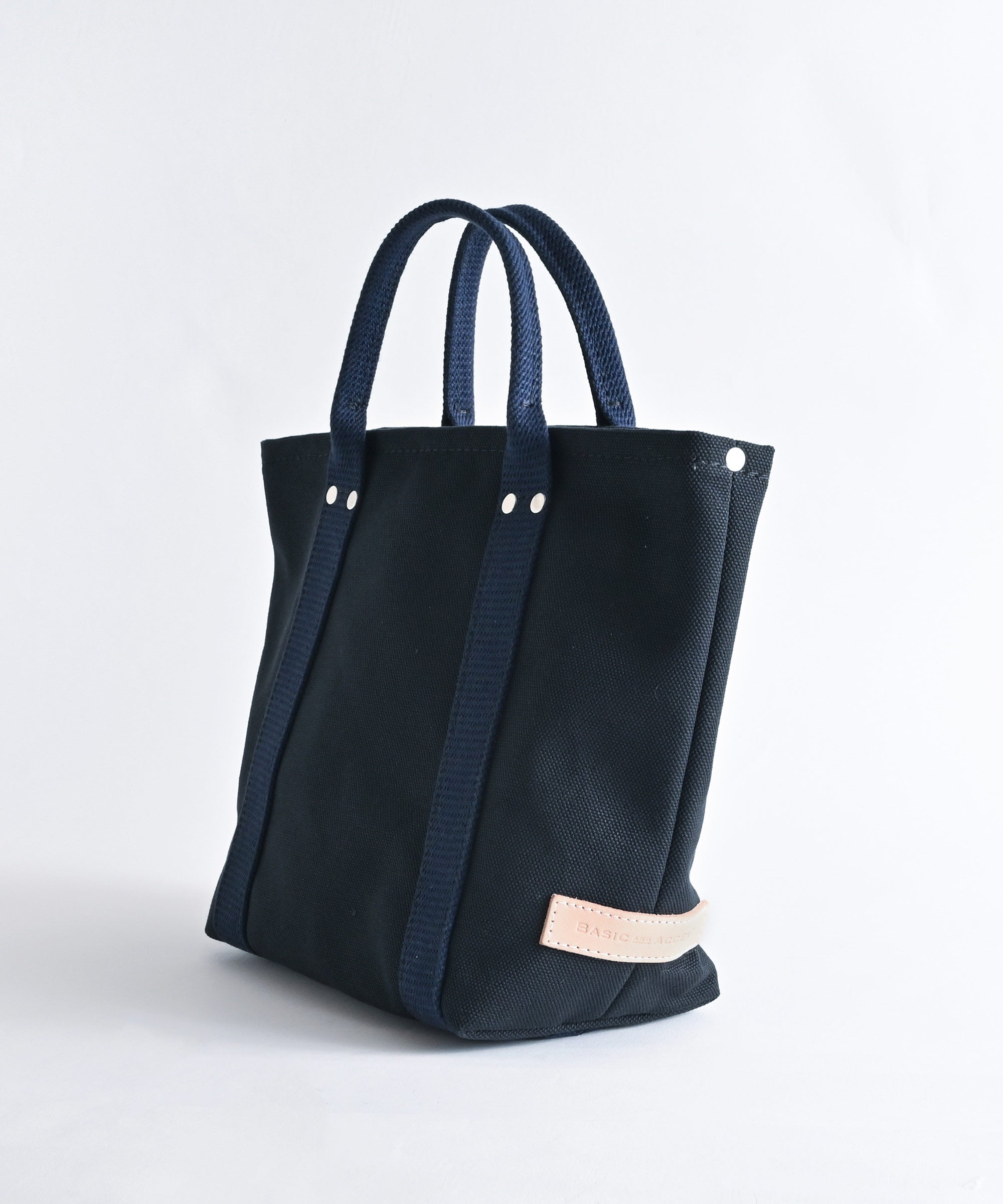 大分の佐藤防水店さんに作っていただいているオリジナルのトートバック。国産4号帆布を使用したしっかりとした素材感。持ち手にはG.Iベルトに使われるテープを使用し、栃木レザーにBASIC AND ACCENTのロゴをエンボス加工したネームタグもデザインポイント。M/Lサイズもあります。