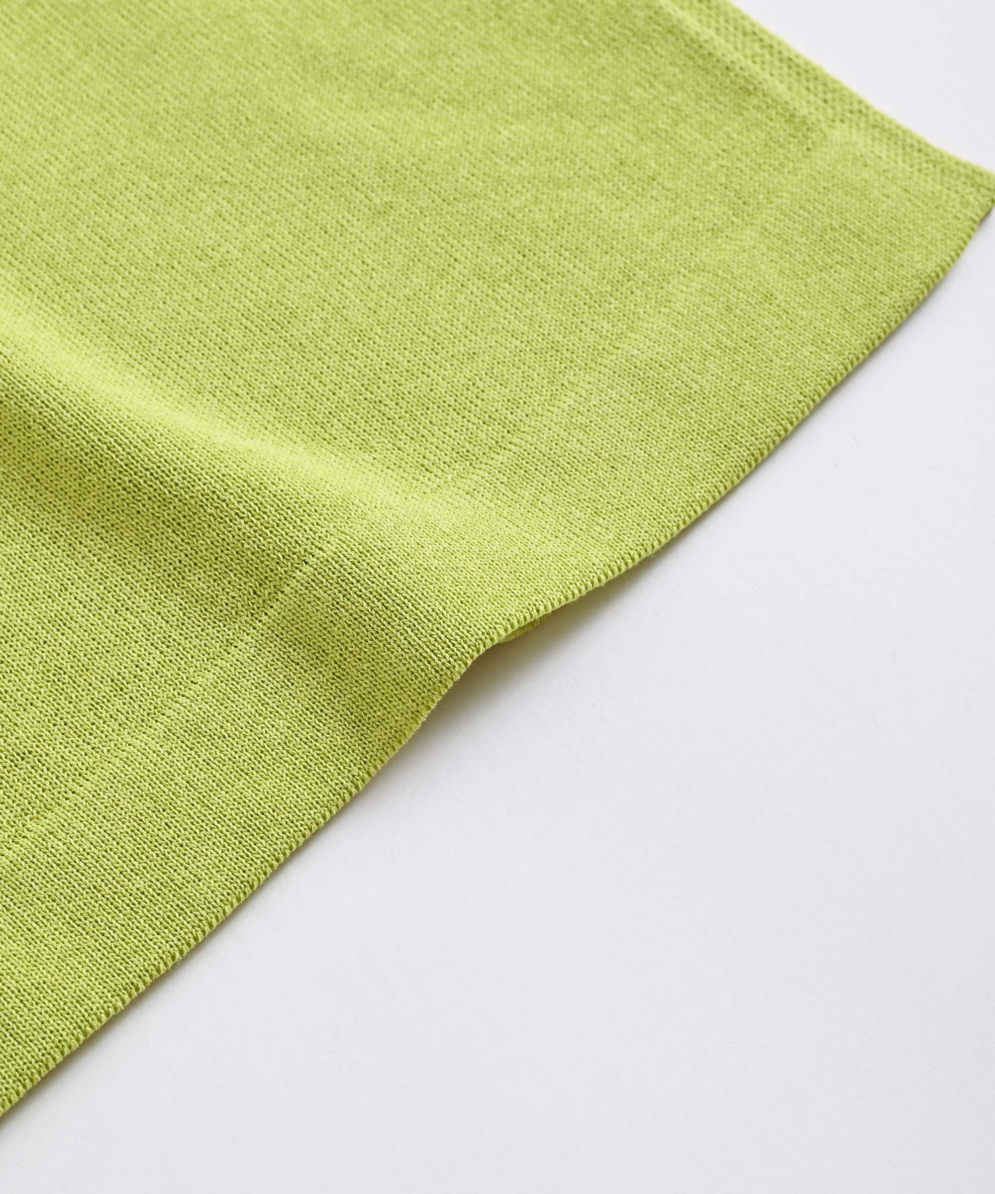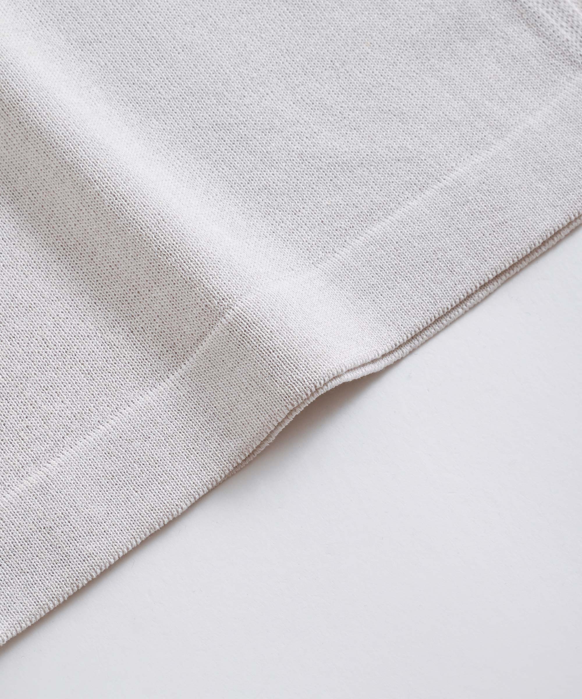 綿のソフトでしなやかな風合いに、麻の清涼感、ポリエステルの光沢感とシャープなタッチを兼ね備えた糸で編立ています。