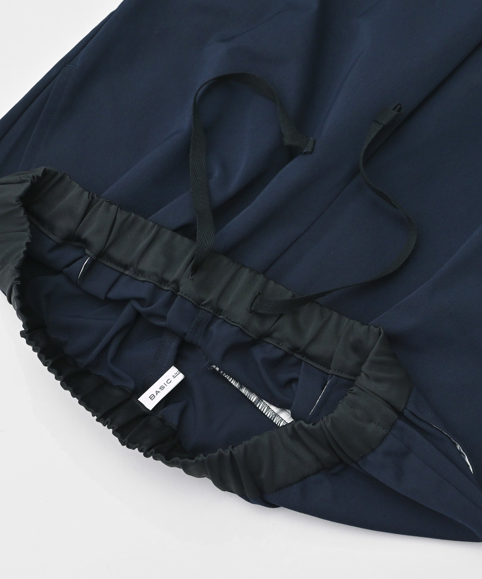 速乾性と、シワになりにくい特殊なポリエステル糸の為、程よいストレッチ性が特徴。着用により膝が出るといった伸び垂れのしにくい素材です。