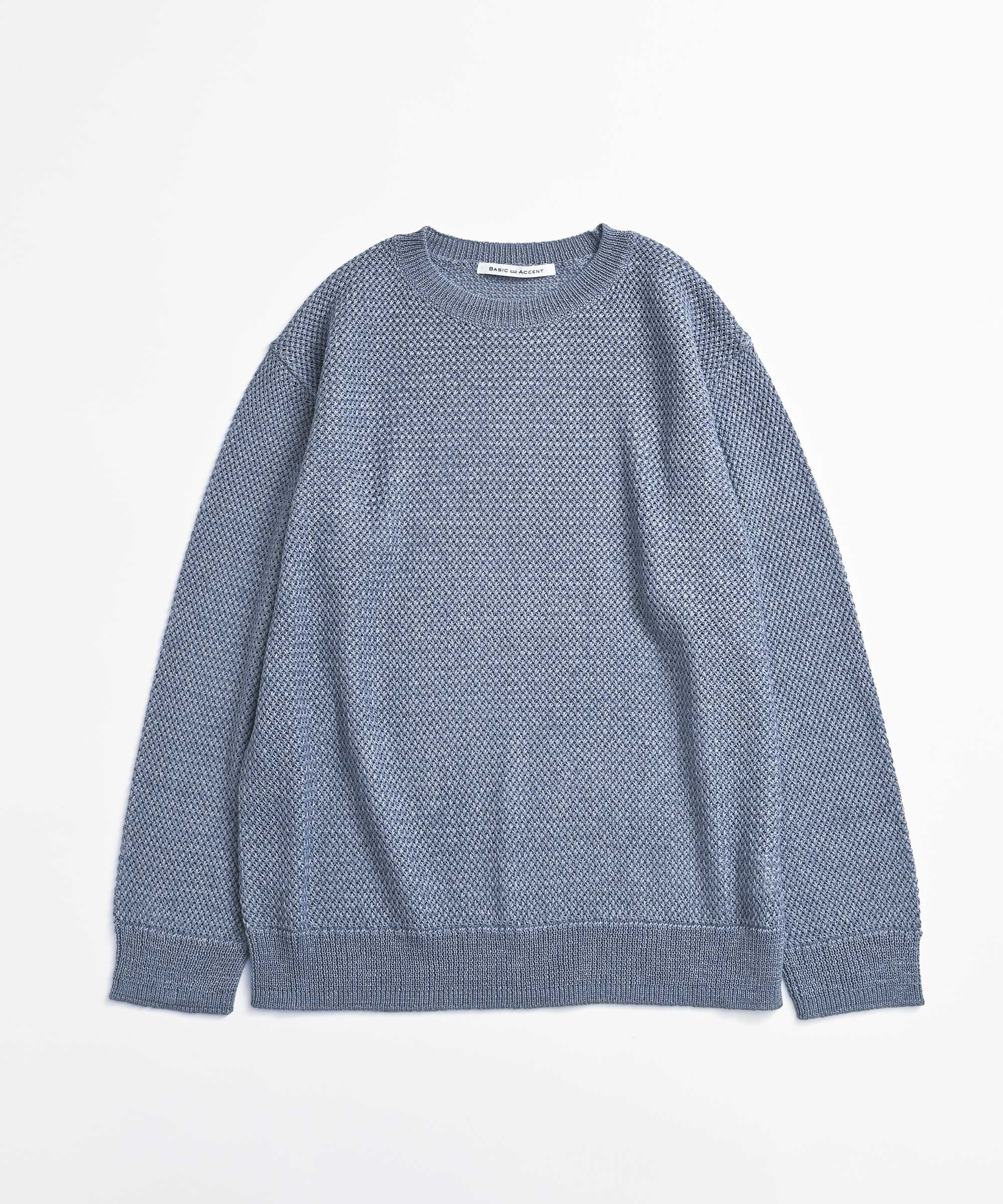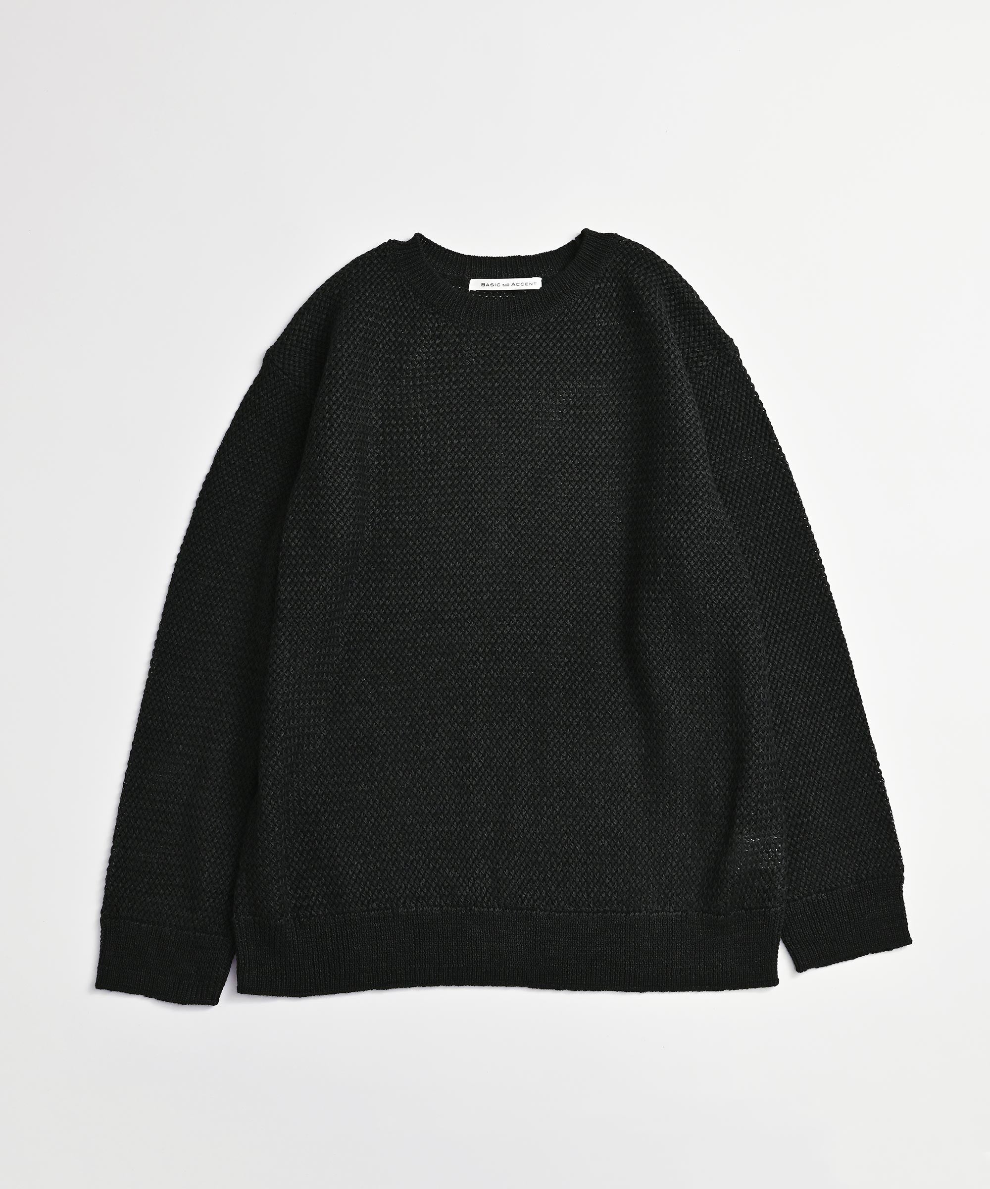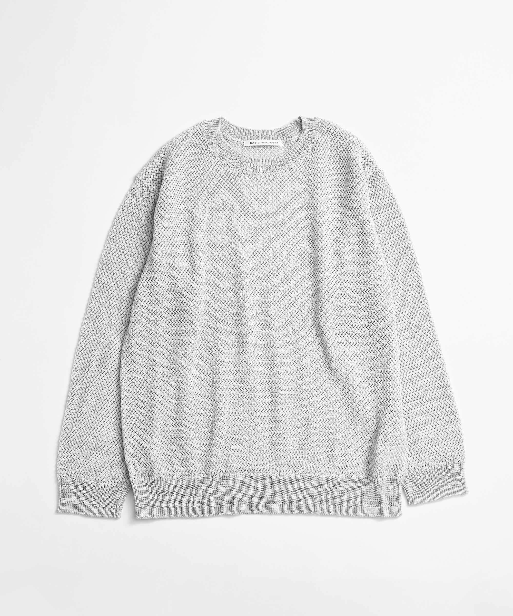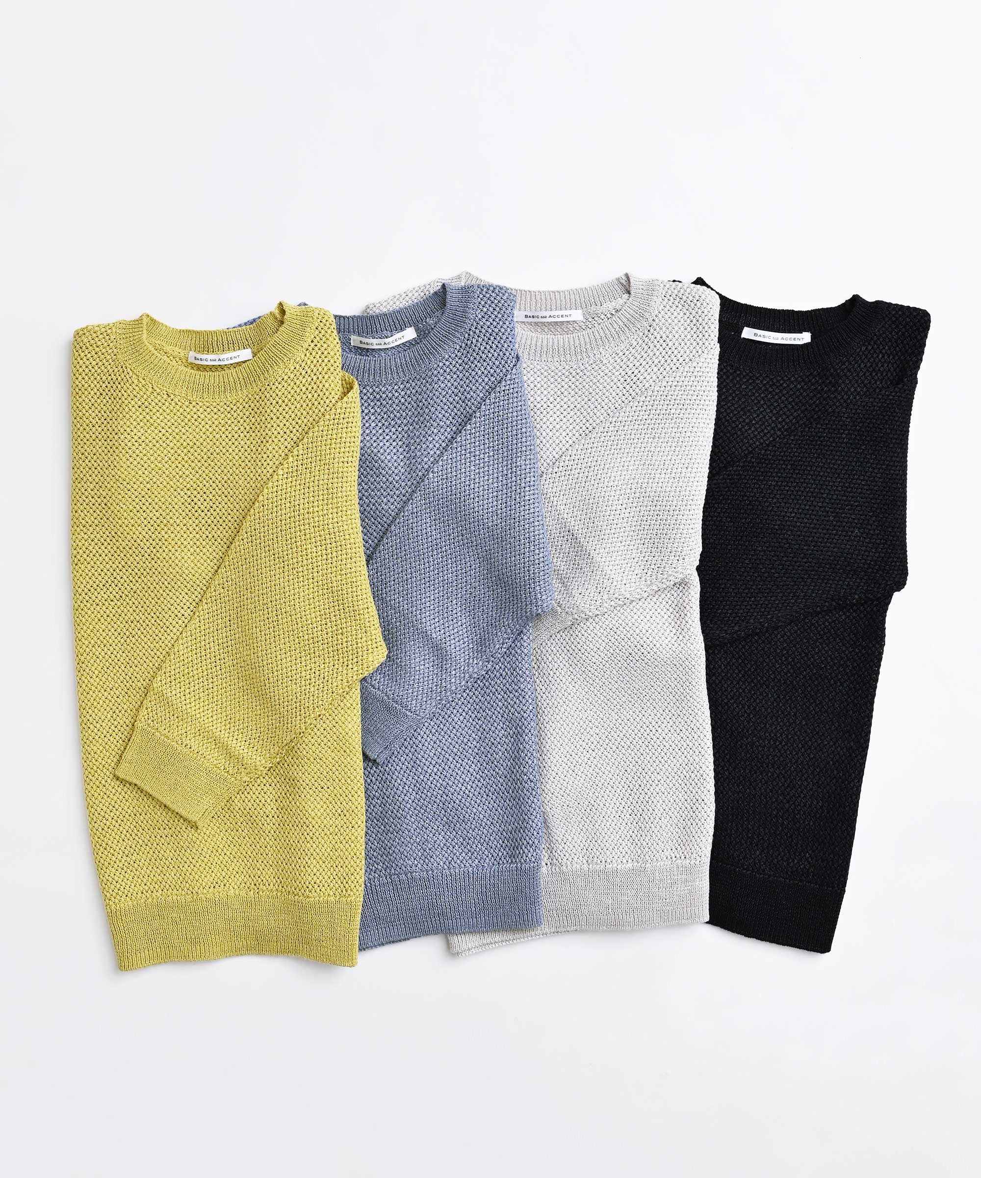 ギマ(麻のような風合いに加工し仕上げた糸)をフラットになるよう撚った糸を、バスケットの編み目のように編い込んだ編み目が特徴のシリーズです。