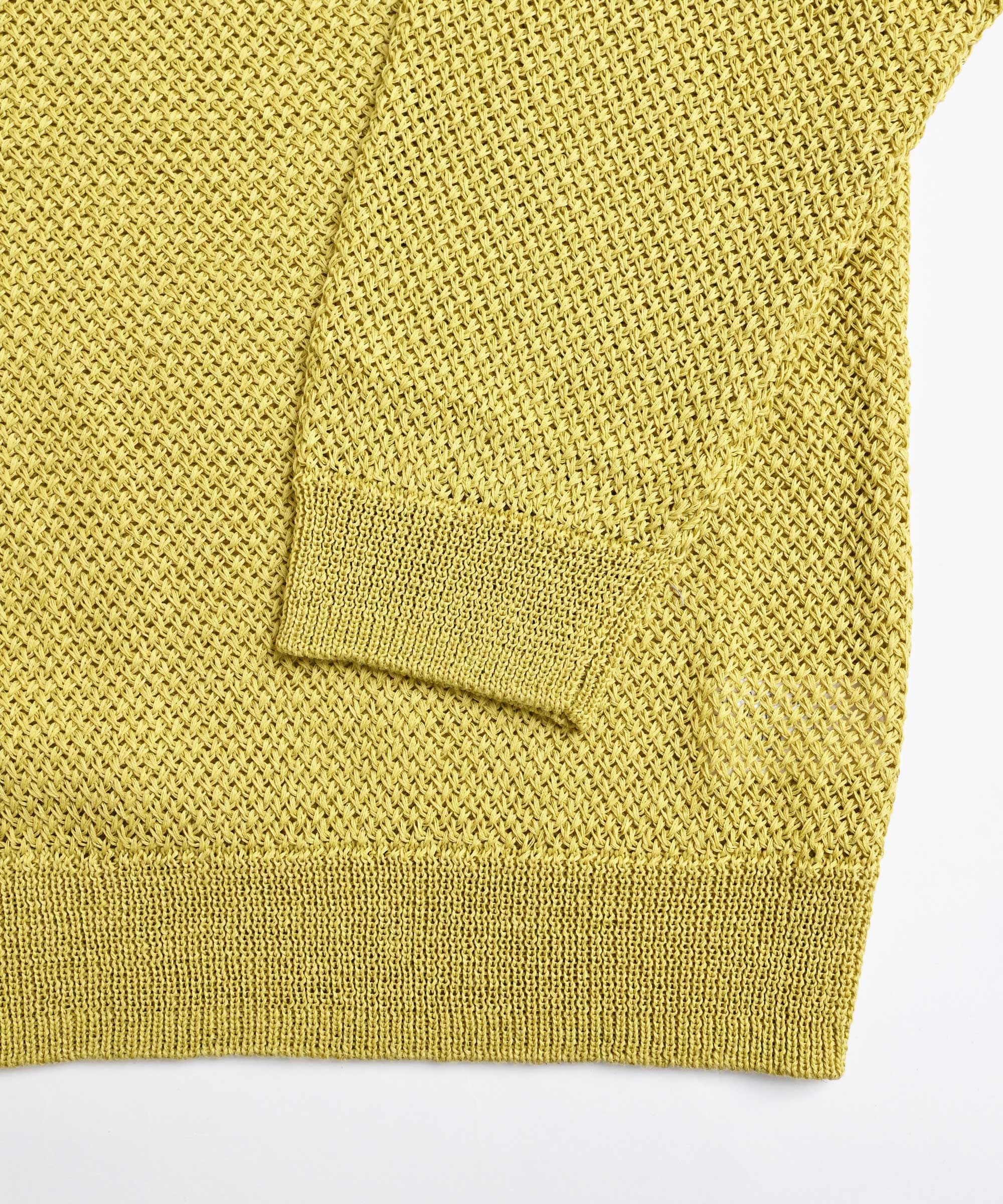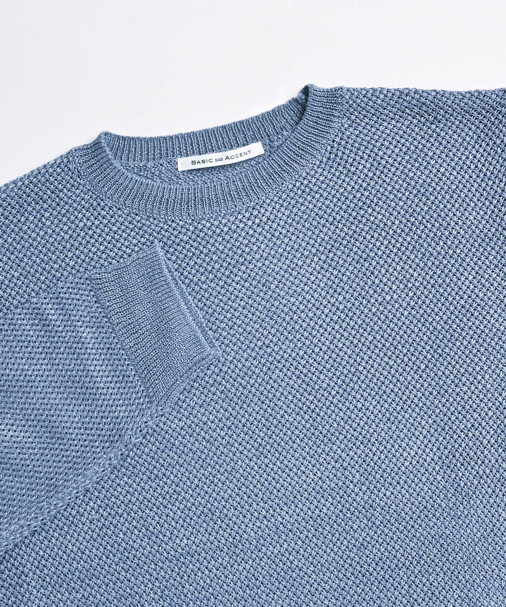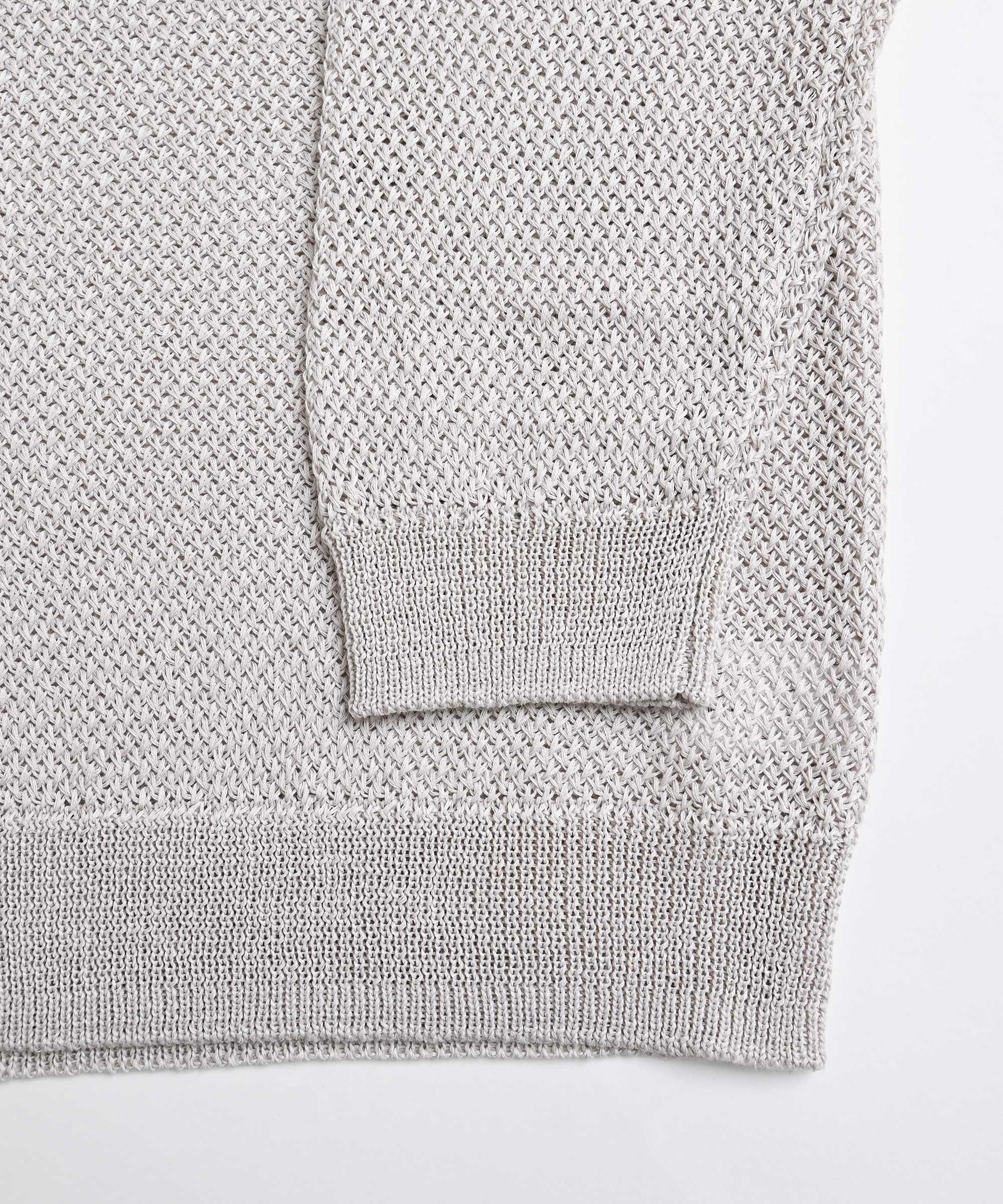 ギマ(麻のような風合いに加工し仕上げた糸)をフラットになるよう撚った糸を、バスケットの編み目のように編い込んだ編み目が特徴のシリーズです。