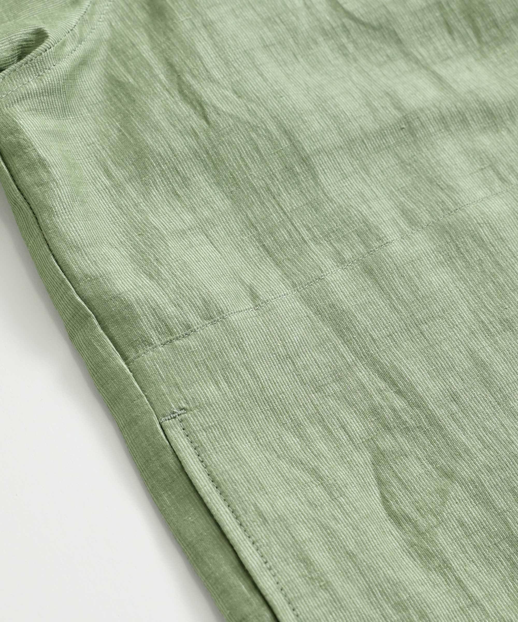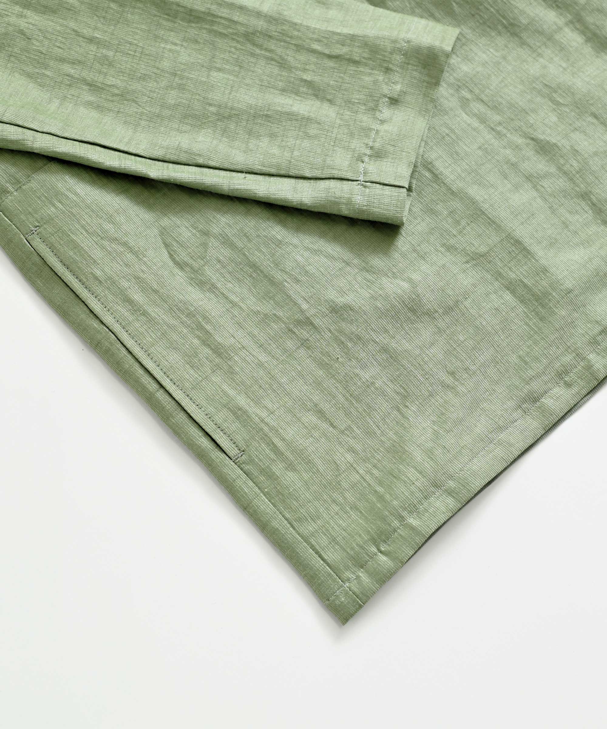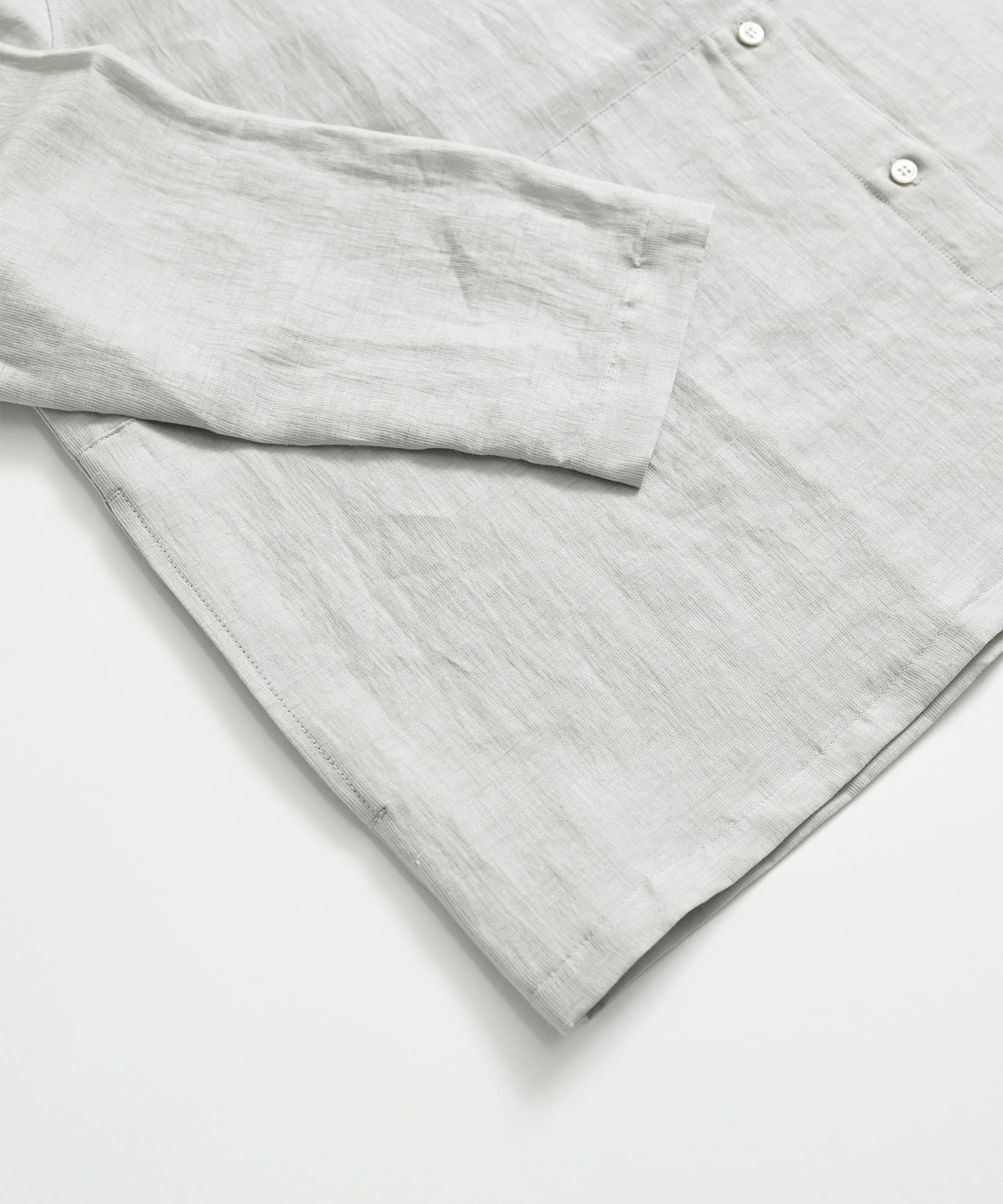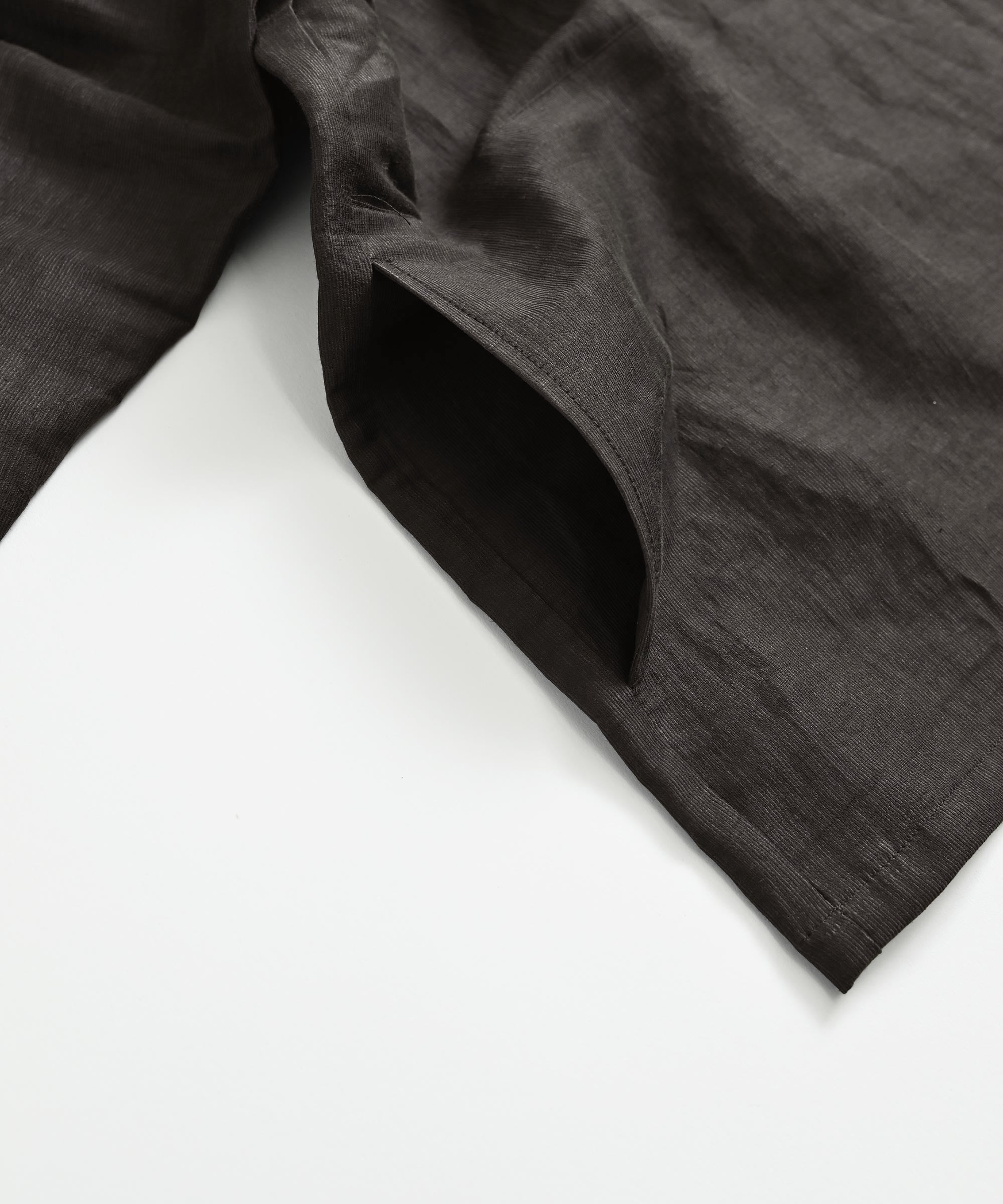 細番手のポリエステルがもたらす上品な光沢に、麻のナチュラルな表面感が重なり、程よいシワ感がこなれた雰囲気を演出。