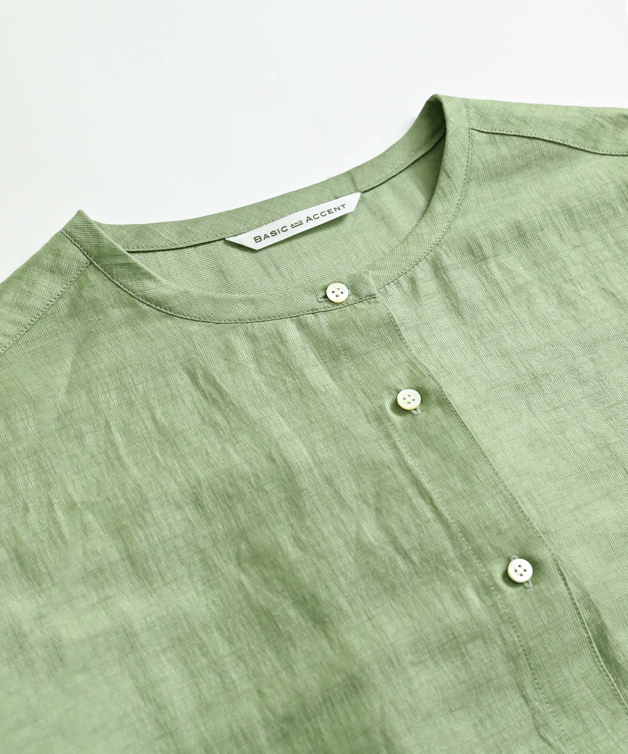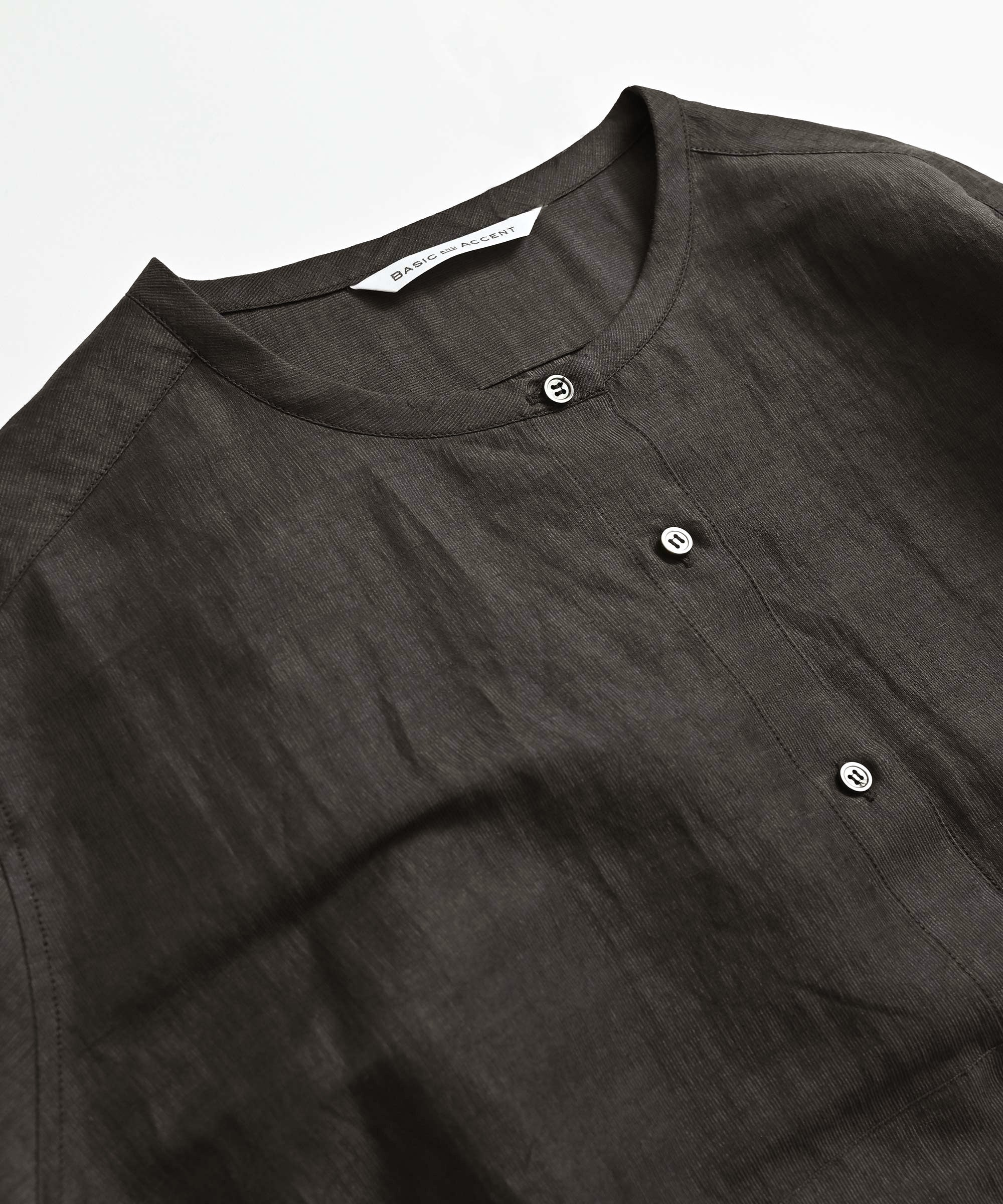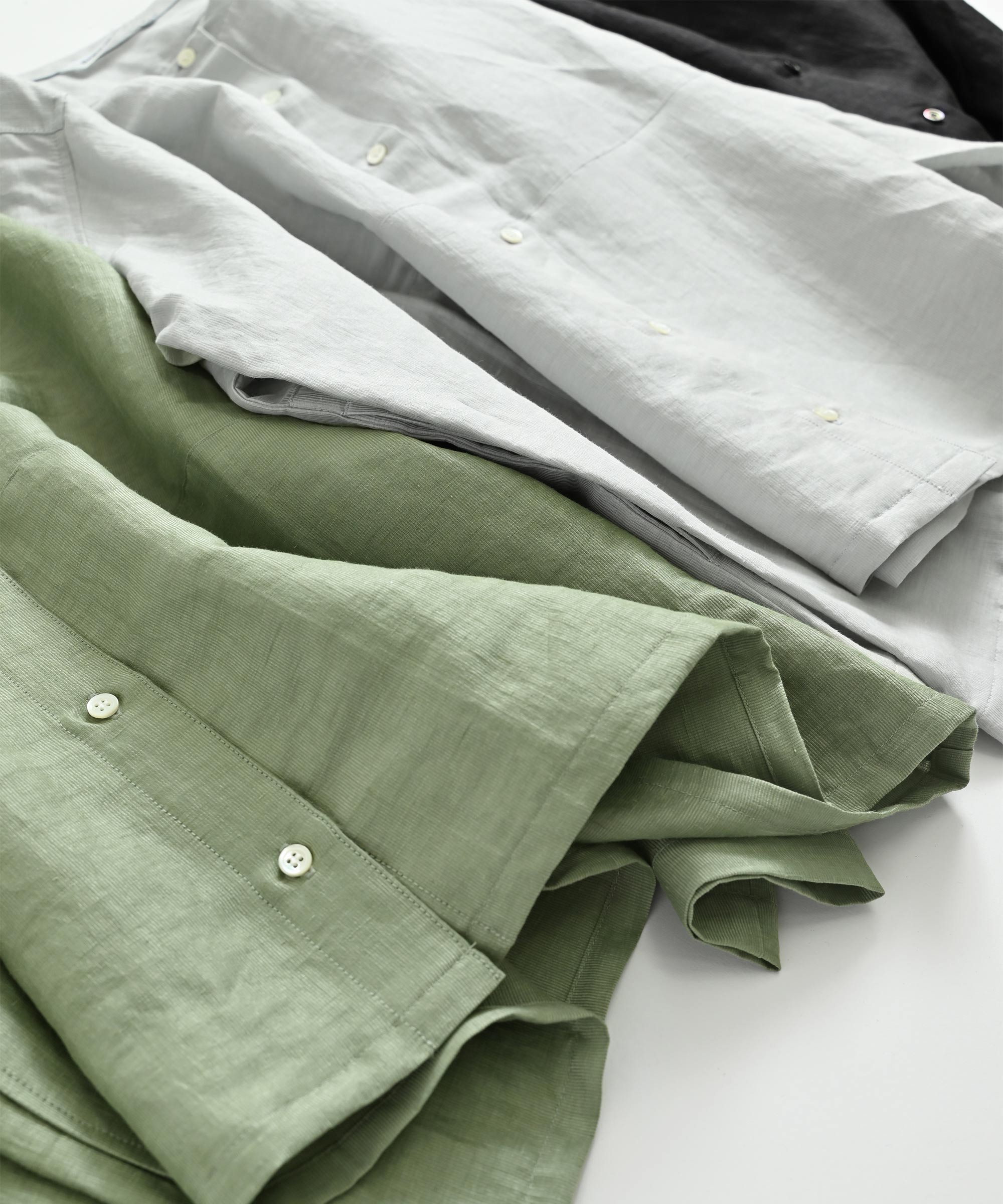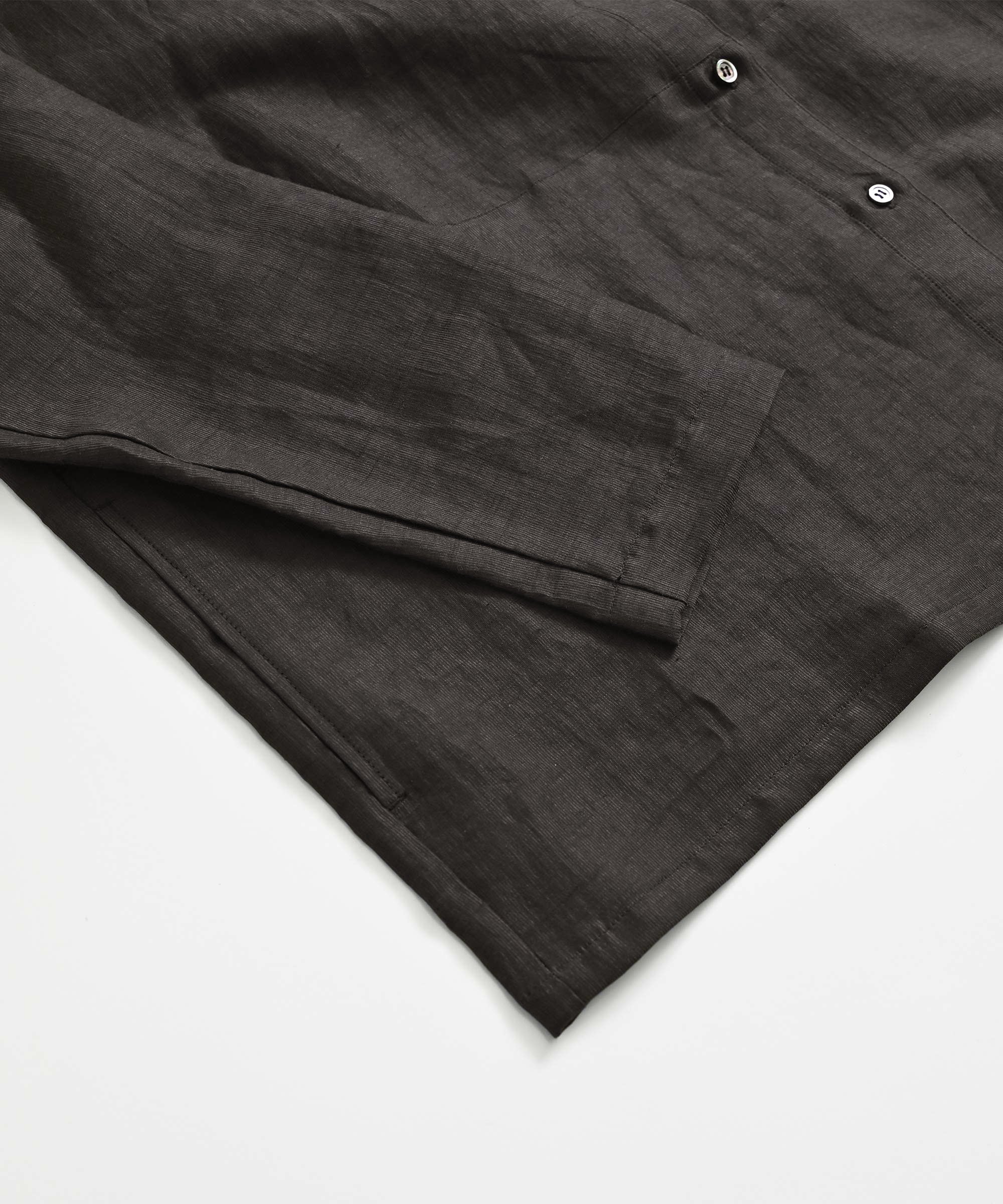 細番手のポリエステルがもたらす上品な光沢に、麻のナチュラルな表面感が重なり、程よいシワ感がこなれた雰囲気を演出。