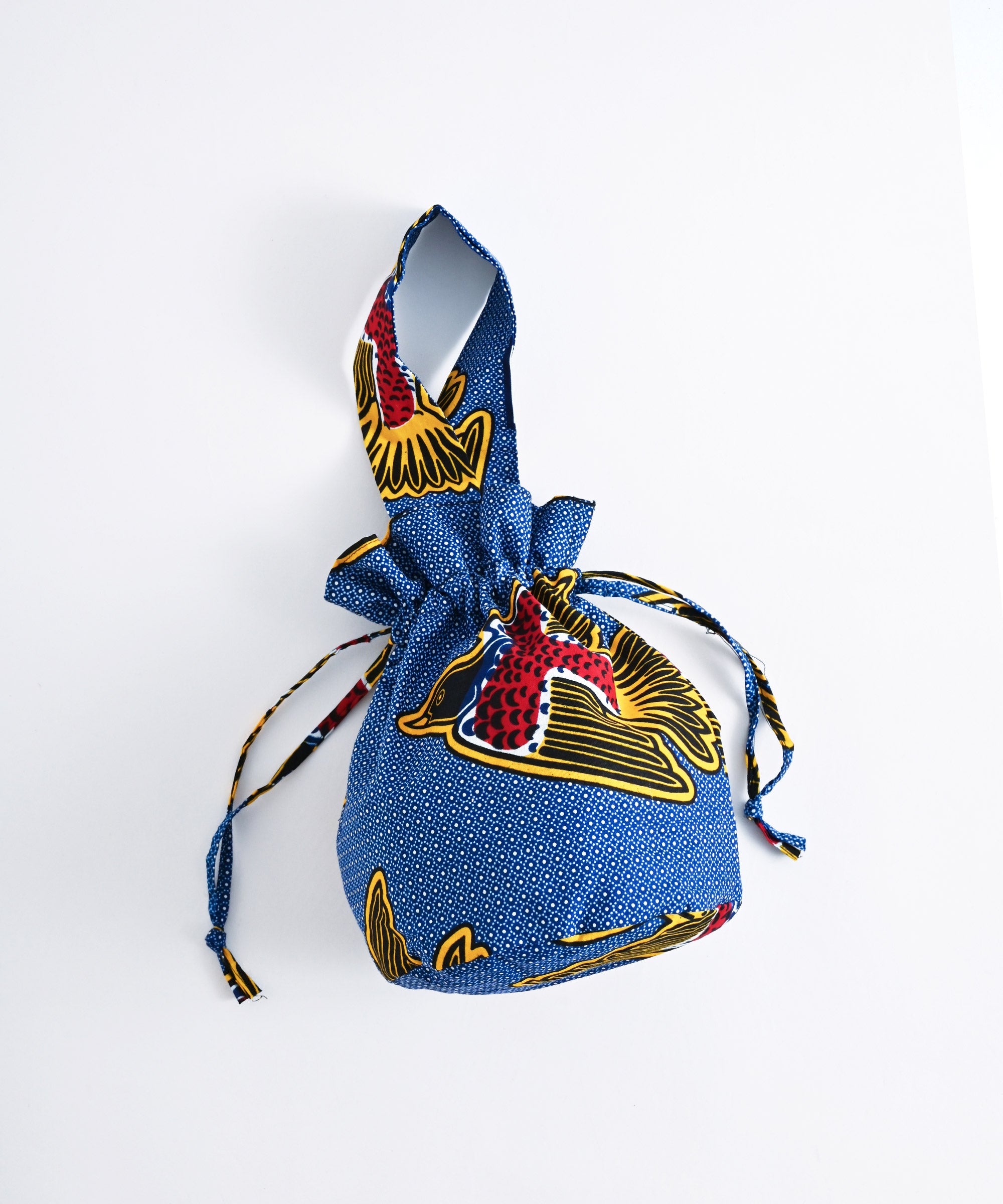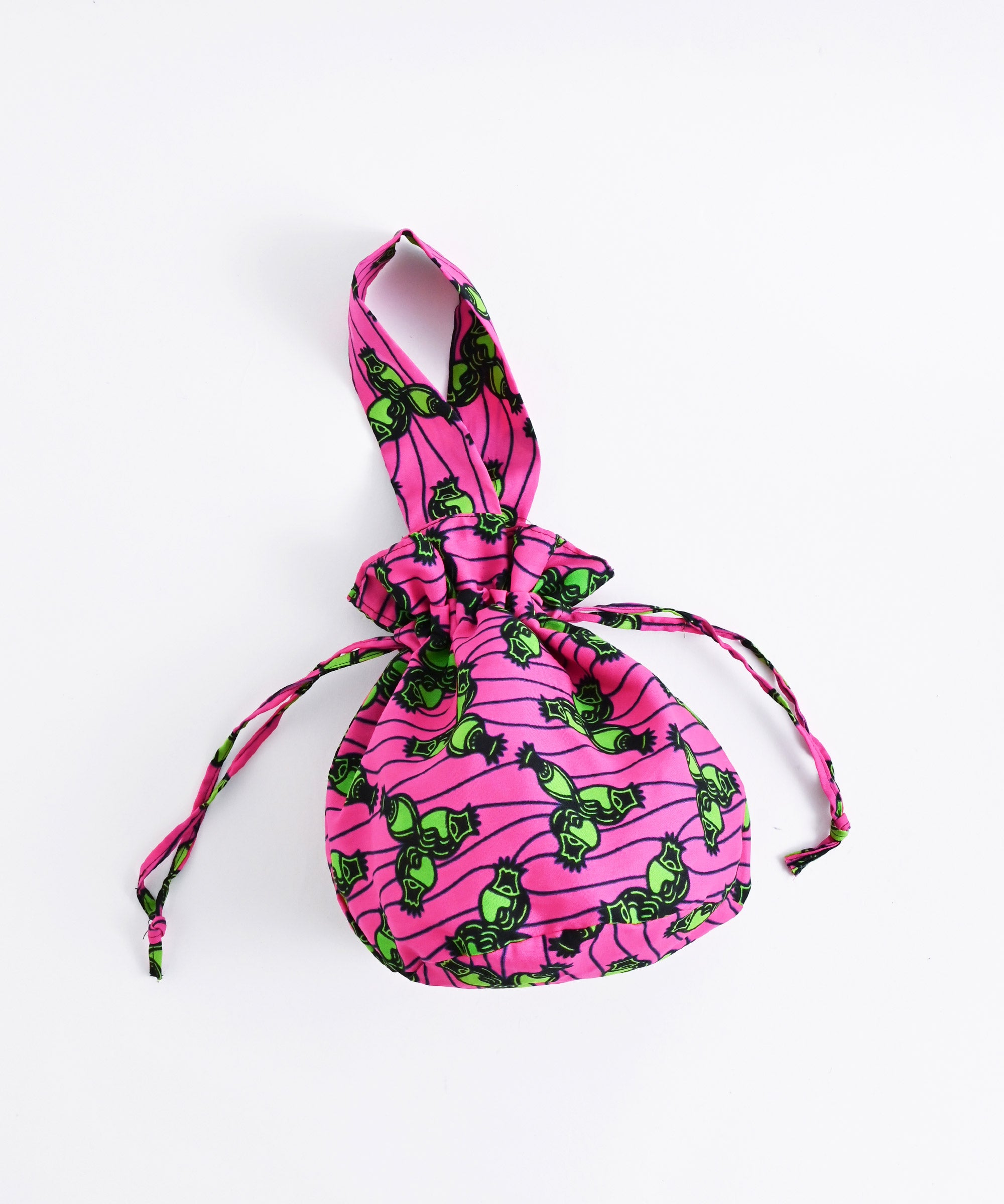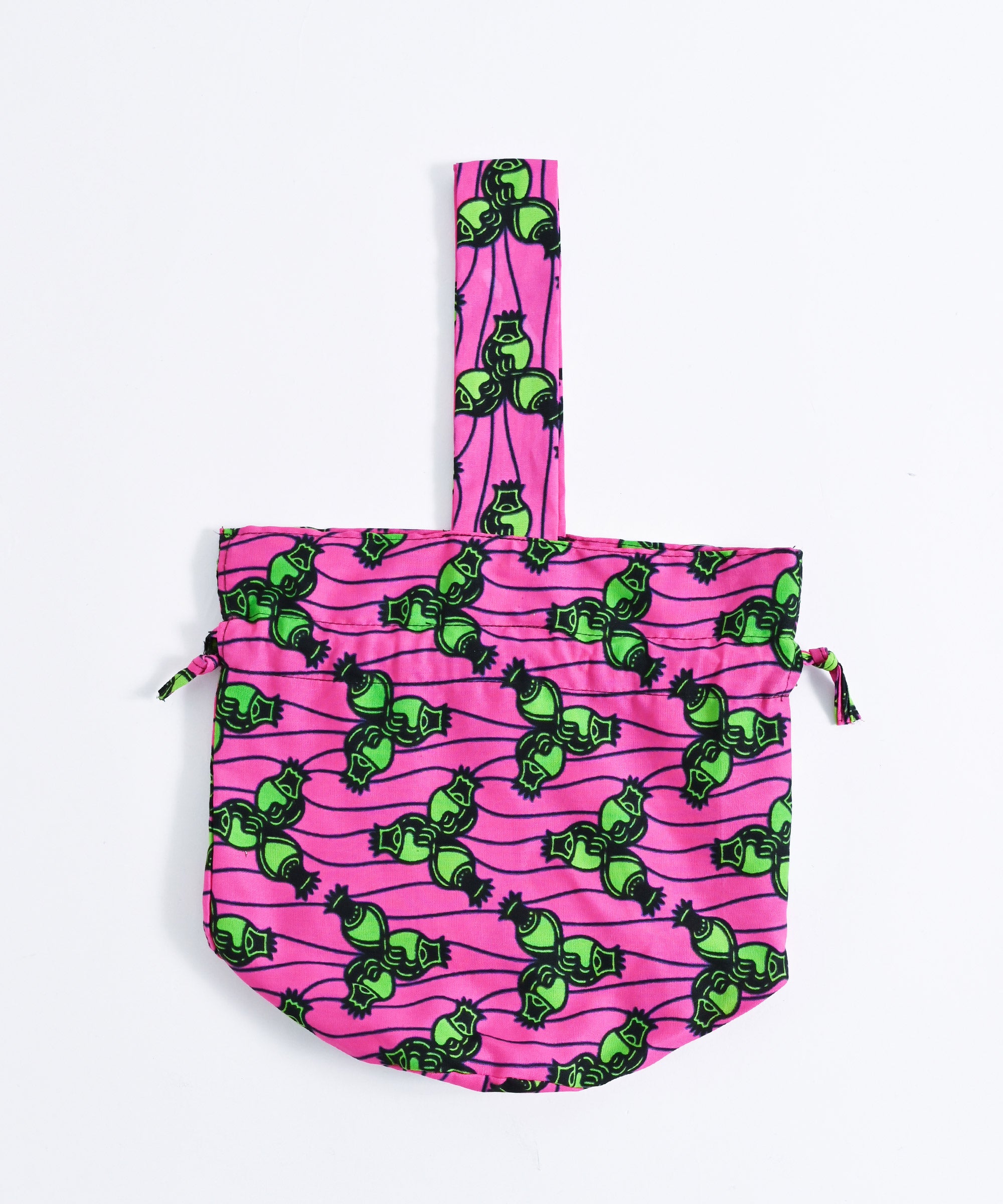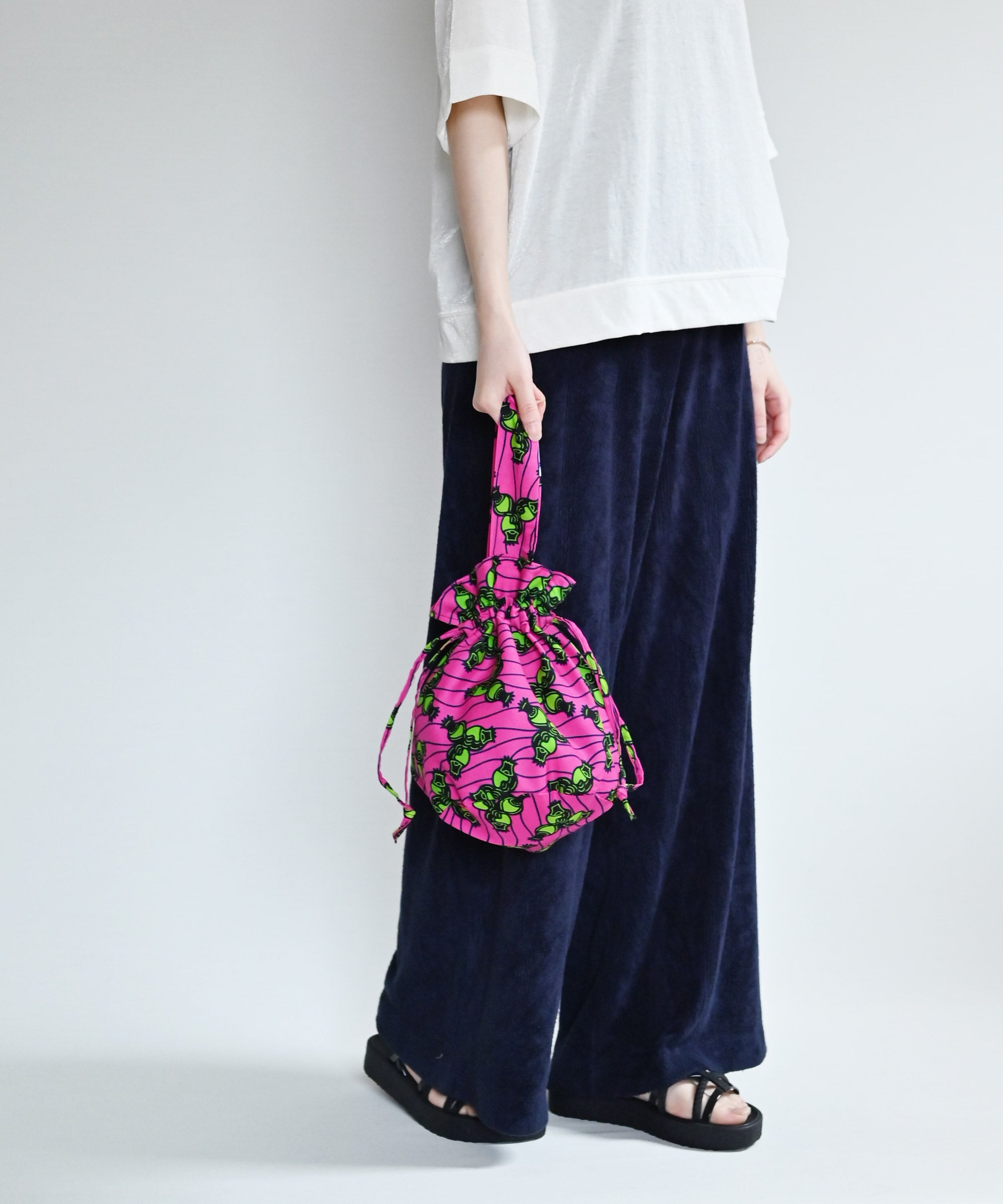 厳選したパーニュ布で、ワンハンドルの巾着バッグを作りました。