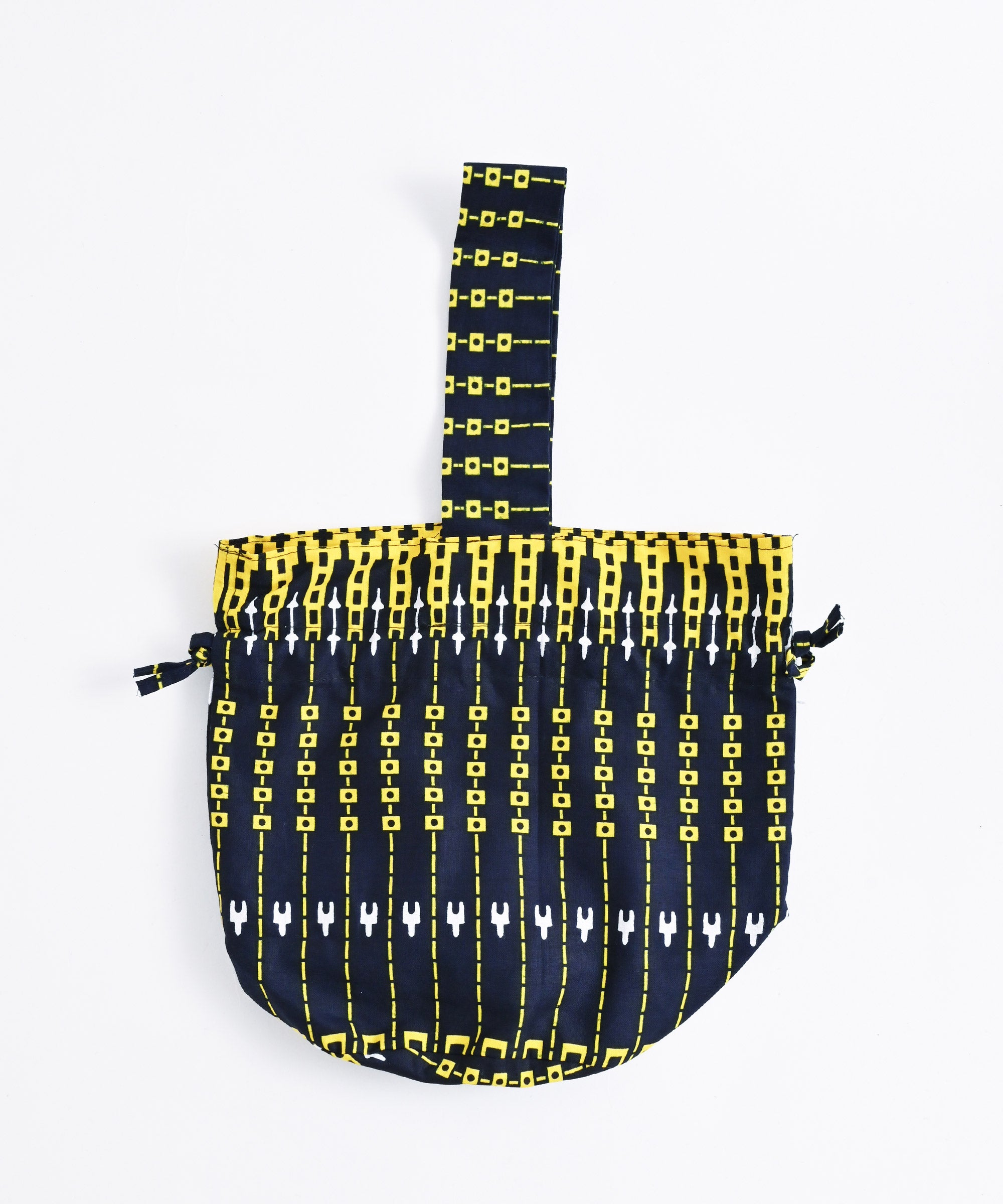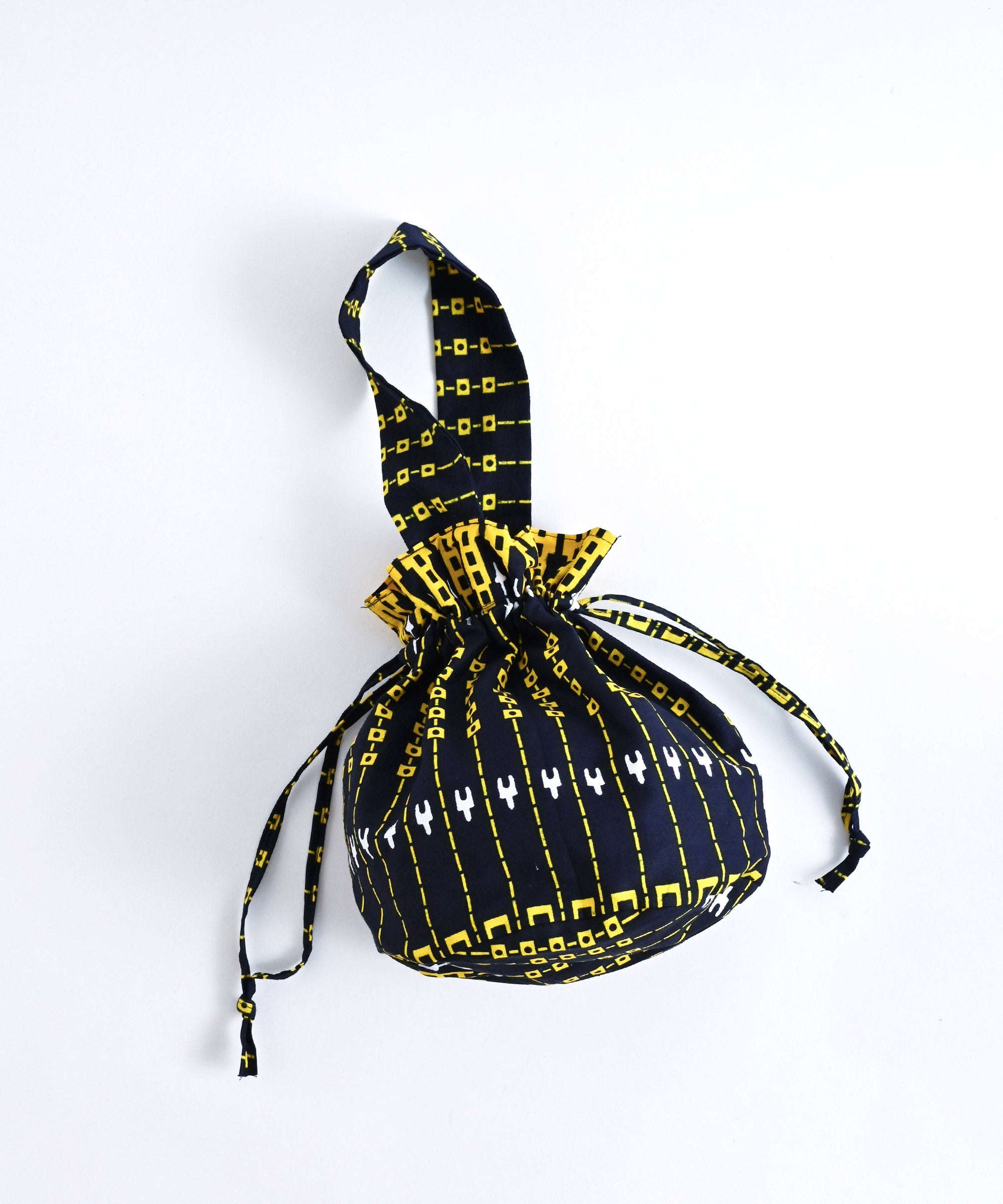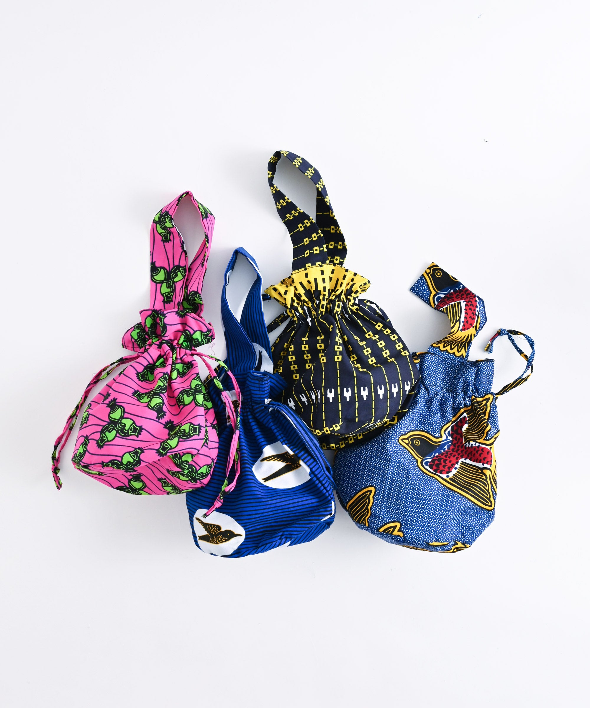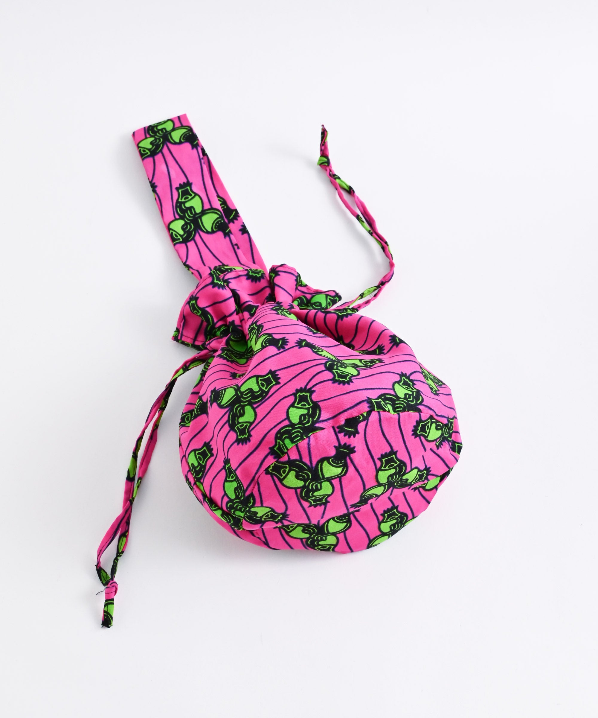 厳選したパーニュ布で、ワンハンドルの巾着バッグを作りました。