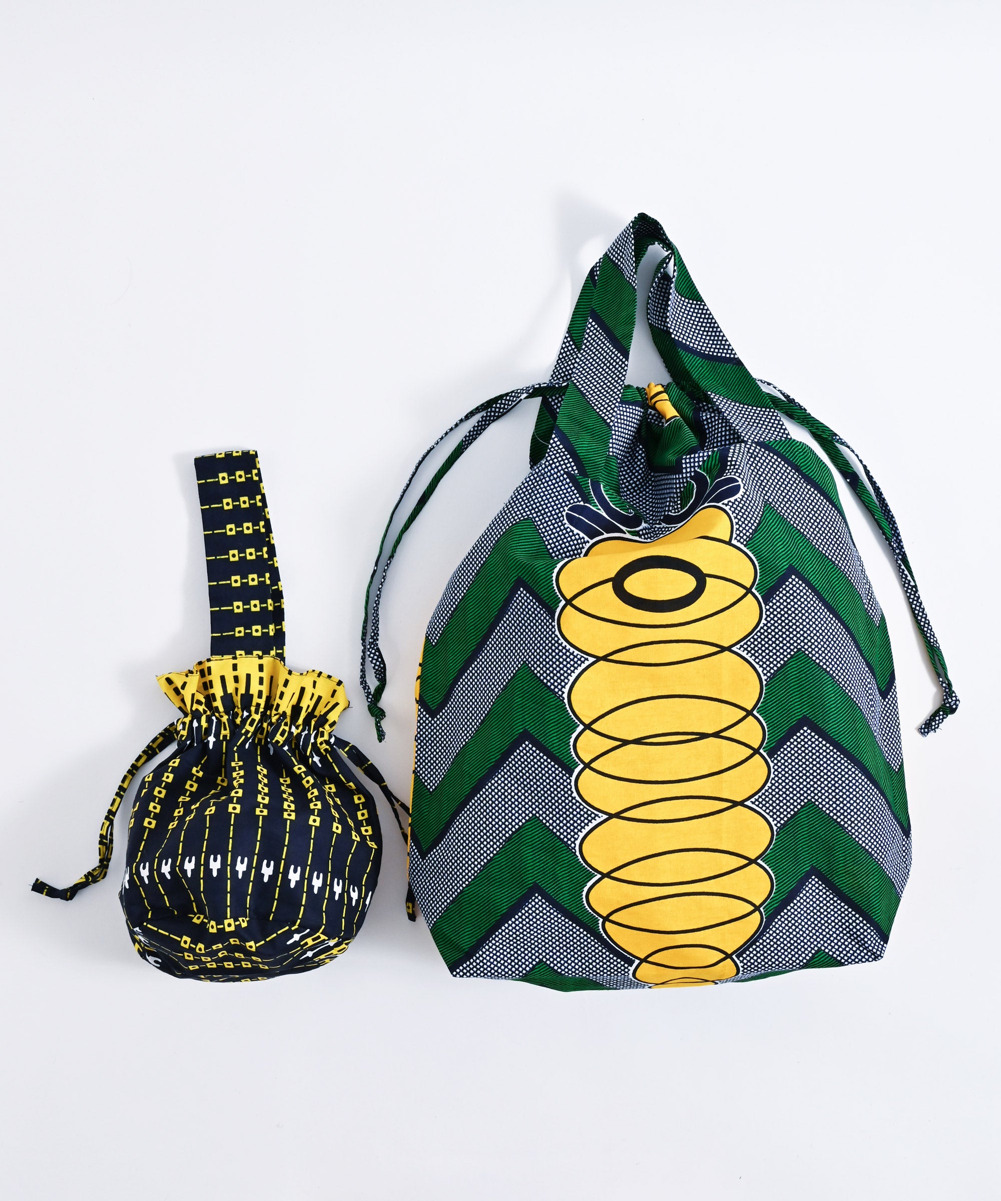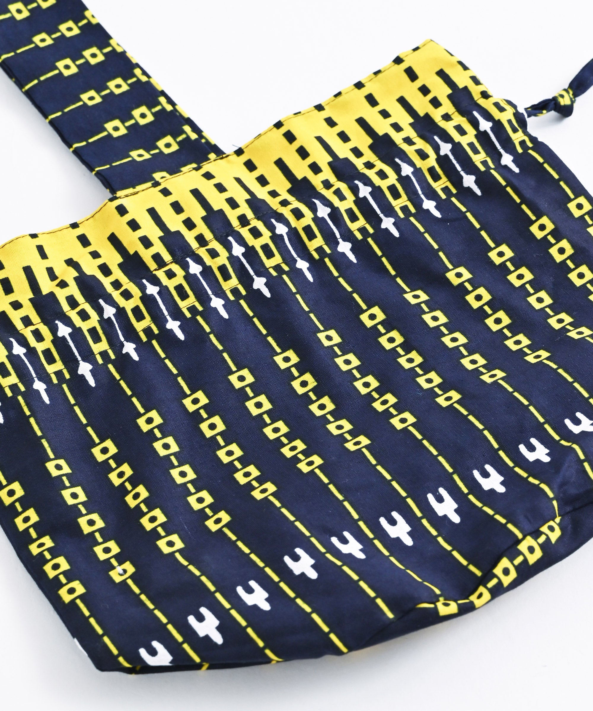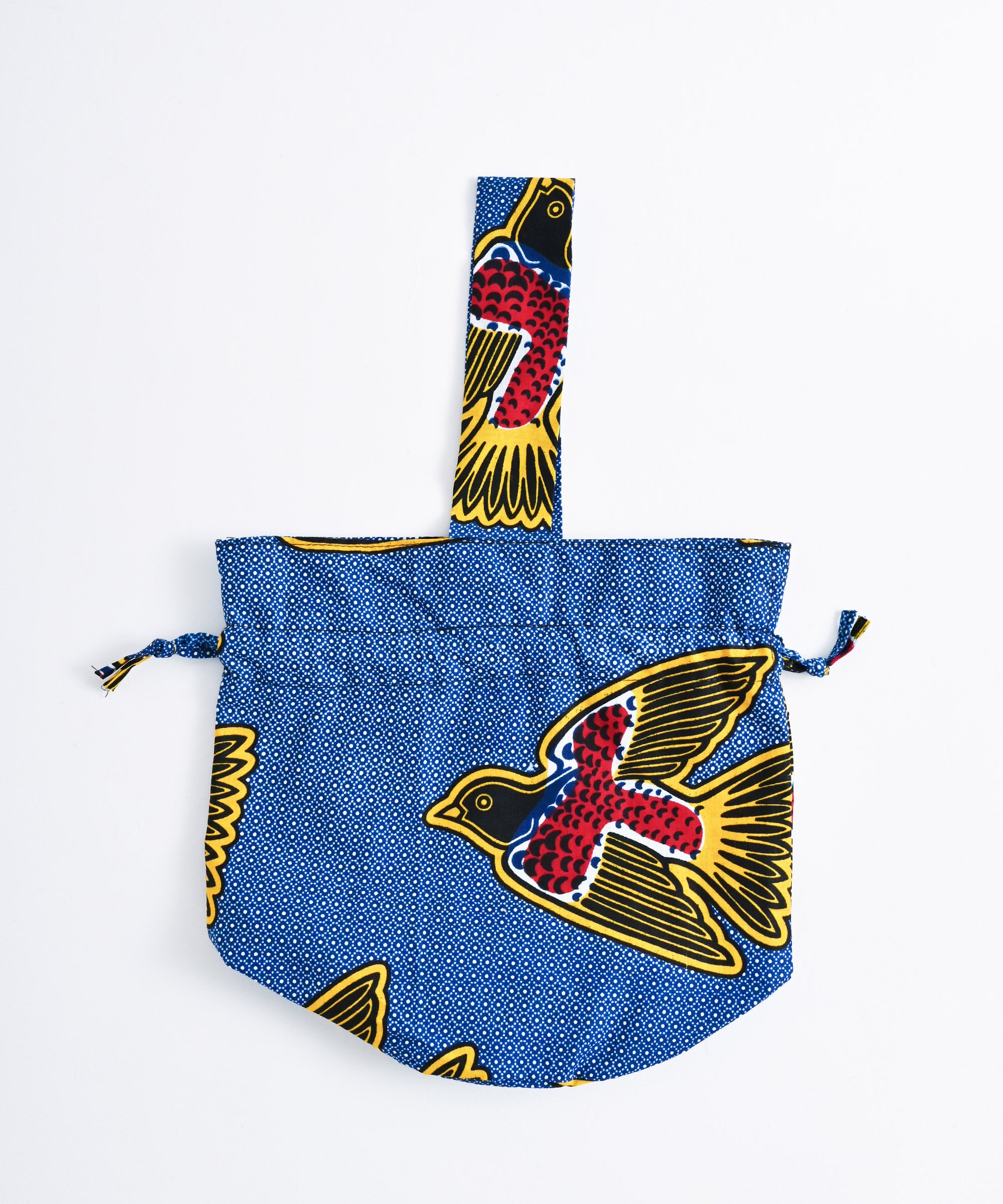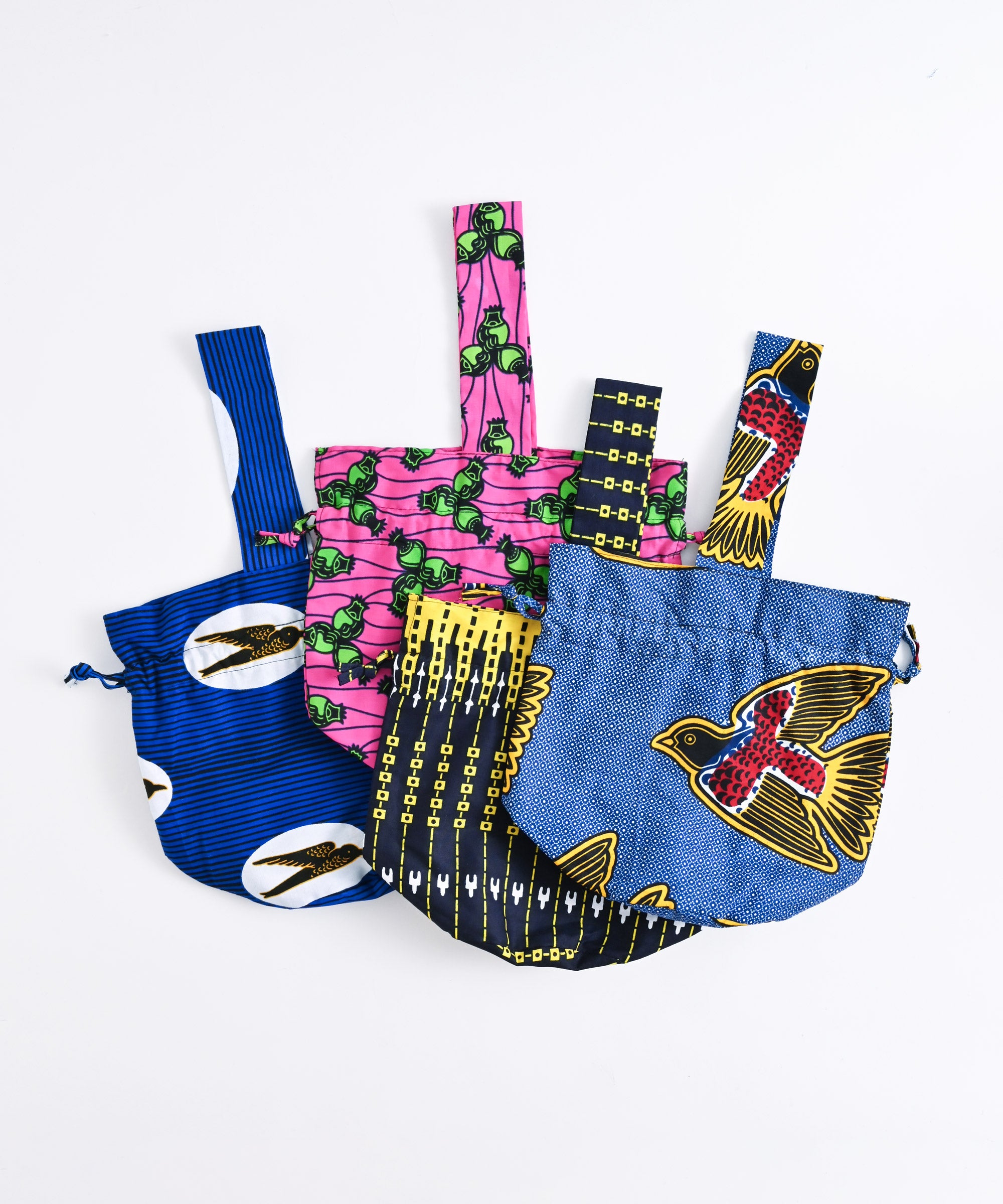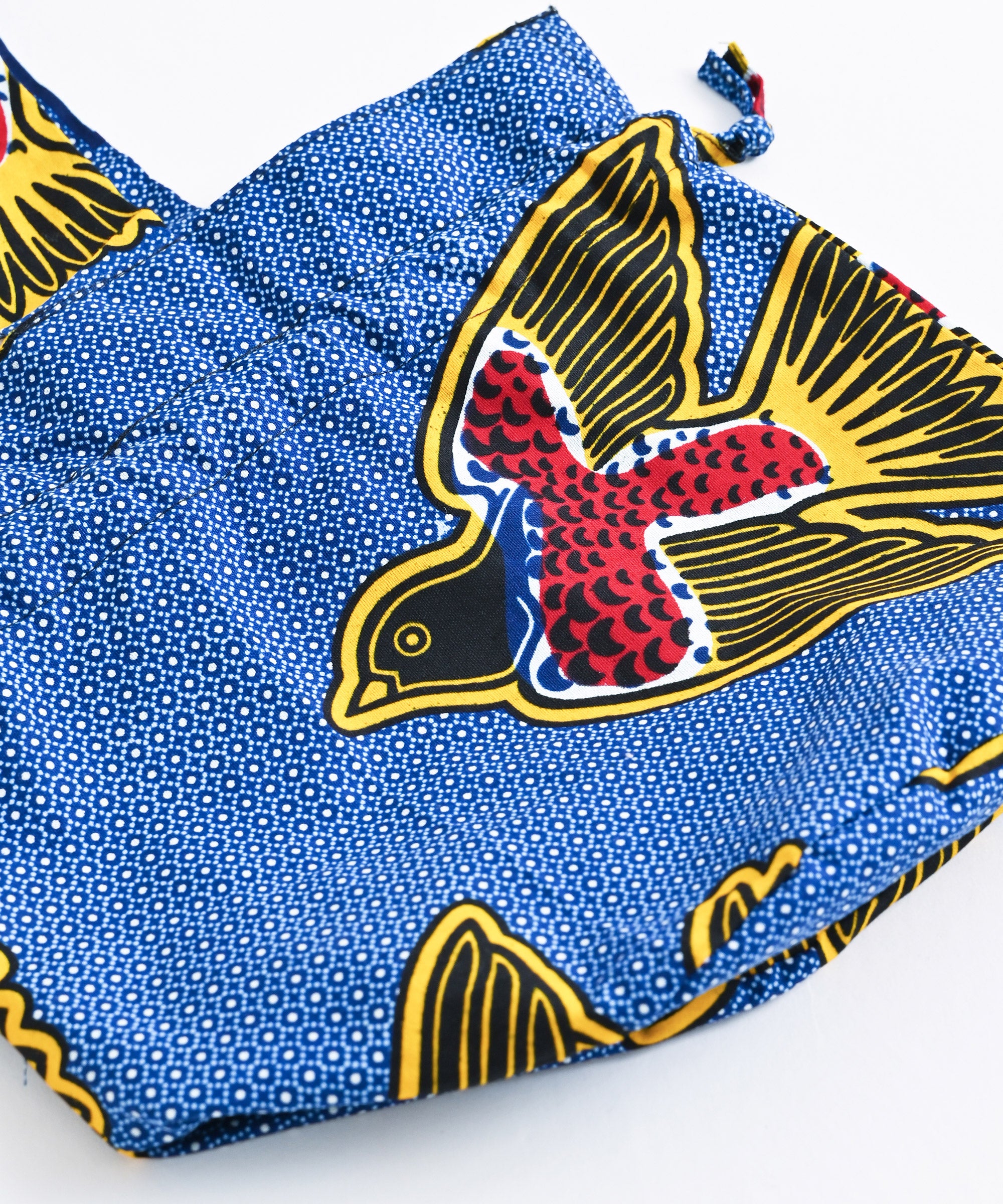 厳選したパーニュ布で、ワンハンドルの巾着バッグを作りました。