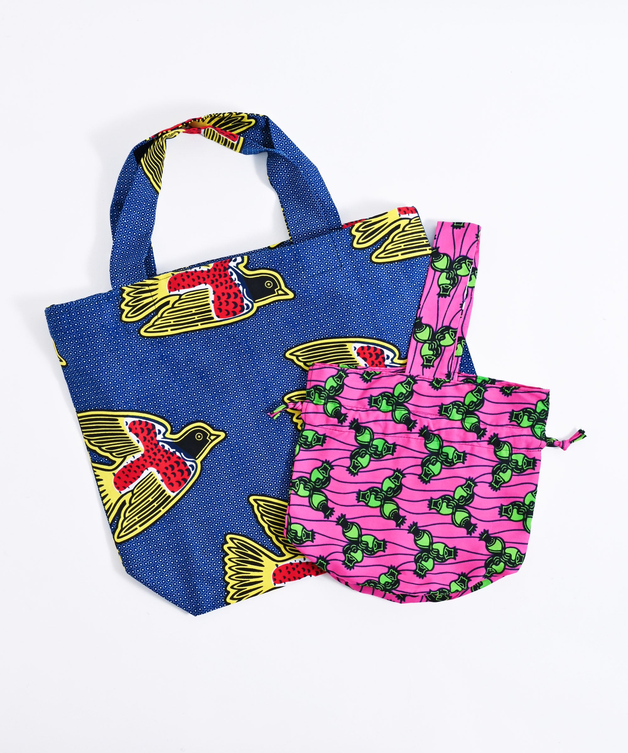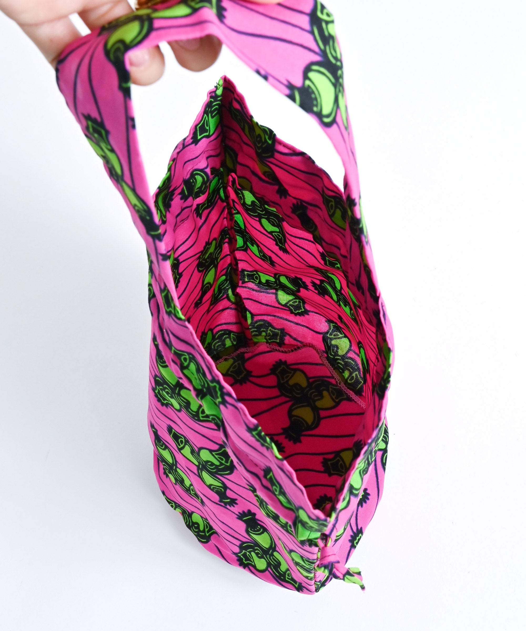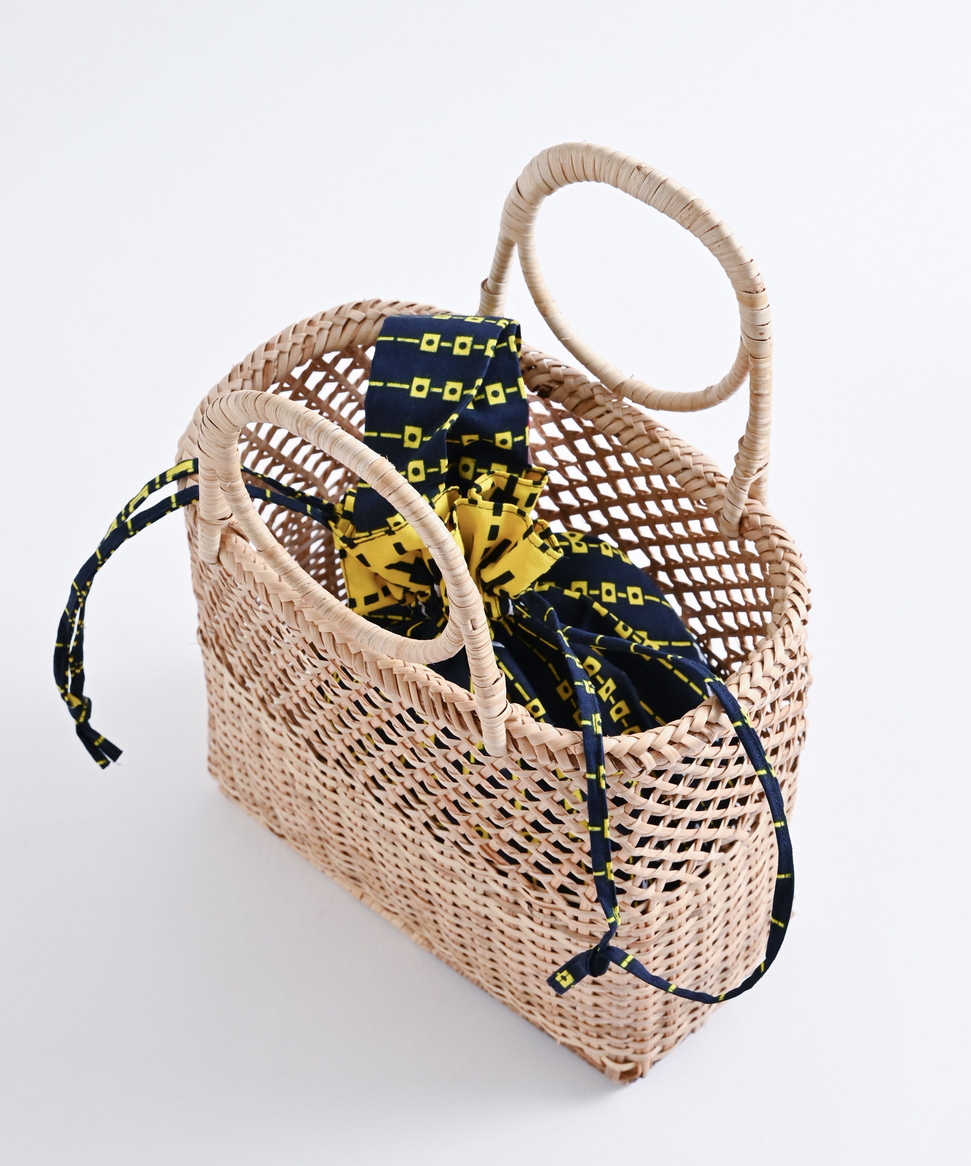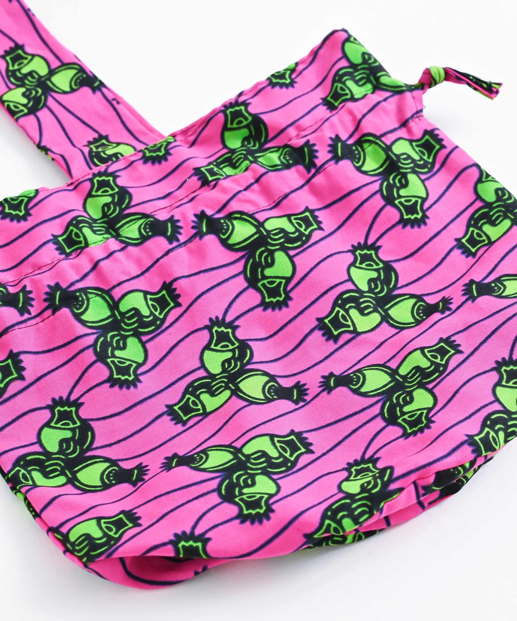 厳選したパーニュ布で、ワンハンドルの巾着バッグを作りました。