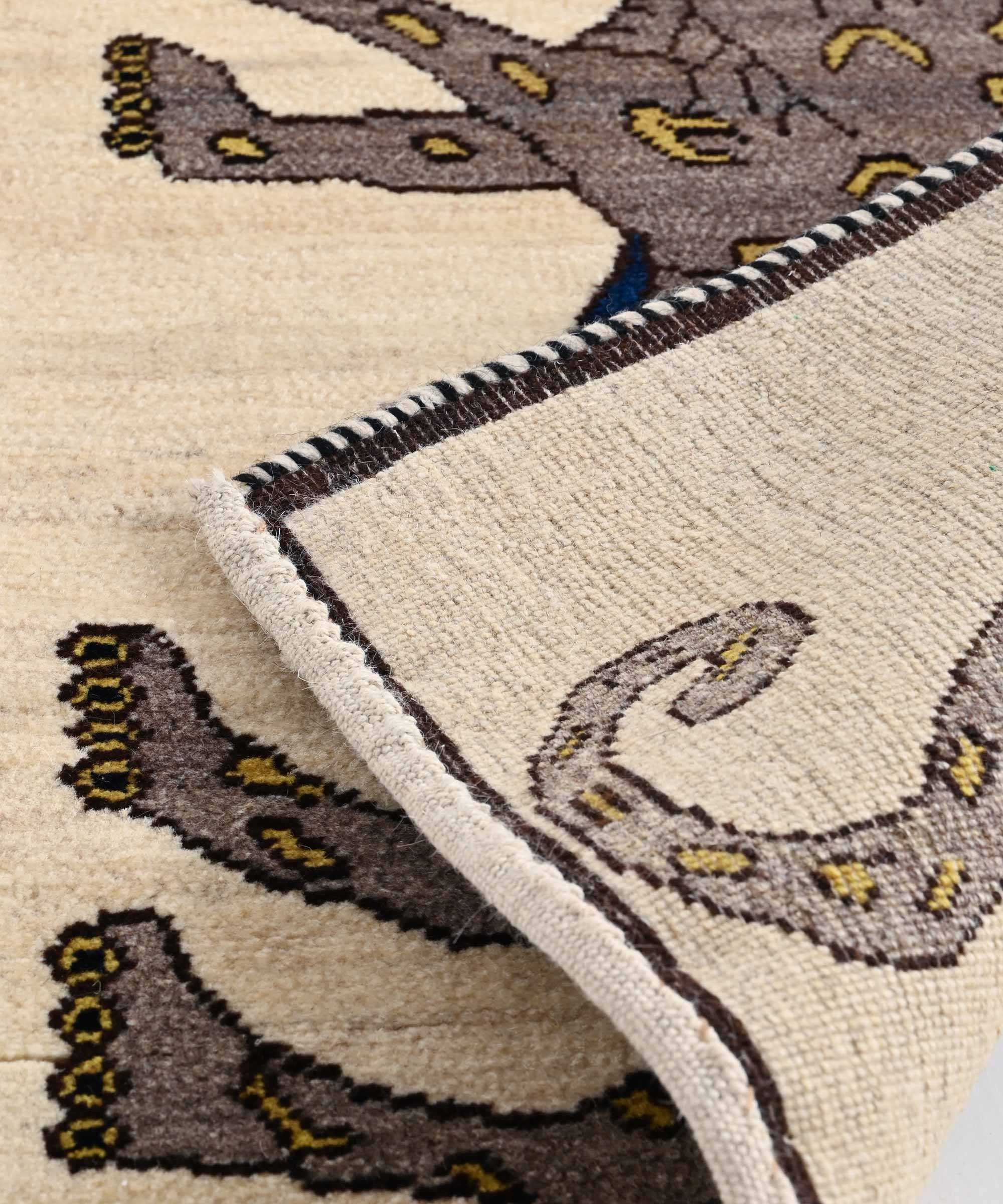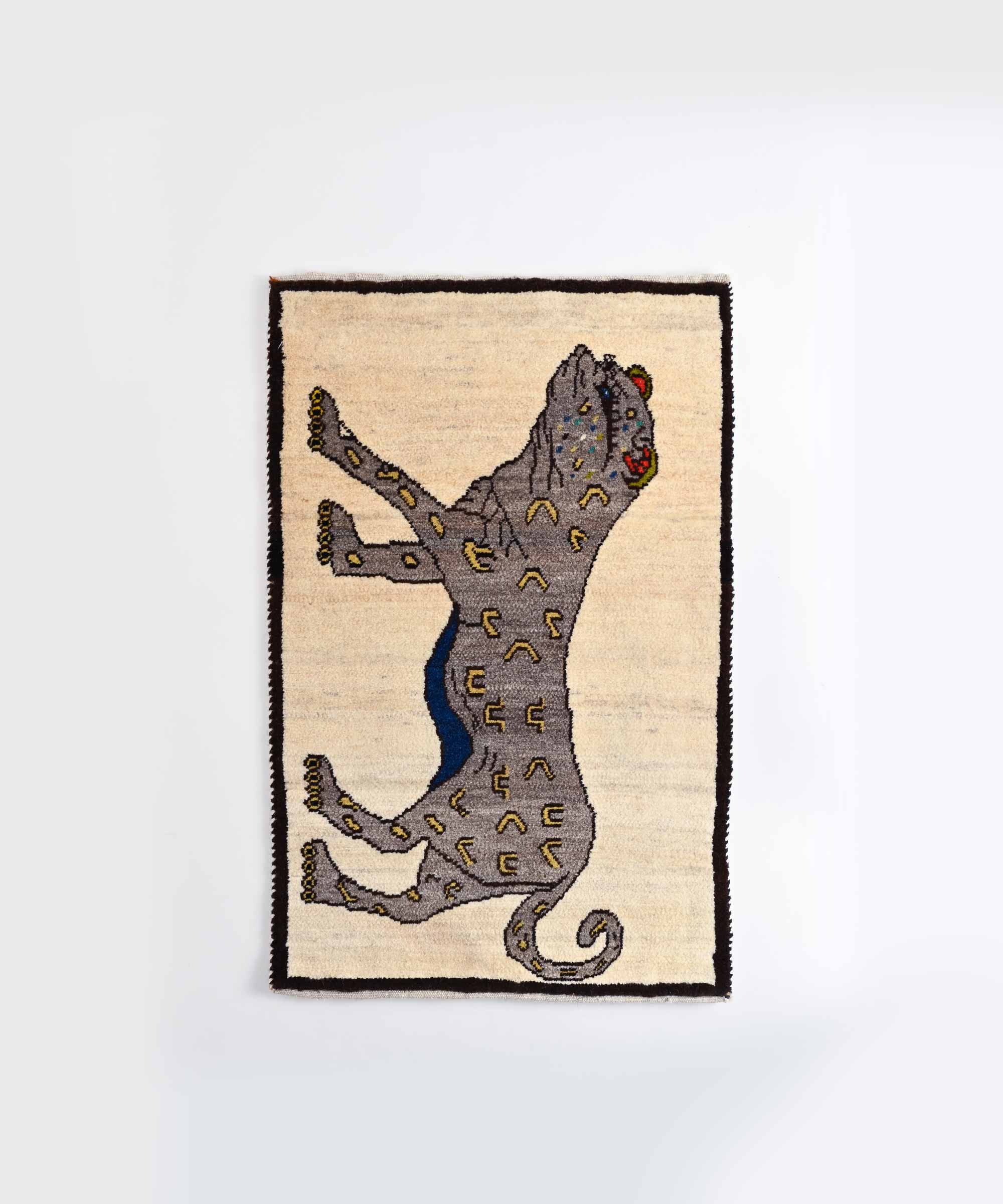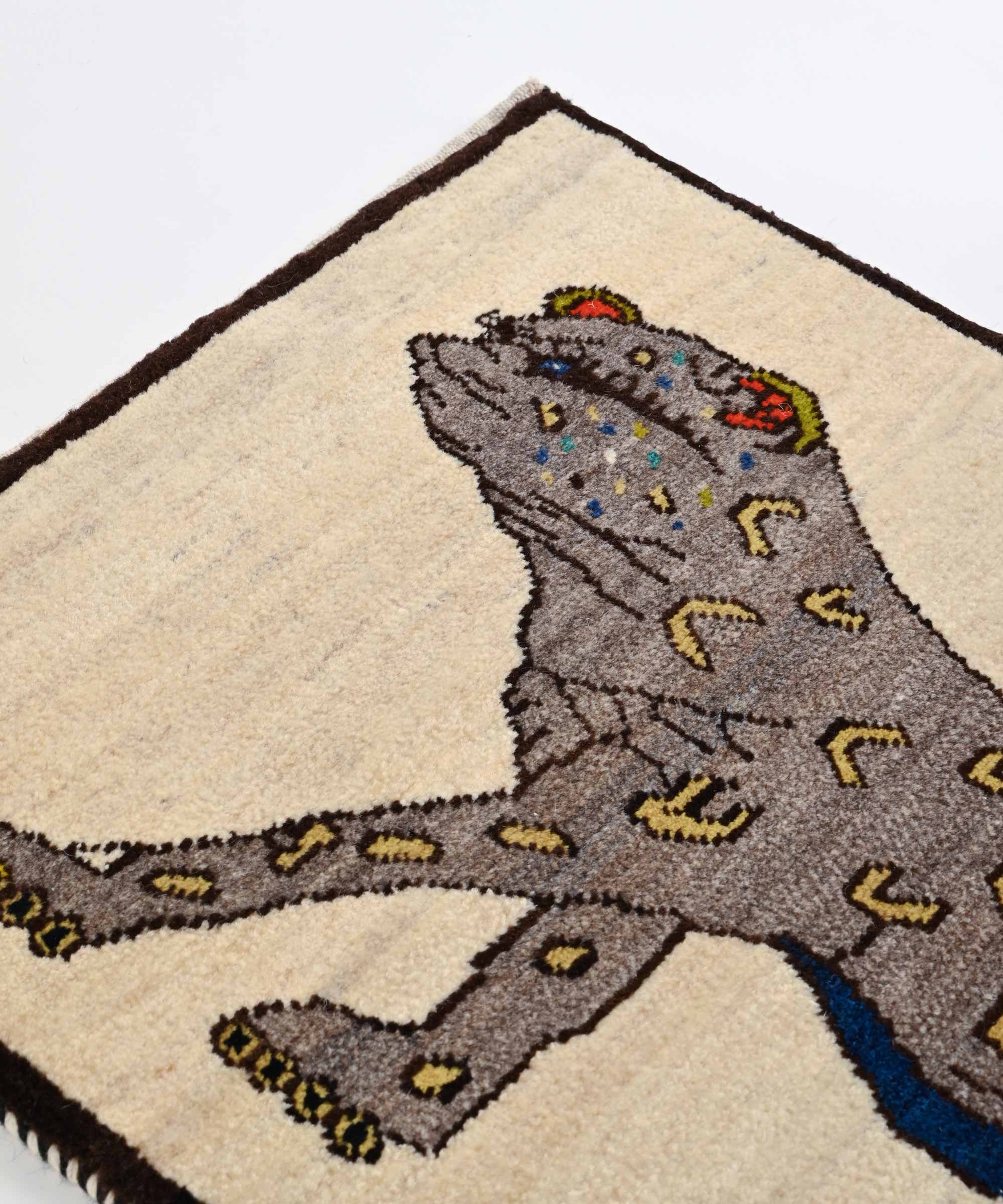 ご自宅の玄関やベッドサイドに置くだけでポイントになりそうな動物柄。架空の動物をモチーフに織り手のオリジナリティと遊び心がたっぷり詰まったこだわりの逸品です。一人がけのソファの足元やデスク回りに敷くのもおすすめです。