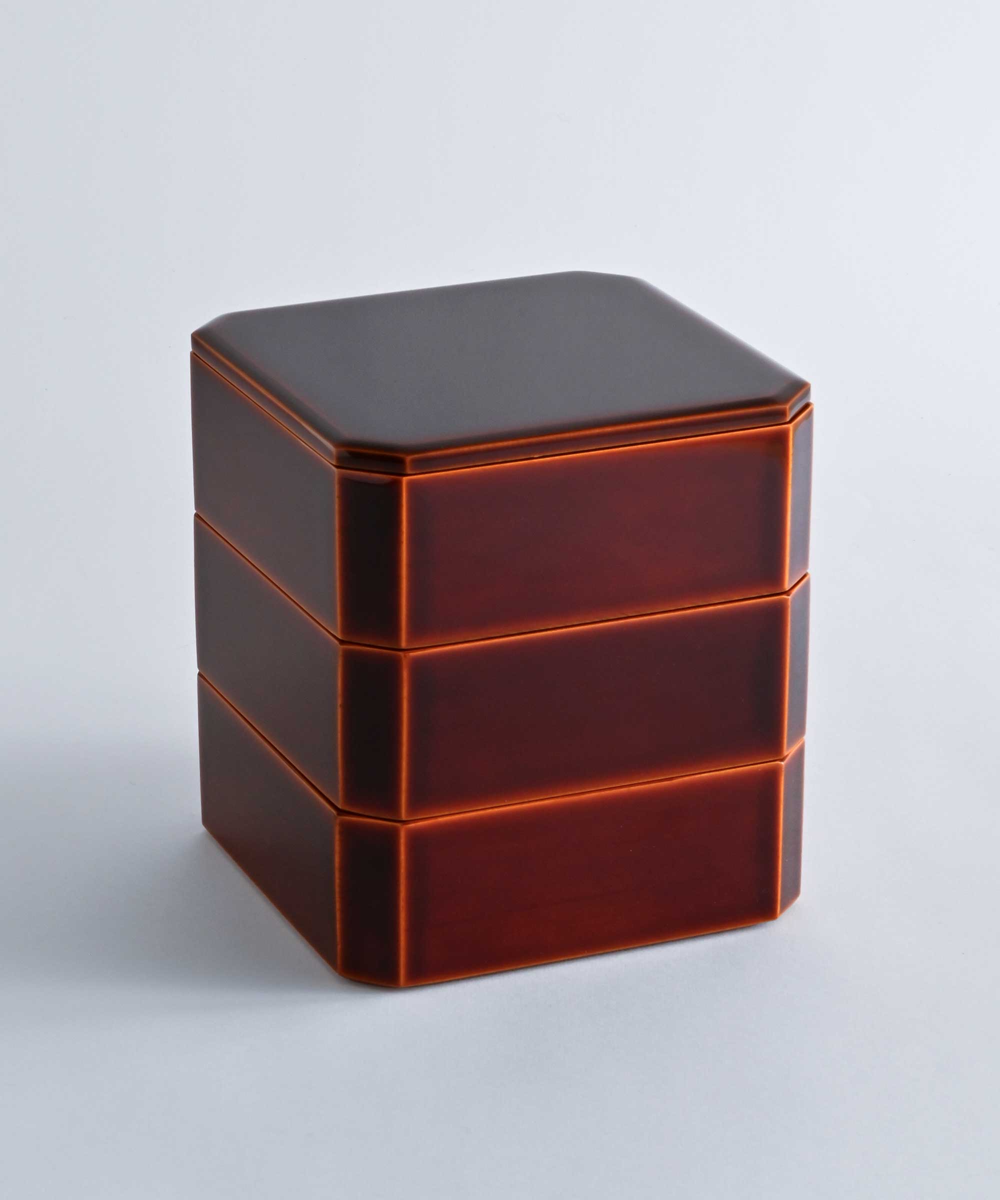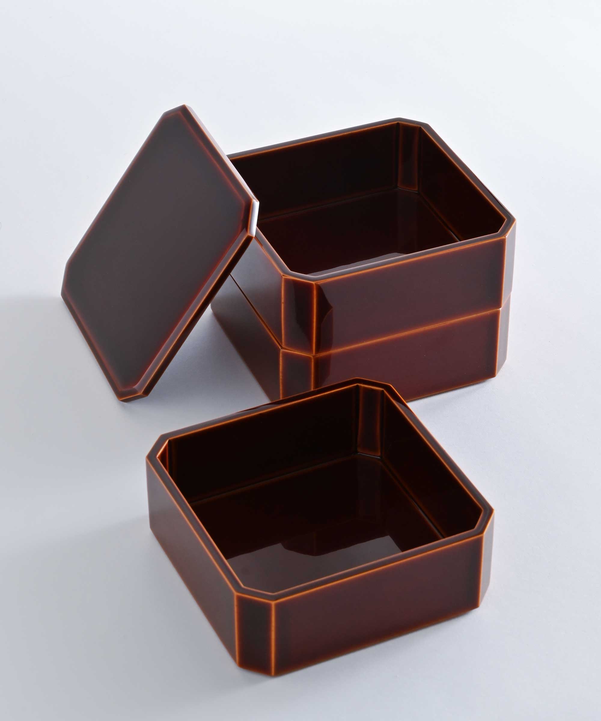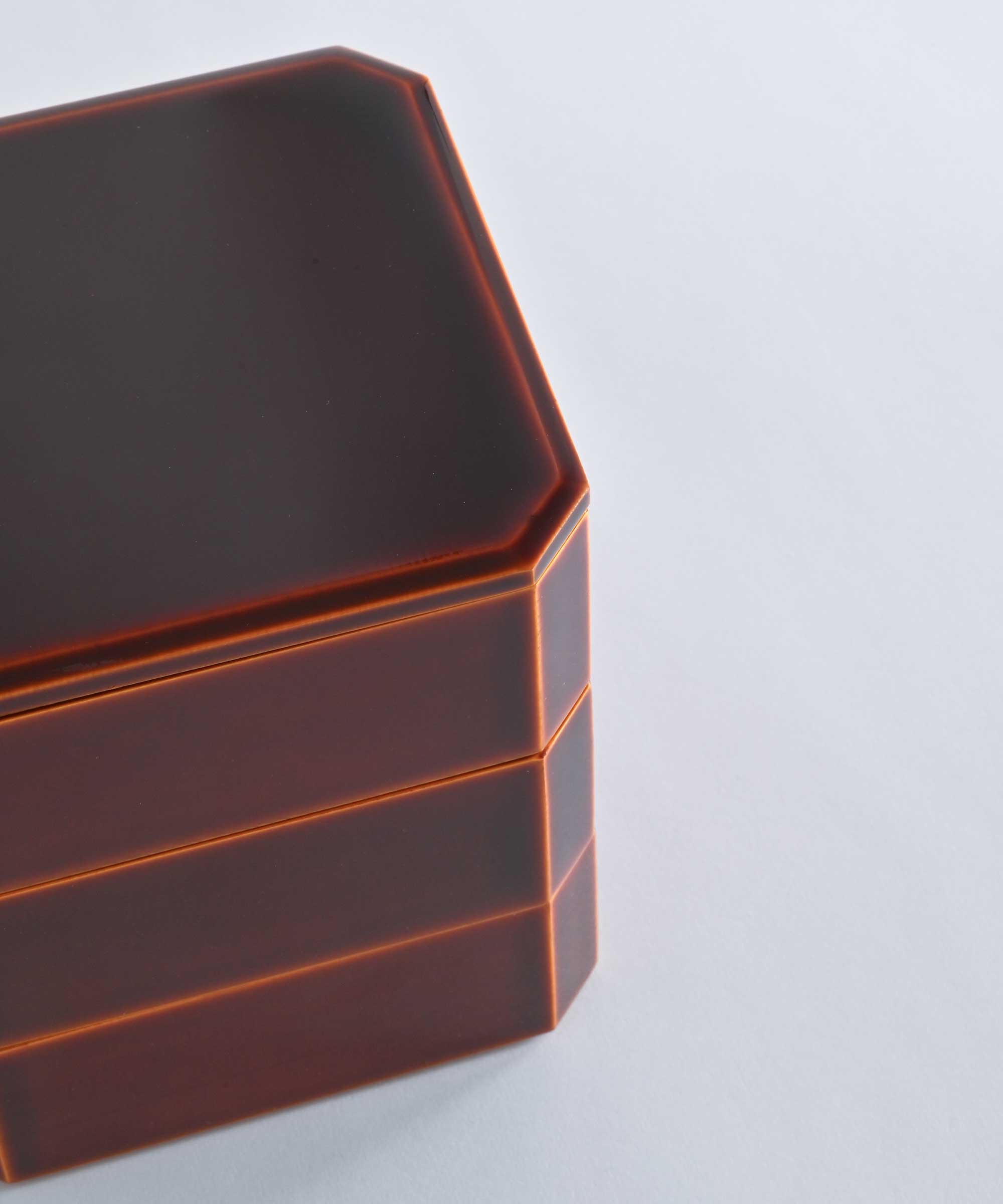木製の木地に漆を塗って仕上げた、隅切タイプの小重箱(お重)。