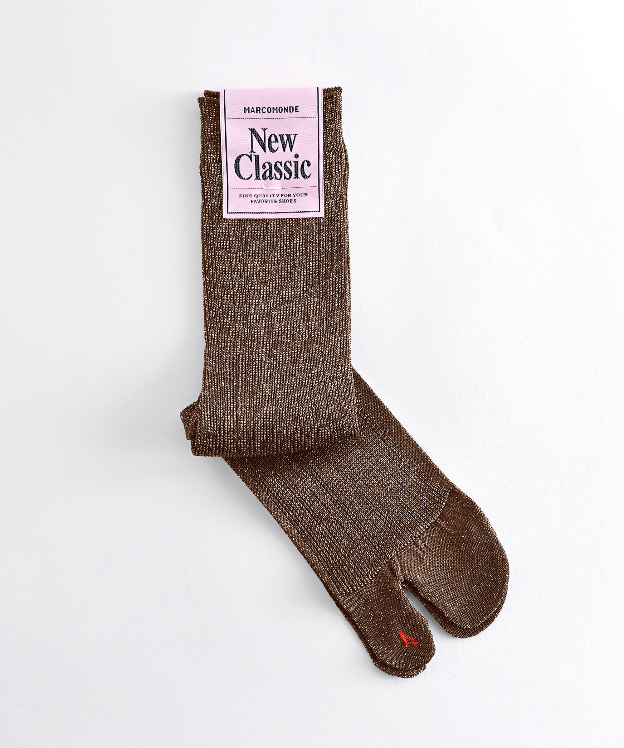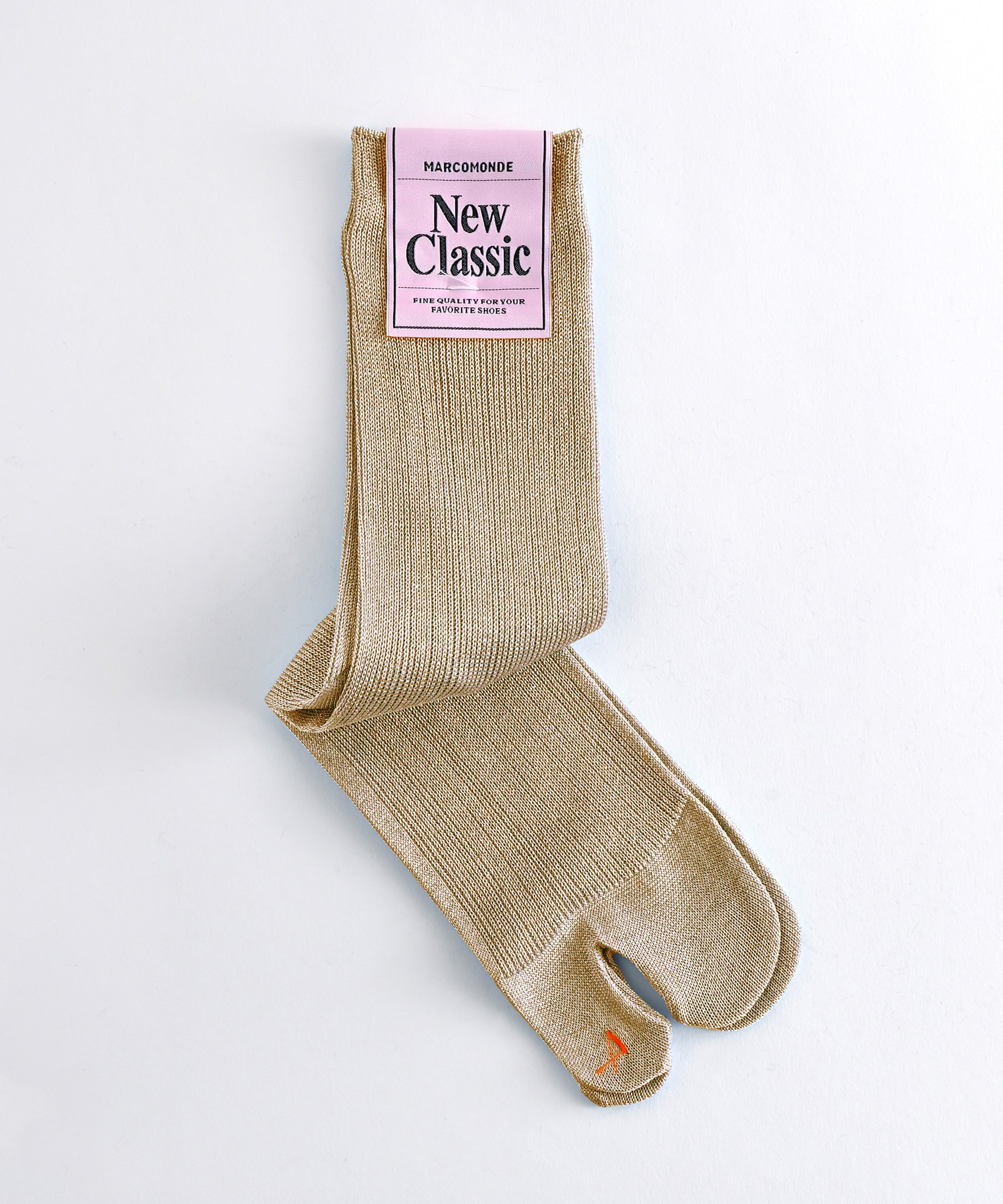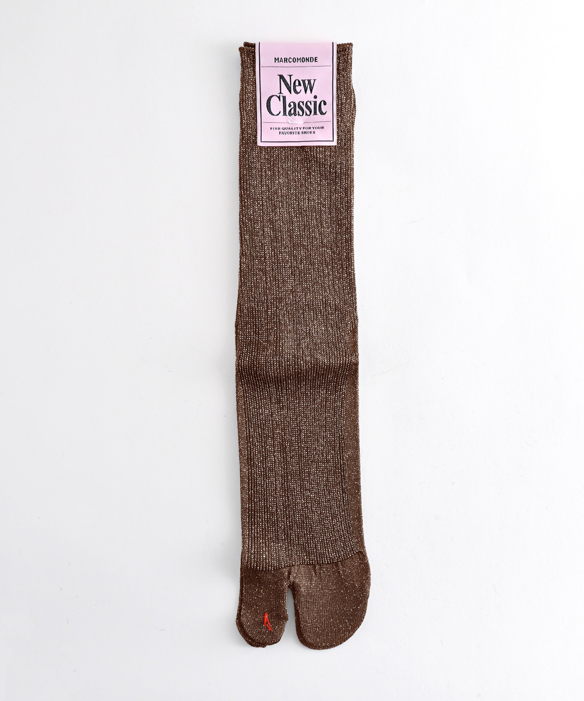 1x1リブのグリッターソックスは肌触りの良いラメ糸を使用し、柔らかくしなやかな履き心地。カジュアルになりすぎない大人の為のラメソックスです。