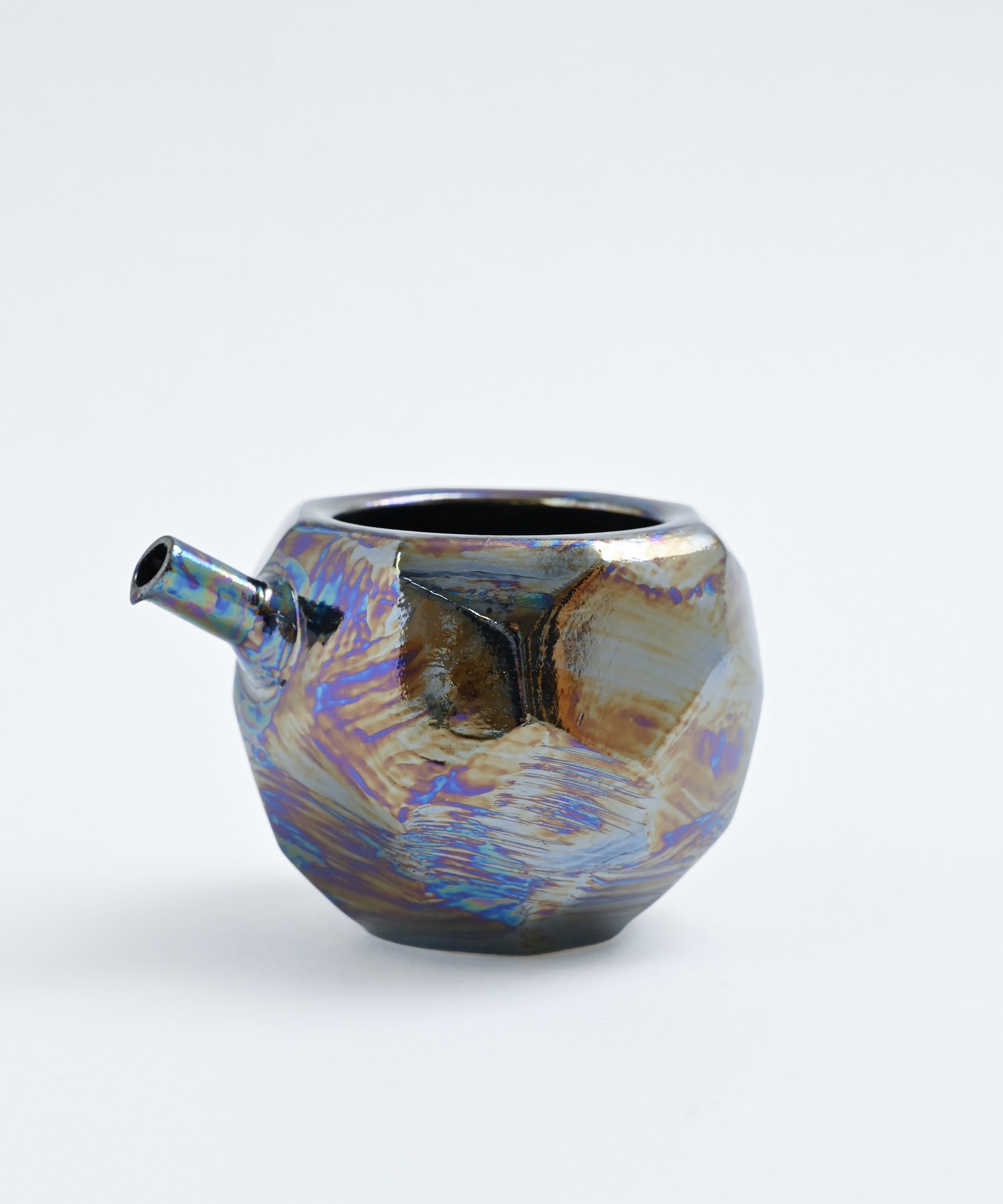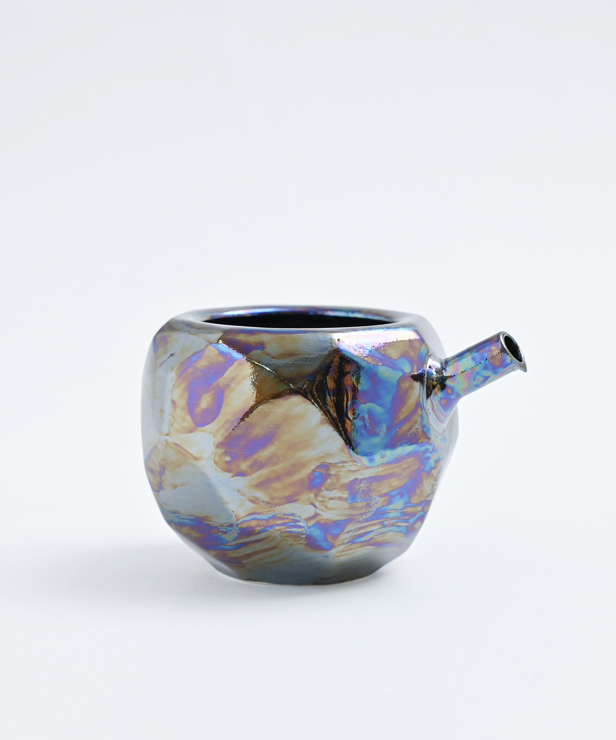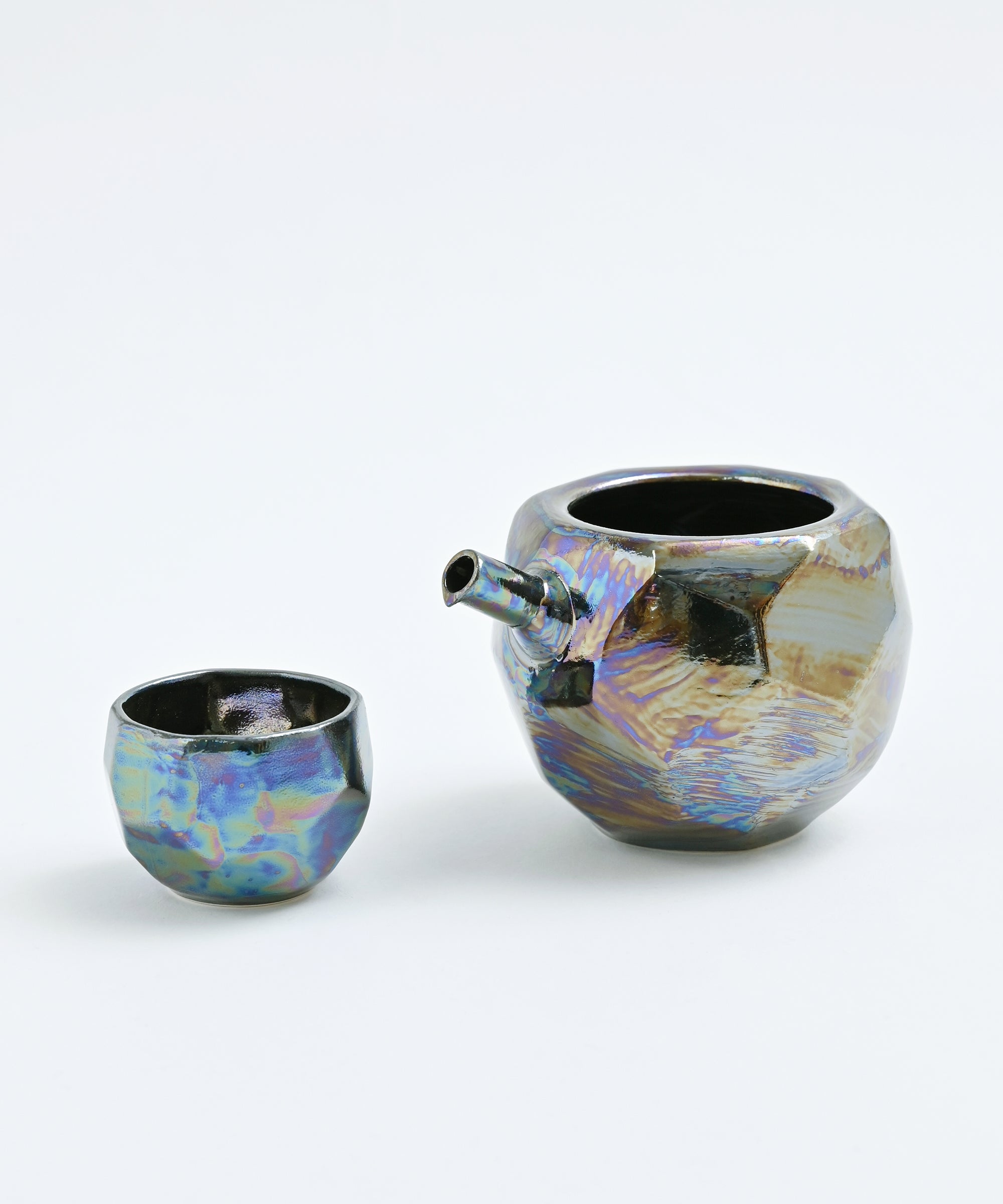ブラックの釉薬に、ラスターを組み合わせた酒器。