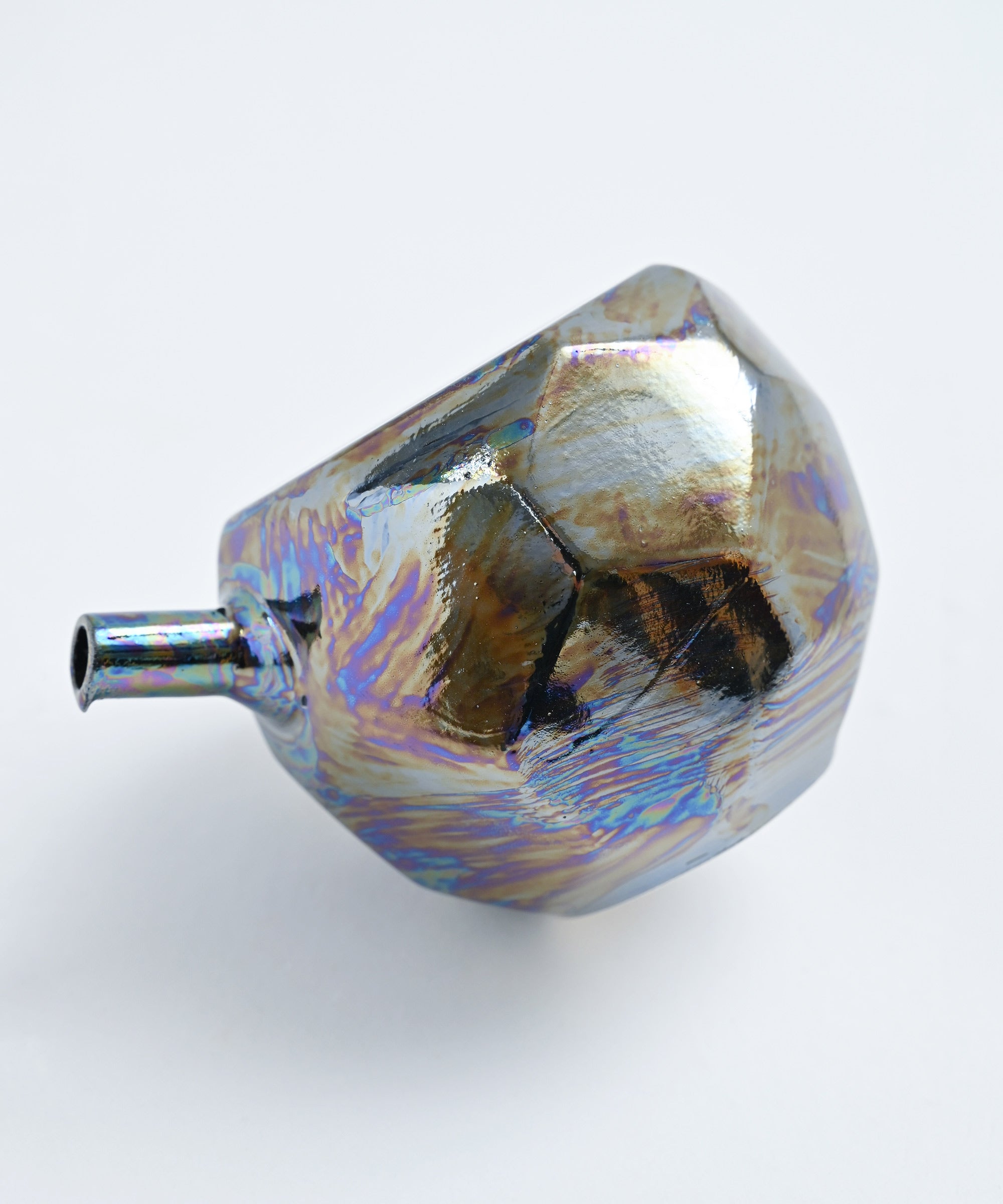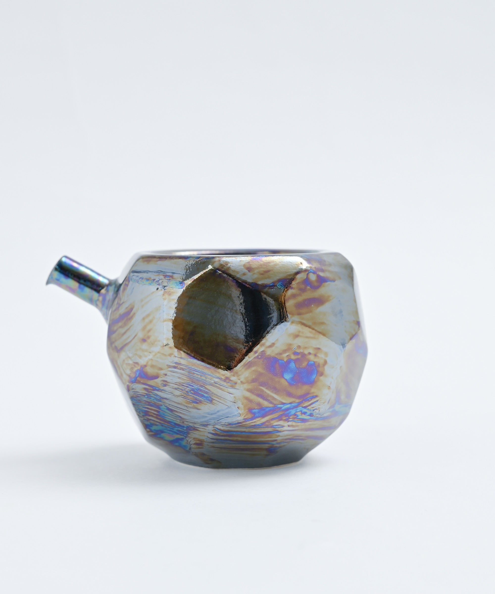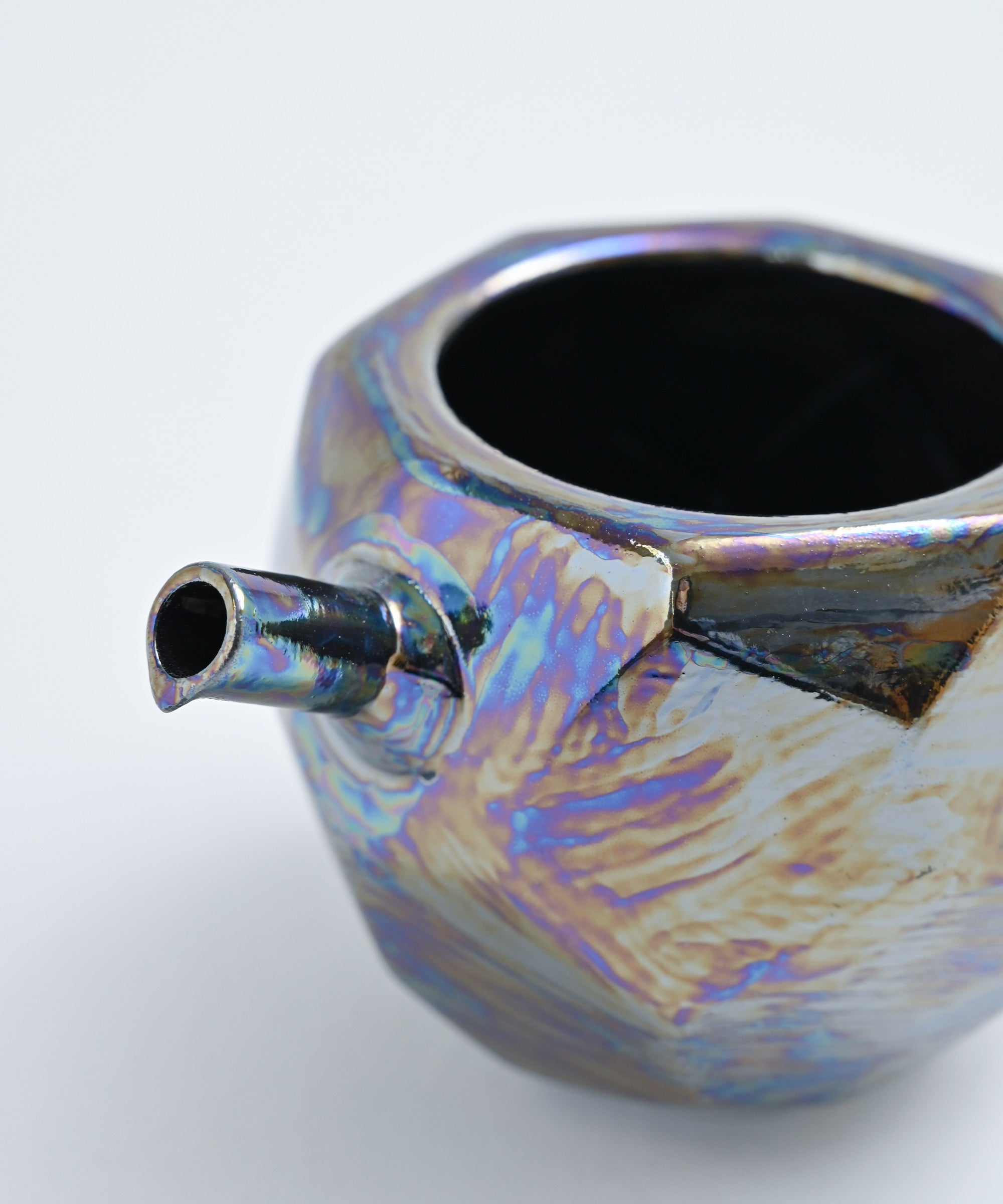 ブラックの釉薬に、ラスターを組み合わせた酒器。