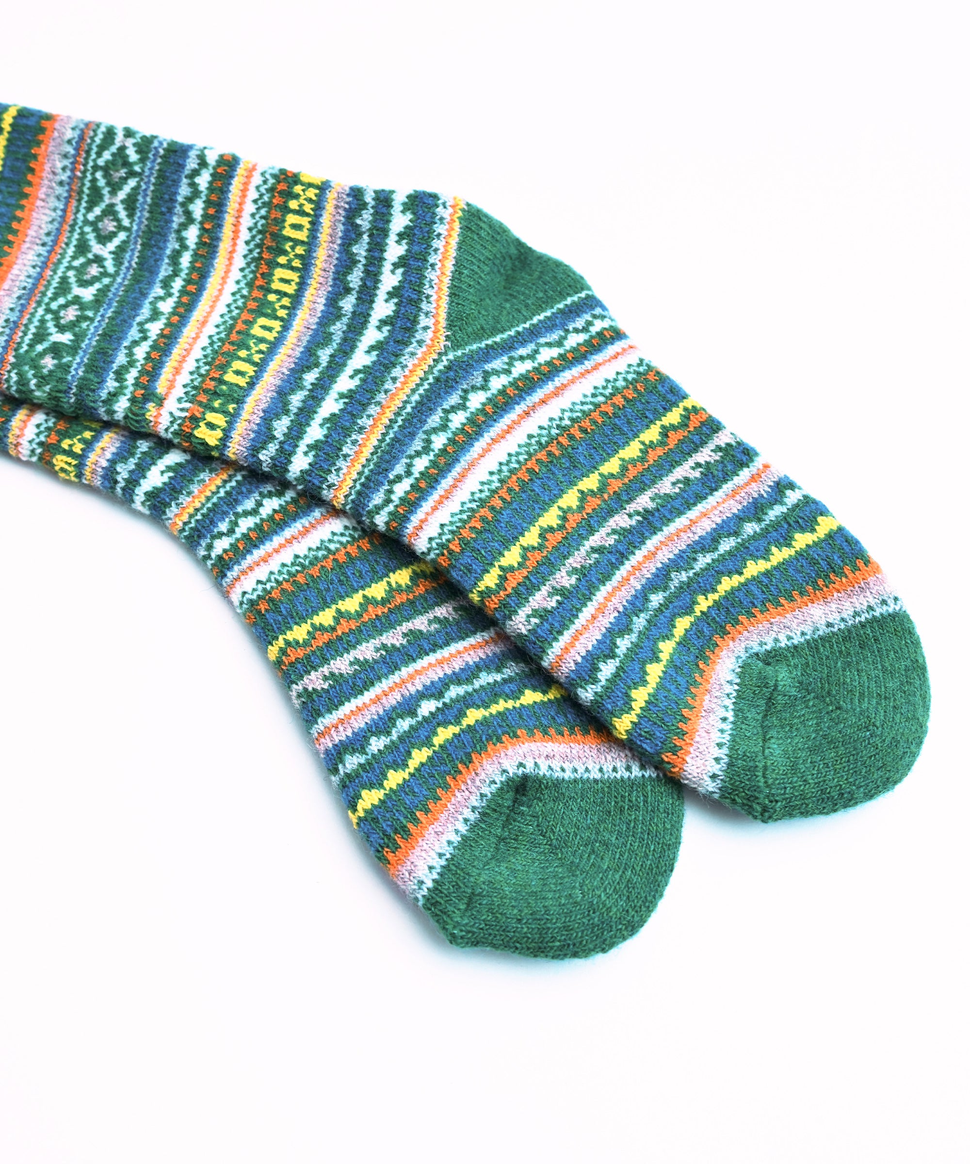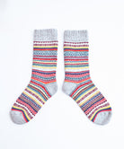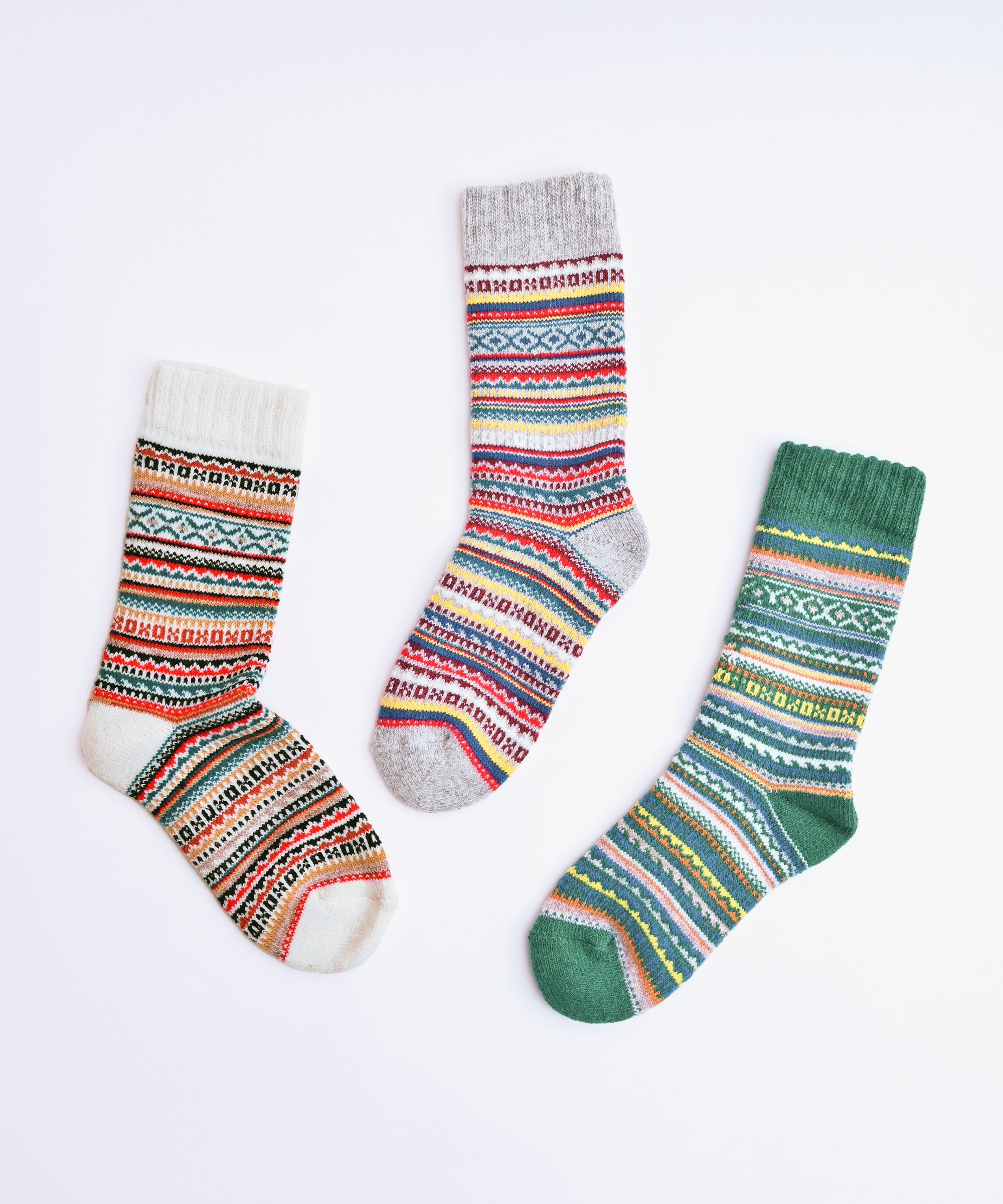 ウール混で暖かく、あたたかな雰囲気のノルディック柄がポイントに。程よく肉厚なのでアウトドア用やルームソックスとしても。