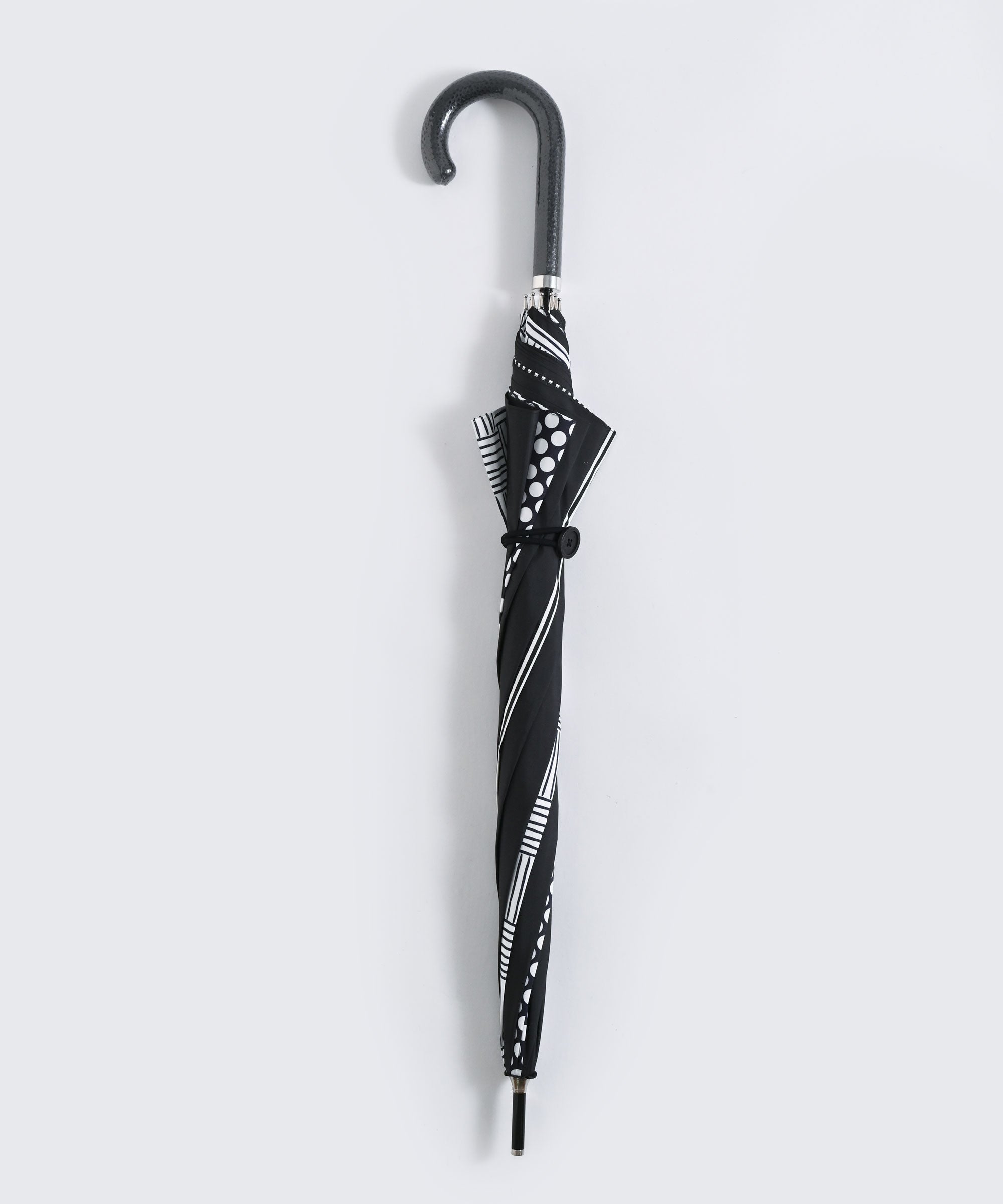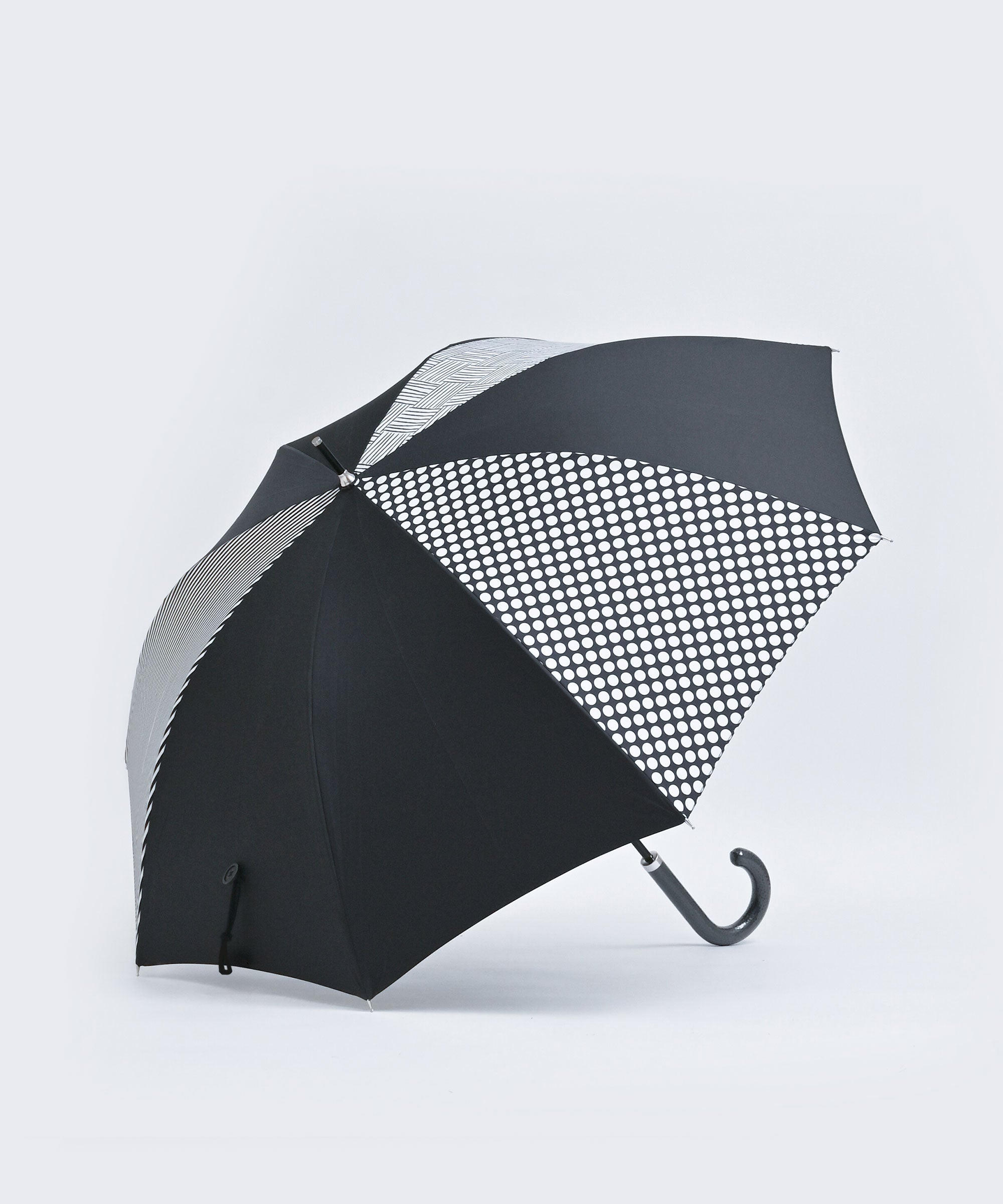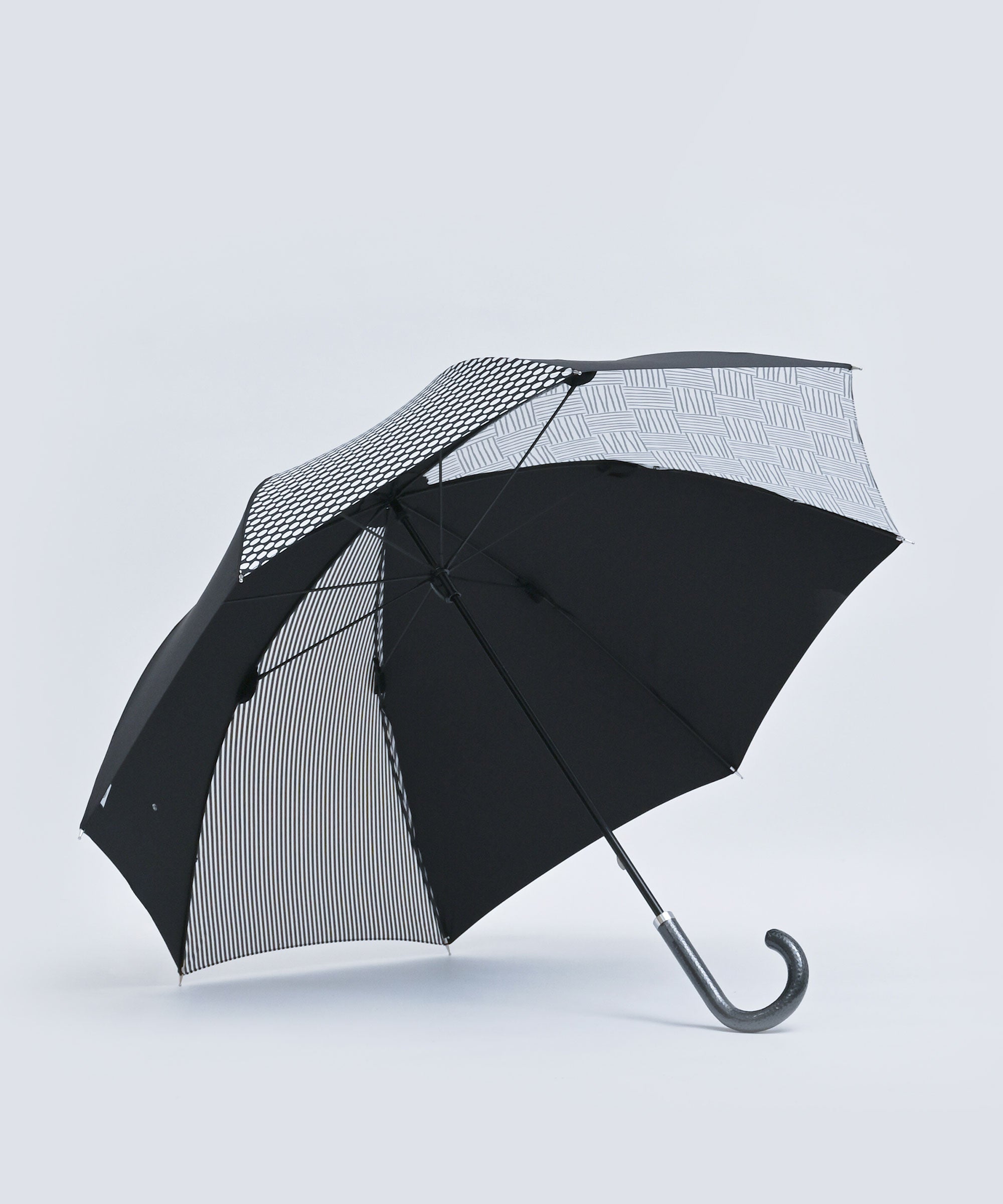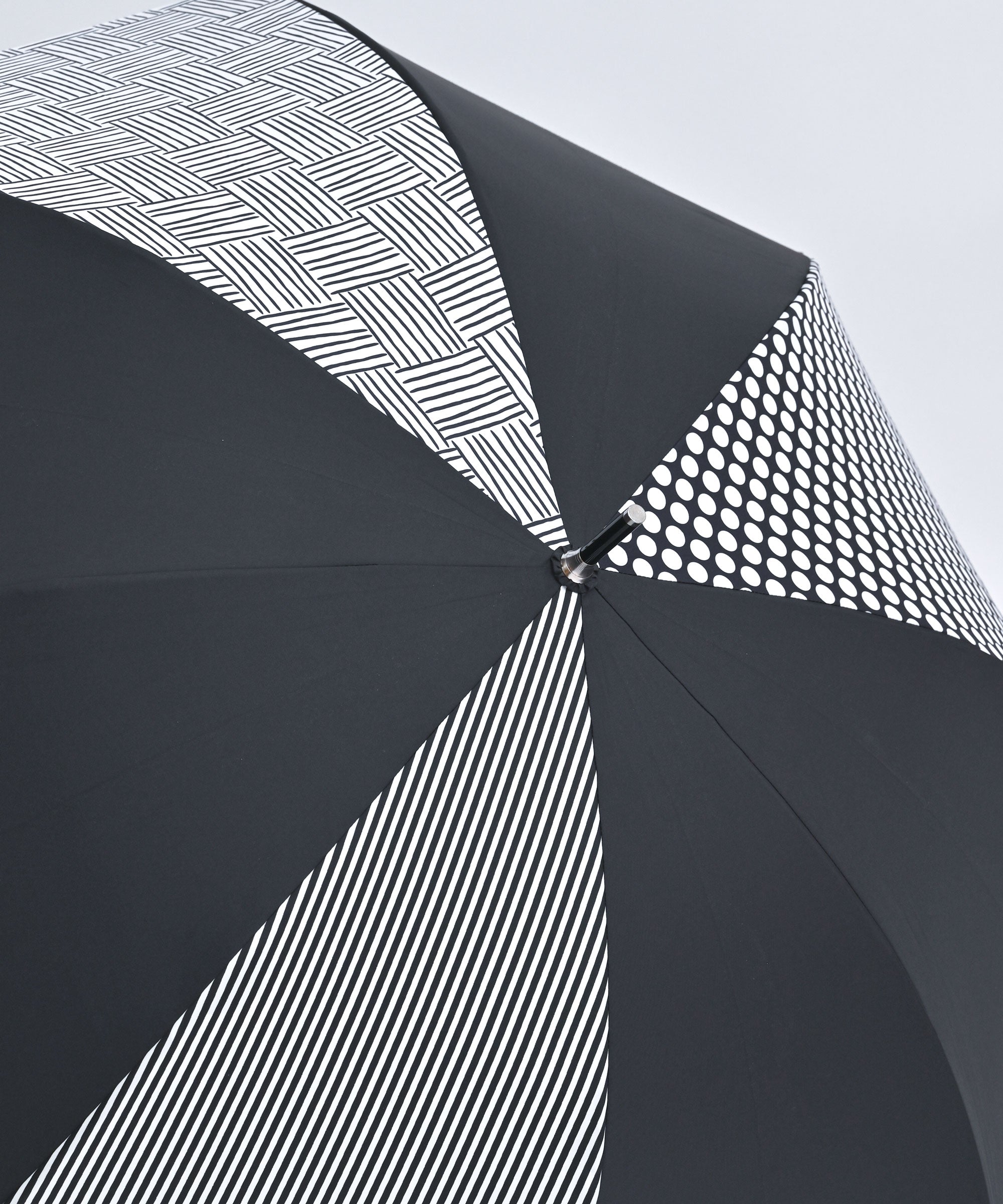 無地やチェックなどの生地をランダムに組み合わせたデザインの晴雨兼用傘。