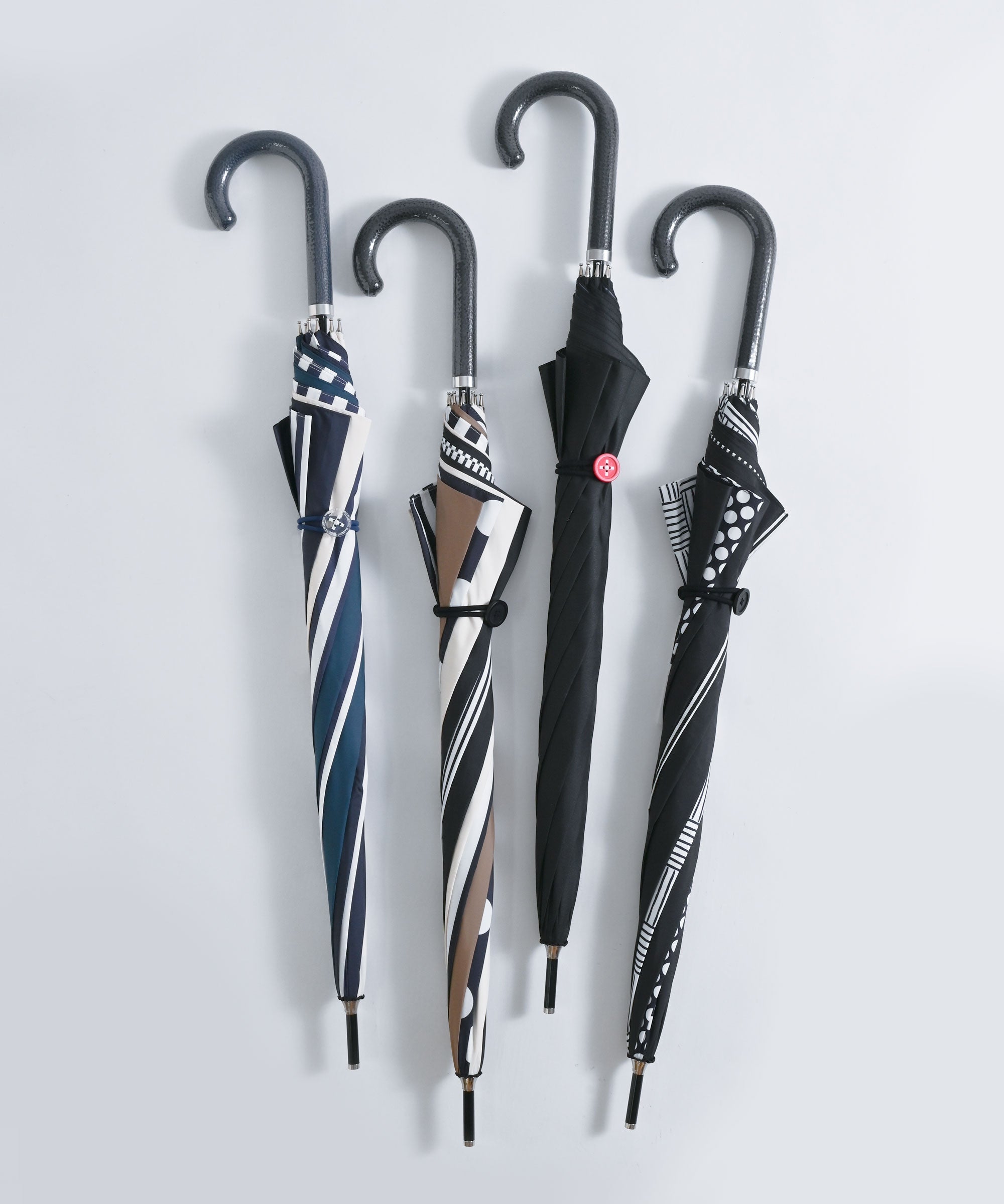 PLUSRINGと刻印されたボタンに、ゴムバンドのストラップを引っかける簡単仕様になっており、左右どちらから巻いても傘を束ねてしまうことができます。