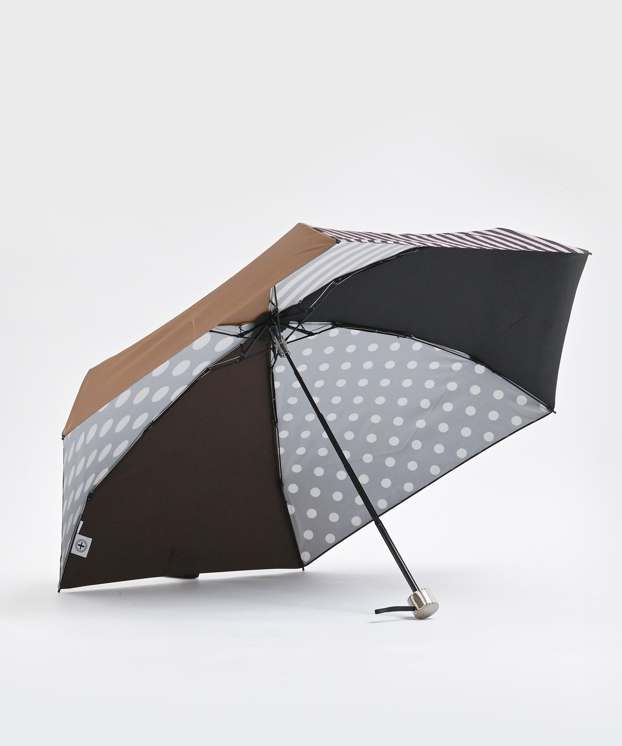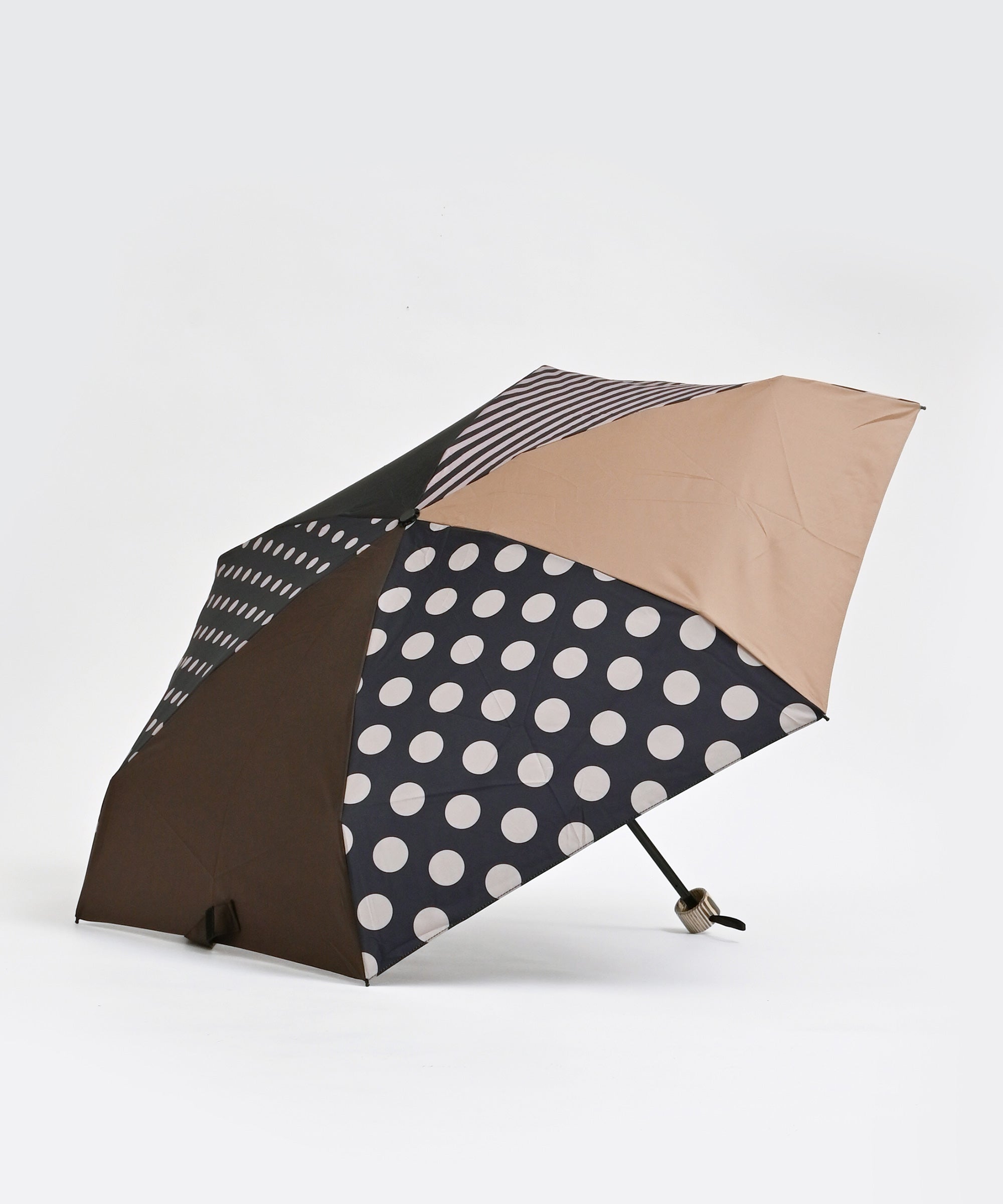無地やチェックなどの生地をランダムに組み合わせたデザインの晴雨兼用傘。