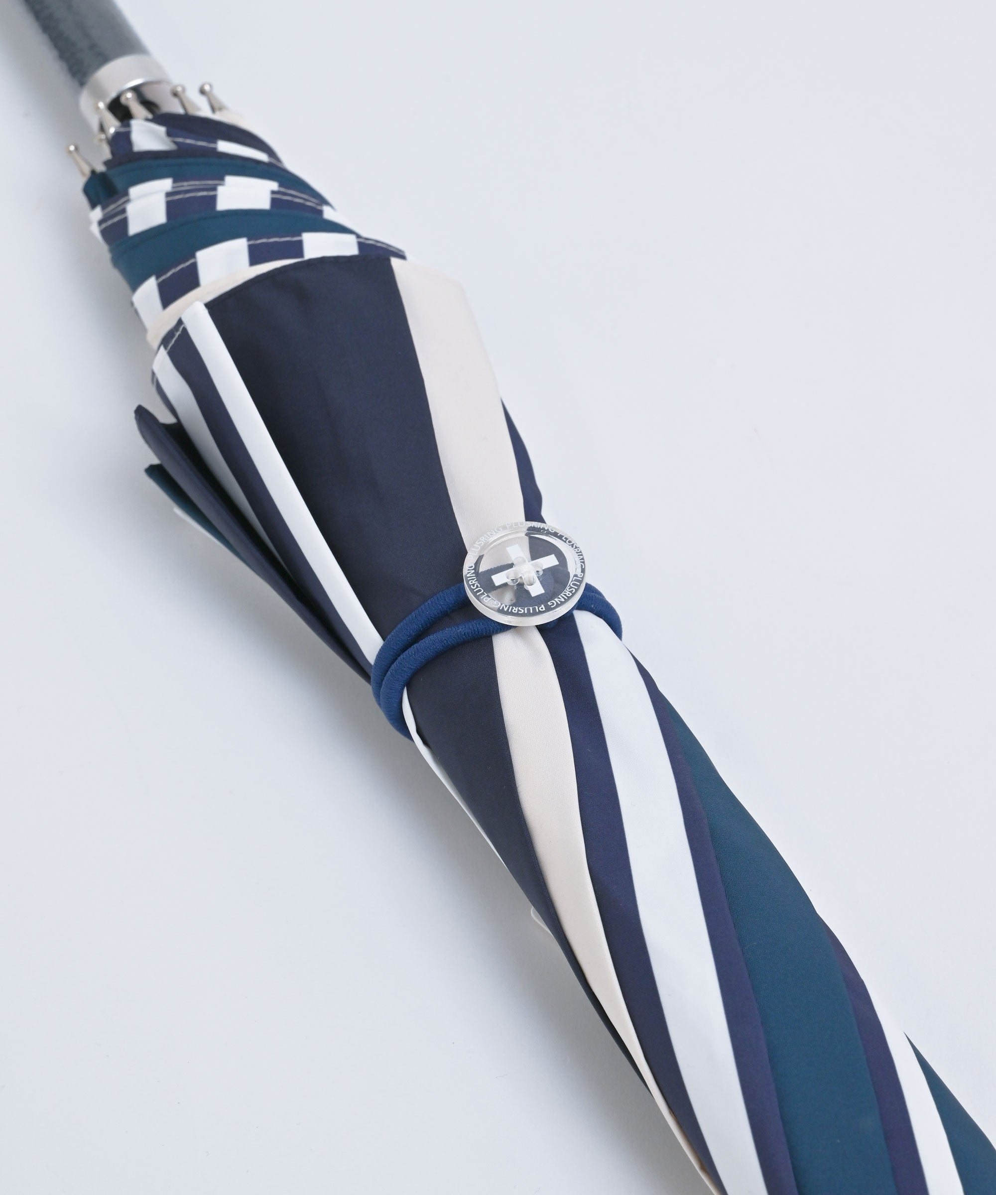PLUSRINGと刻印されたボタンに、ゴムバンドのストラップを引っかける簡単仕様になっており、左右どちらから巻いても傘を束ねてしまうことができます。