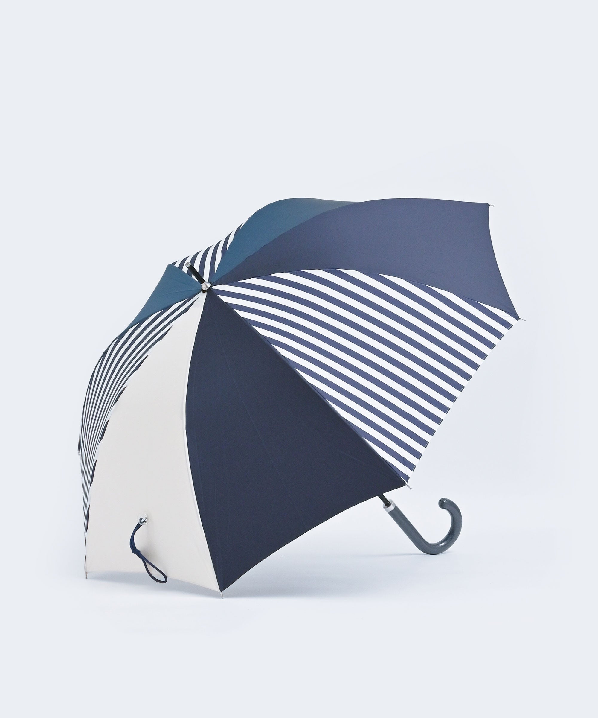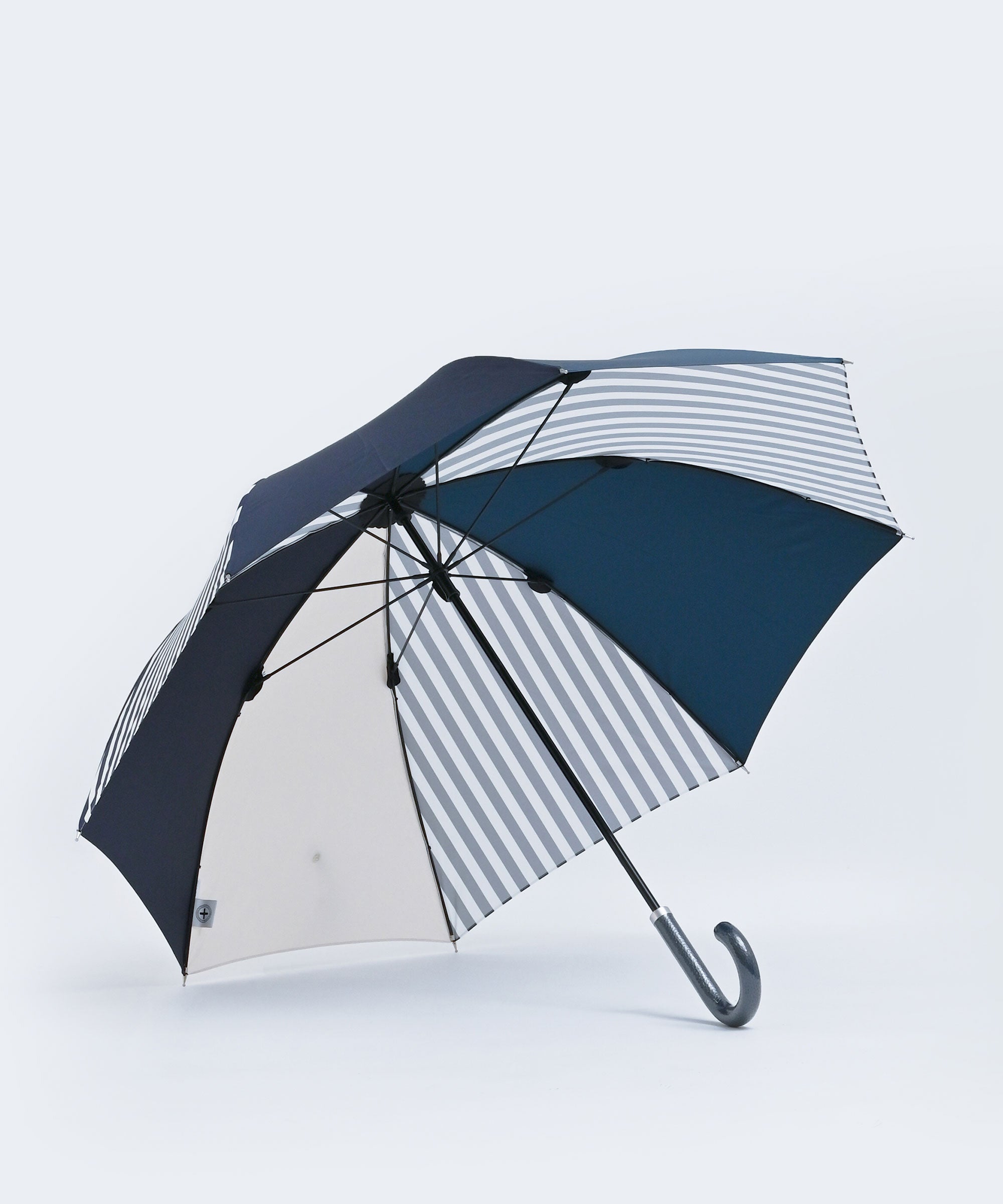 無地やチェックなどの生地をランダムに組み合わせたデザインの晴雨兼用傘。