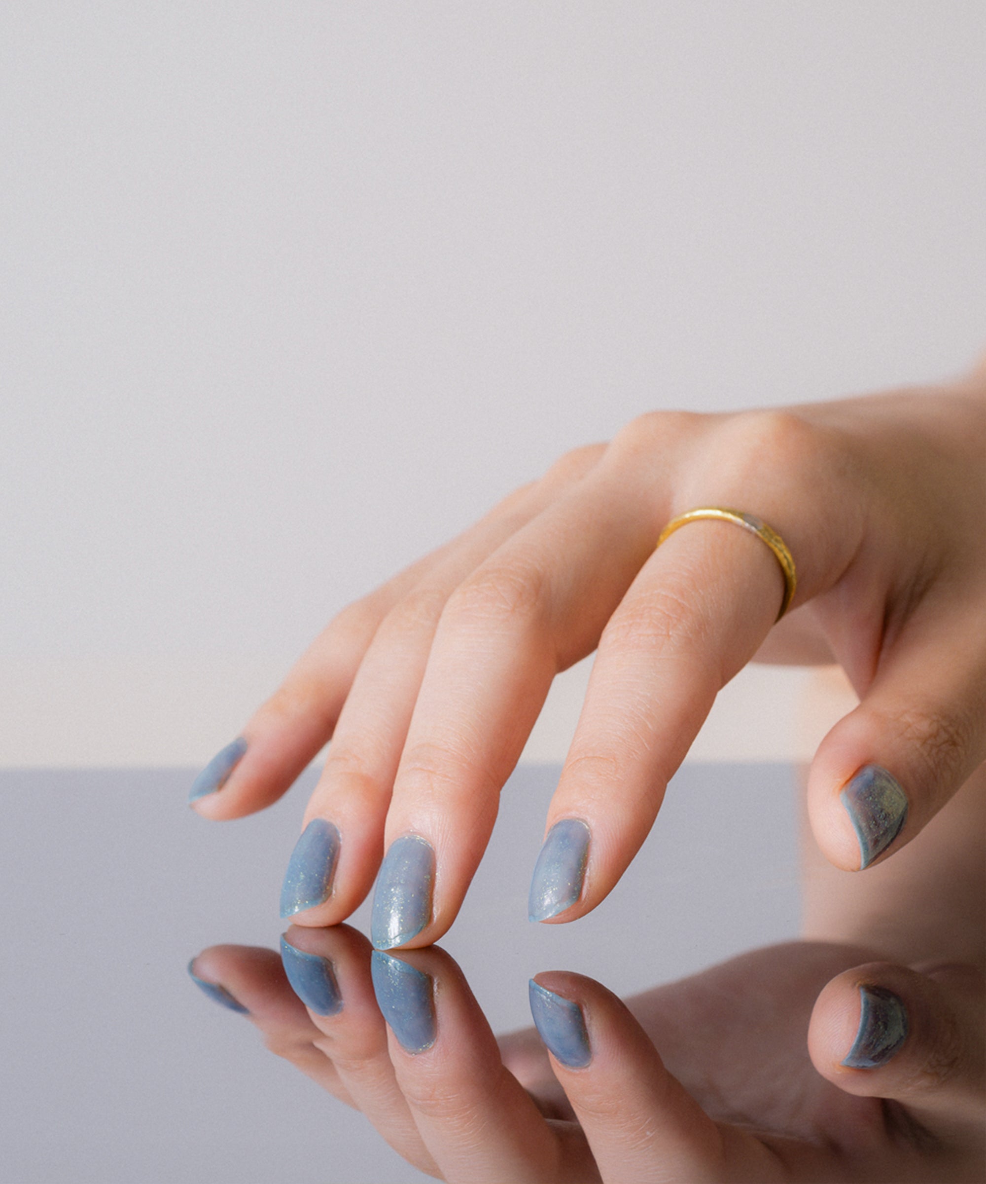 ゴールドのクラッシュパールをたっぷりと混ぜ合わせた、ノーブルな印象のアクアグレー。アンニュイなミルキーさと、輝きが透過するクリアさのバランスにこだわりました。