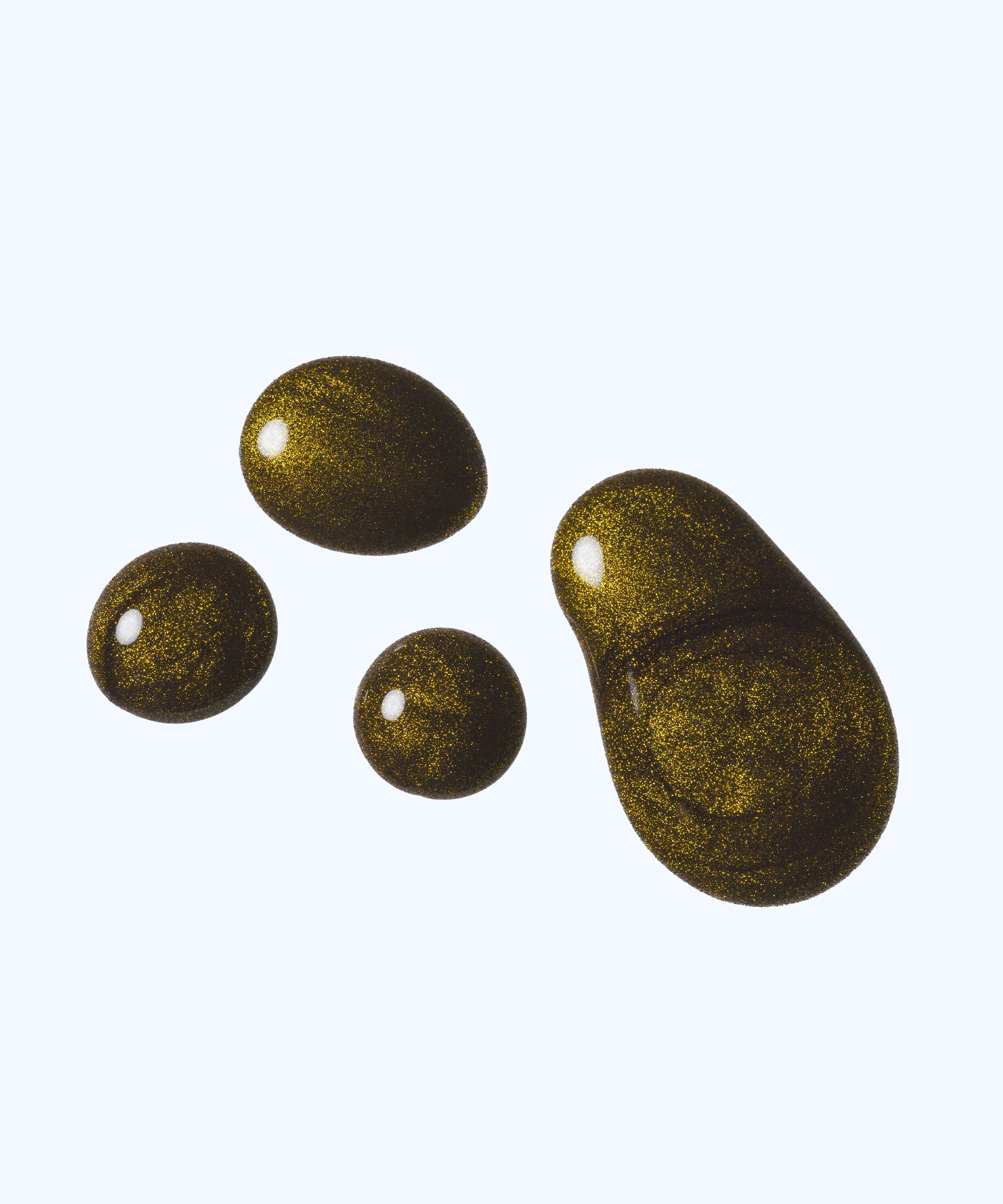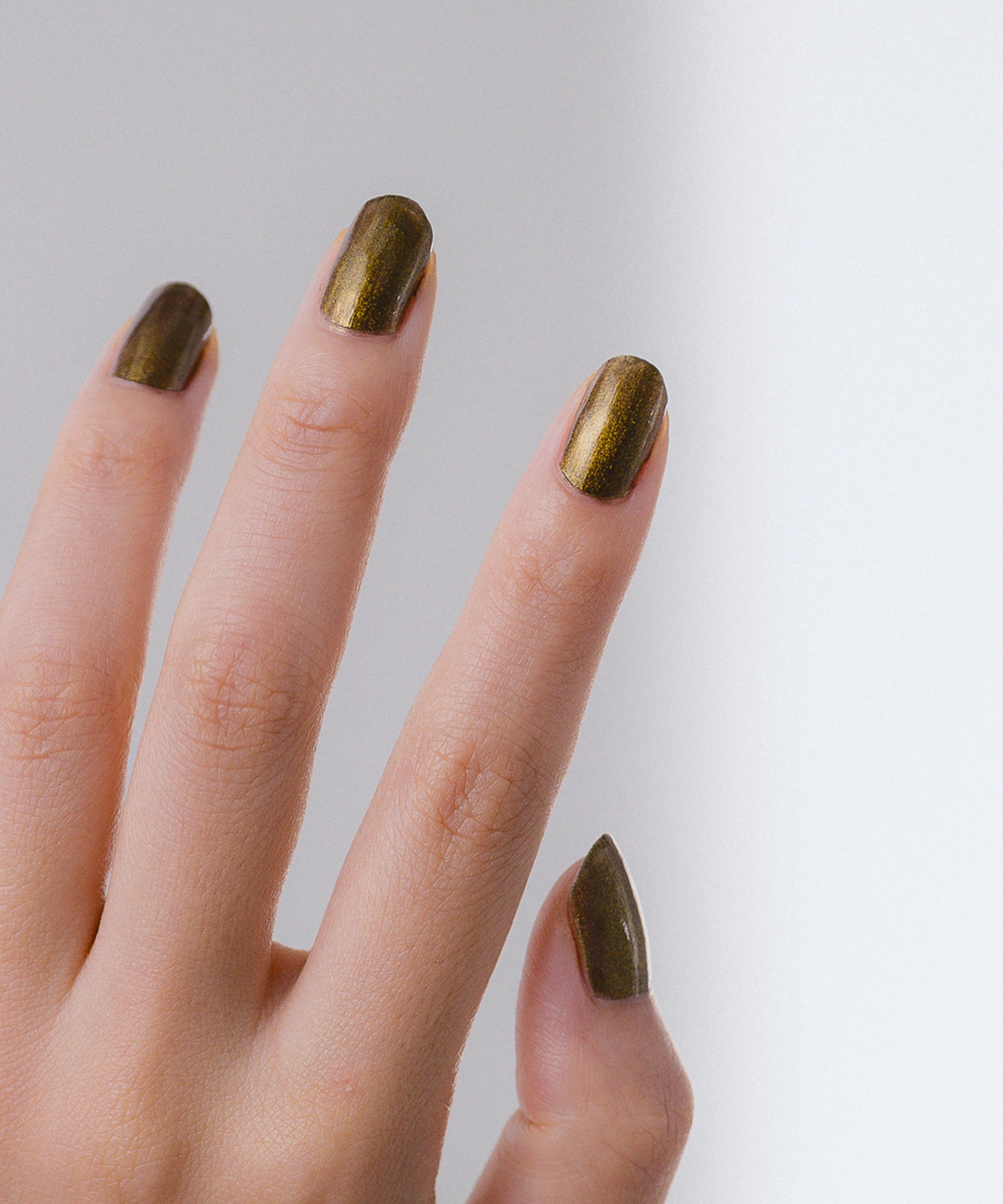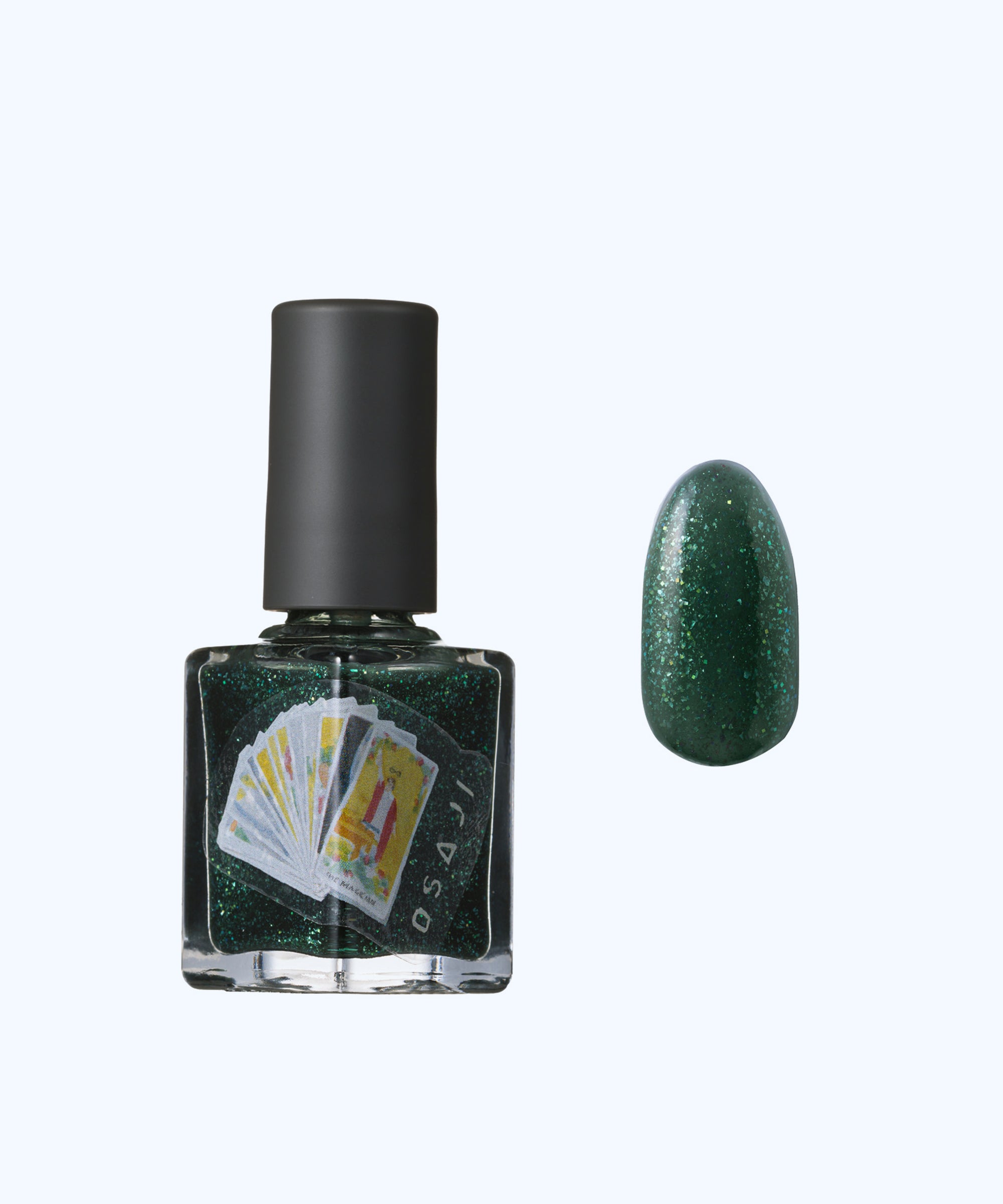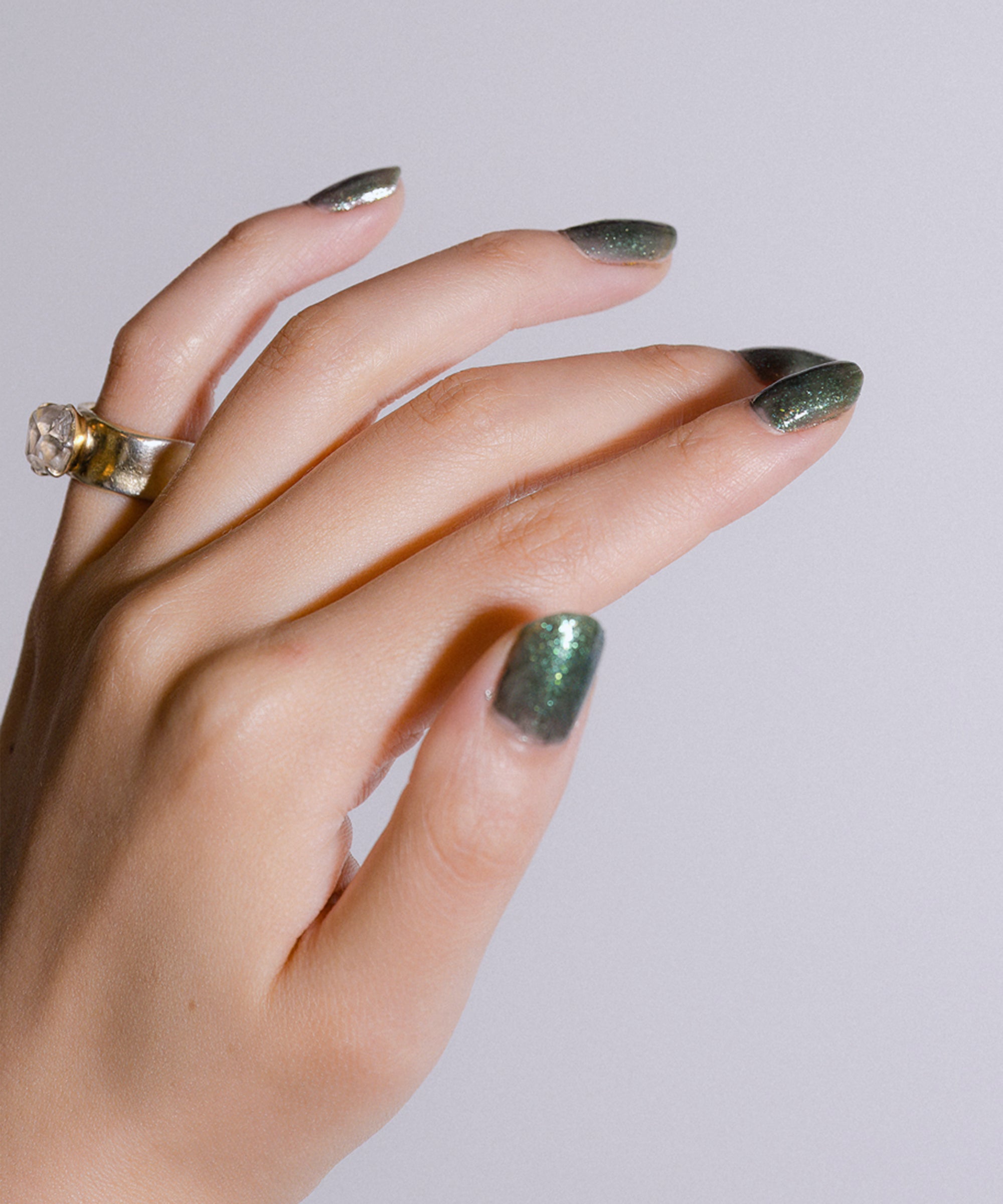 ゴールドとグリーンのホログラムをたっぷりとあしらったビリヤードグリーン。向こう側を透視できそうなクリアさと、深淵のような深さを併せ持つ、予兆に満ちた夜明け前の森のカラー。