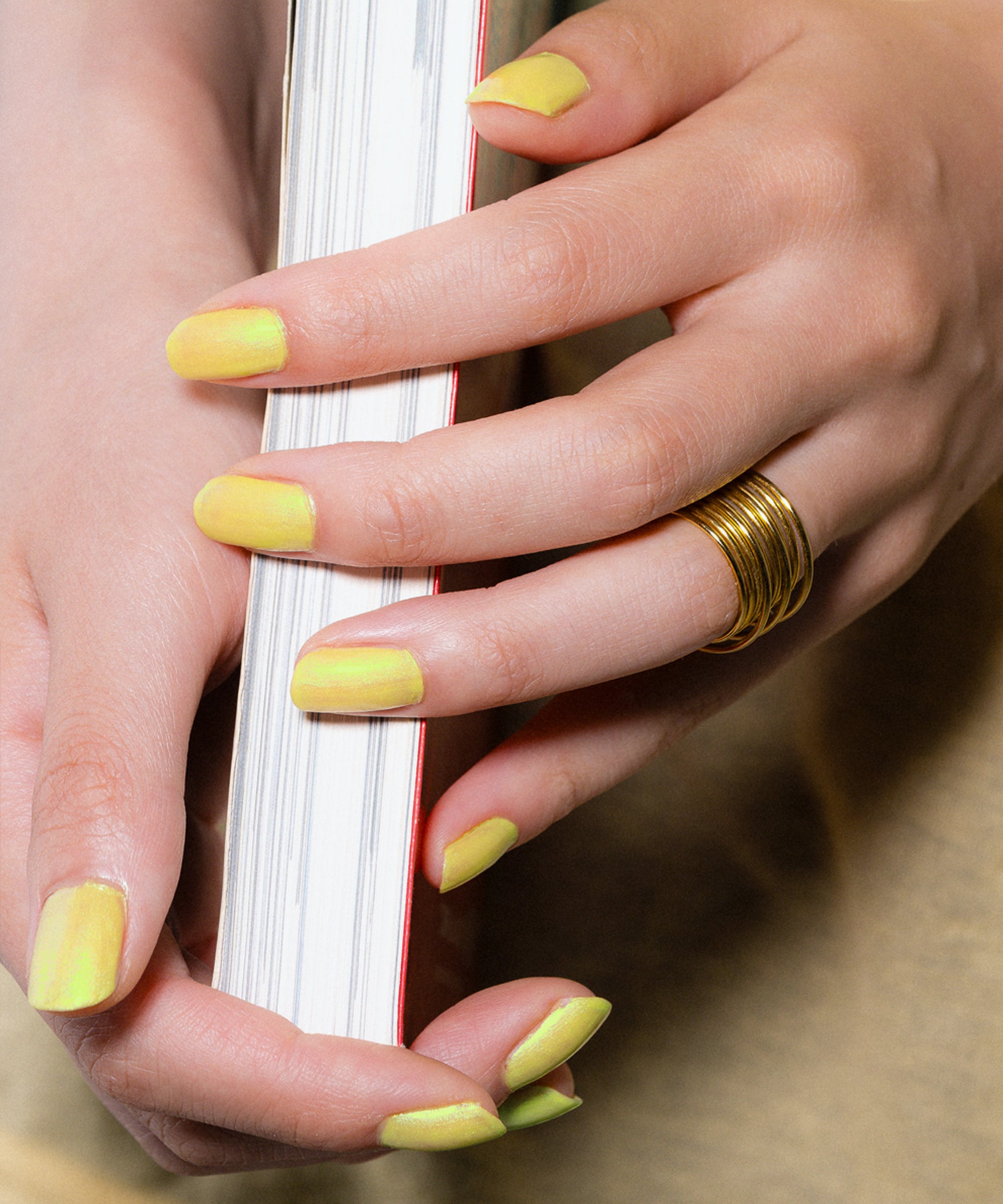 目の覚めるようなネオンイエローに、グリーンの偏光パールとゴールドのアクセントパールをブレンド。素晴らしい瞬間を記憶に焼き付けたいと願う、高揚感をイメージしたエネルギッシュなカラー。